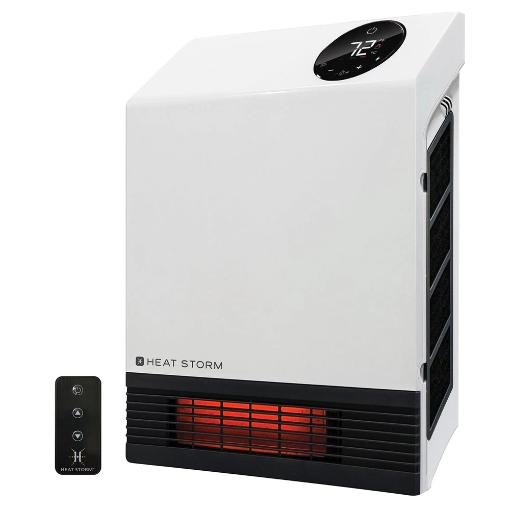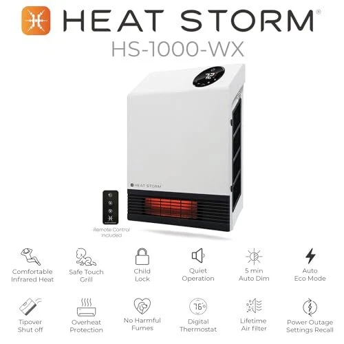Heating System: Forced Air BTU Heating Rating: 3100 UPC: 0689744872106 Color: Red, White Power: 1000 Type: Infrared Bulb Heater, Forced Air/Fan ISBN: 0854271005321 gtin13: 0854271005321 EAN: 0854271005321 Weight: 7.45 Pounds Smart Home Protocol: Infrared Features: Indoor Area Covered: 500 sq ft Control Style: Remote Control, Digital, Touch Model: HS-1000-WX Material: Plastic Package Dimensions LxWxH: 19.02x15.51x5.98 Inches Power Source: Electric Number of Heat Settings: 2 Mounting Location: Wall Size: Small Brand: Heat Storm Voltage: 120 V Item Width: 13 in MPN: HS-1000-WX