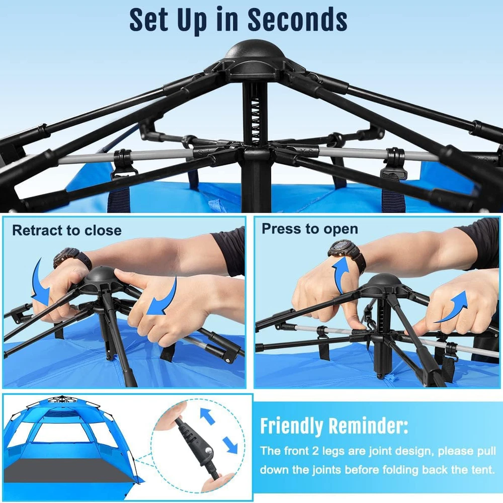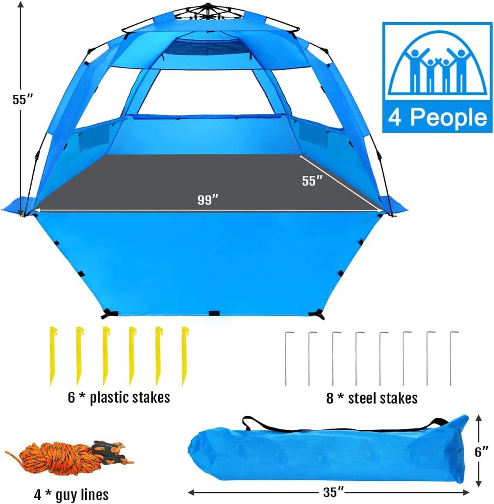Larger Space at a More Affordable Price - A size upgrade to 99"L x 55"W x 55"H, enough space for 2 adults plus 2 kids. Easy Set Up with Stability Accessories & Easy to Carry - Quick popping mechanism allows to set up in seconds! Includes 5 attached sandbags, 6 steel stakes, 6 sand stakes & tiedown strings to provide more stability; lightweight and easy to fold back with a compact carrying bag for easy transport and storage. Outdoor Protection & Great Ventilation - Premium 210t sun-proof material plus a special embedded silver-coated material to provide great UV protection from the sun and 3 added roll up openings maintain airflow to keep the tent cool when staying inside. Privacy Option - An extended front floor provides extra space for more activities and can be closed with adhesive Velcro straps when private moment protection is needed, such as breastfeeding or clothes changing. 's Customer Friendly Service is Always There for You - If you need help of any kind with your beach tent, please don't hesitate to contact us; we are always striving for continuous improvement and that cannot be done without your support.