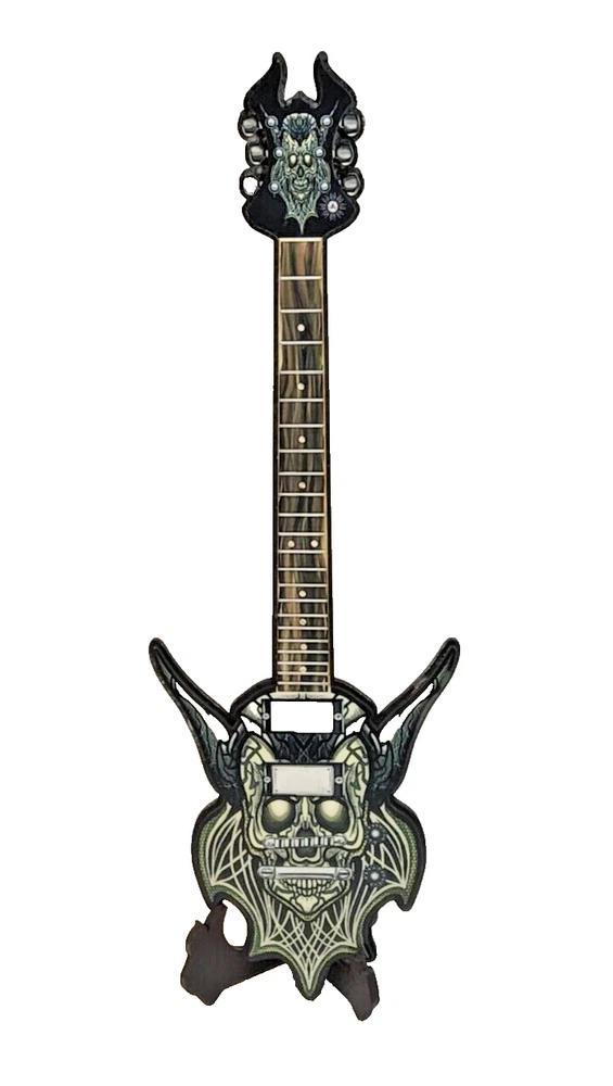 ***Treasure Suite offers you many pieces of my art prints now*** ###This section is for large sized laser cut art guitars,cellos,etc. Approximate measurements are 17"hx6"wx.25"d. ### Demon skull shaped wicked art guitar. Perfect for that dungeon, spot above register in bar,or your home. Welcome to my unique collection of digital art, where creativity meets craftsmanship! Each piece in this category features my original designs, heat pressed into vibrant sublimation prints on laser cut wood or polyester canvas material. These art pieces are not just decorations, they are collectibles that bring a touch of gothic, rock and roll, horror, pin-up, and lowbrow art into your space. Explore an array of striking designs on my mini guitars to other stringed instrument laser cut art pieces, available in 2 sizes and complete with custom laser cut foldable stands that I personally designed. These pieces are perfect for adding a distinctive edge to your home or office, and they make fantastic gifts for art enthusiasts and collectors alike. Looking for something truly one-of-a-kind? I may accept custom orders to bring your unique vision to life. Dive into a world of bold, expressive art that stands out and speaks to the rebel in all of us!