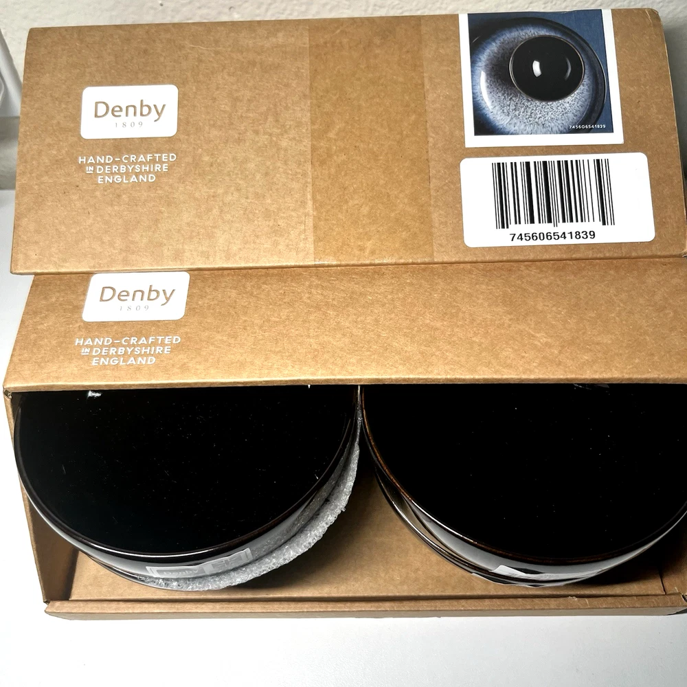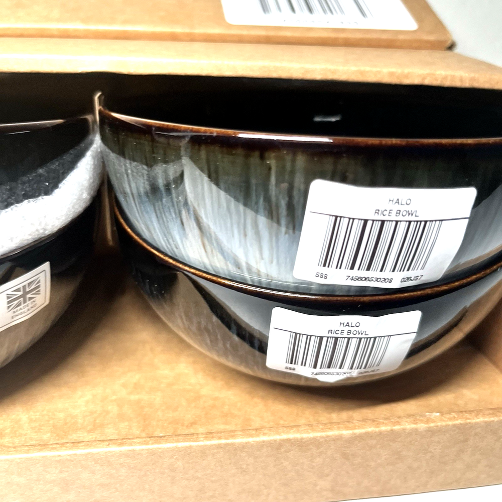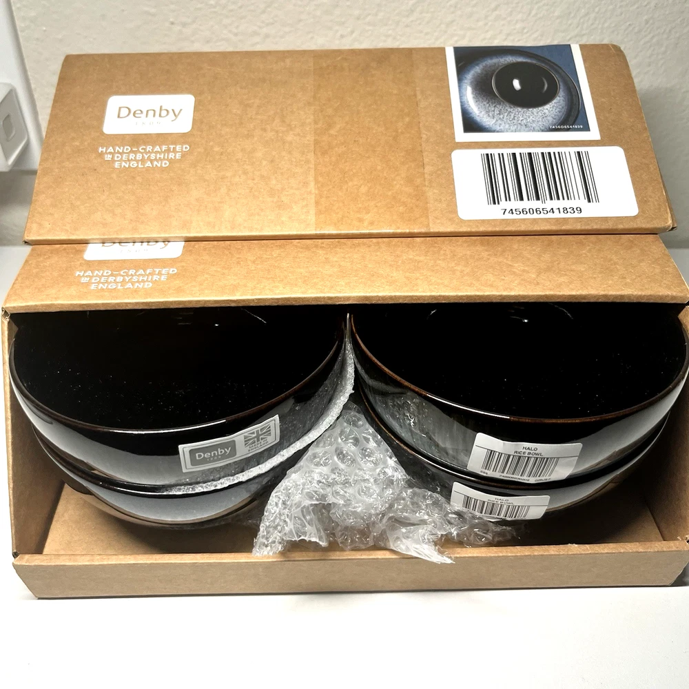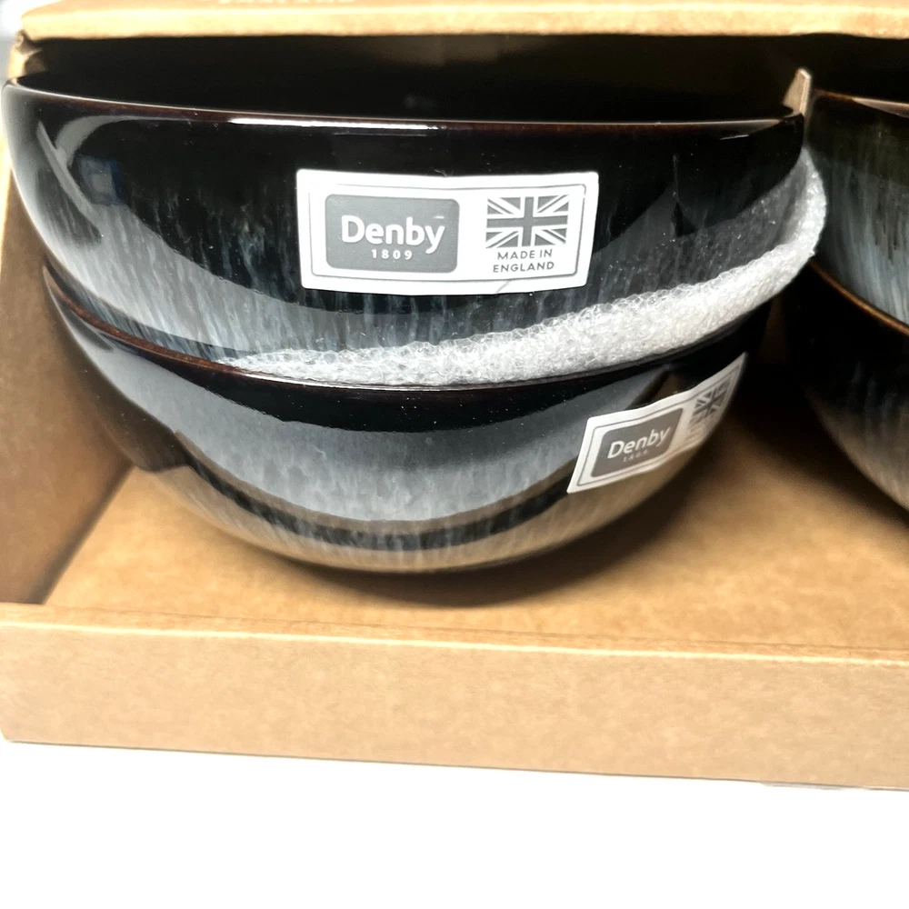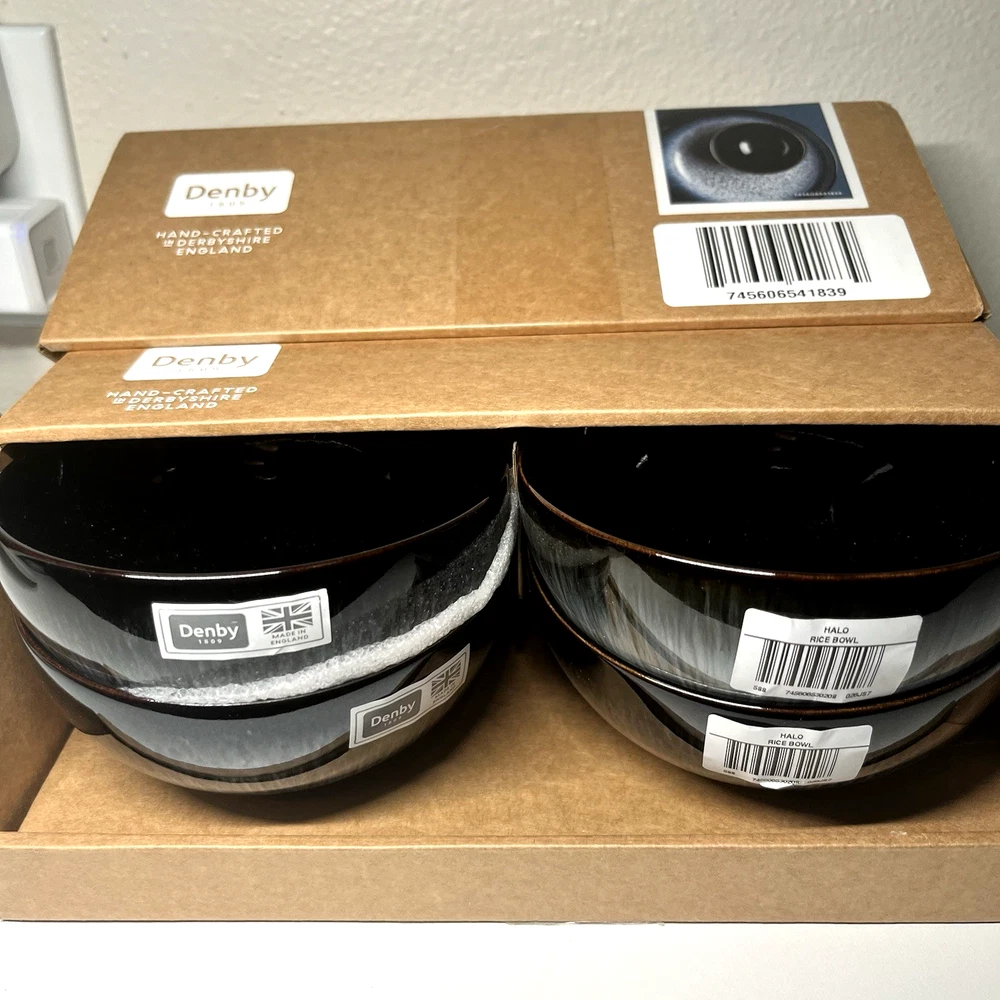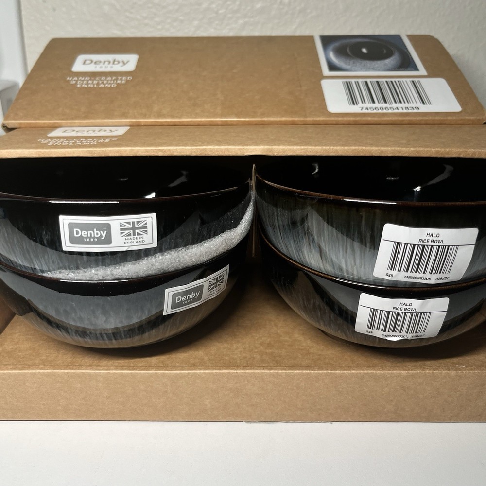 Denby Halo Rice Bowls – Set of 4 (Grey / Charcoal Reactive Glaze) Made in England Elevate your table with this Denby Halo rice bowls set , handcrafted in England and finished with the collection’s signature two-tone reactive glaze . Each bowl features a striking blend of grey and charcoal tones with a natural speckled finish, making every piece beautifully unique. Key Details Brand: Denby Collection: Halo Type: Rice Bowls Quantity: Set of 4 Color: Grey / Charcoal (reactive speckled glaze) Material: Premium stoneware Country of Origin: Made in England 🇬🇧 Finish: Handcrafted two-tone glaze (natural variation expected) Condition New with box. All four bowls are brand new, unused, clean, and free from defects. Why Choose Denby Halo Produced in Denby Pottery, England , the Halo range is known for its modern aesthetic, artisanal finish, and exceptional durability. Designed for everyday use while offering a refined, contemporary look for entertaining. What’s Included 4 × Denby Halo Rice Bowls Original box Shipping & Returns Carefully packaged to ensure safe delivery. Ships within same business day. Returns accepted per eBay policy.