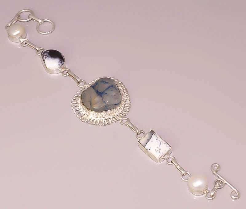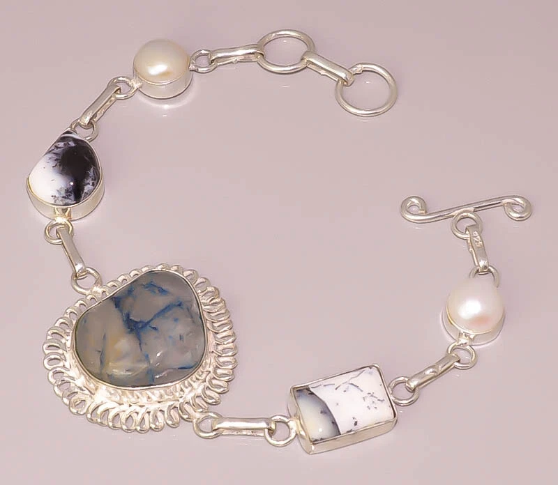 Dendrite Opal Fresh River Pearl 925 STERLING SILVER PLATED BRACELET Main Colour White Style Chain Metal Silver Plated Material Stone Country/Region of Manufacture India Metal Purity Not Applicable Theme Beauty Main Stone Dendrite Opal Main Stone Creation Natural Main Stone Treatment Not Enhanced Base Metal Alloy Brand Unbranded Color White Length (inches) 8" Secondary Stone Pearl Clasp Type Toggle