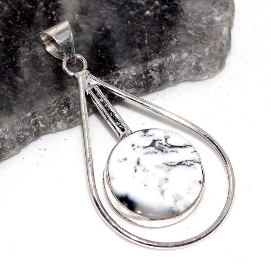 Dendritic Opal 925 Silver Plated Gemstone Pendant 2.4" Aesthetic Jewellery JW