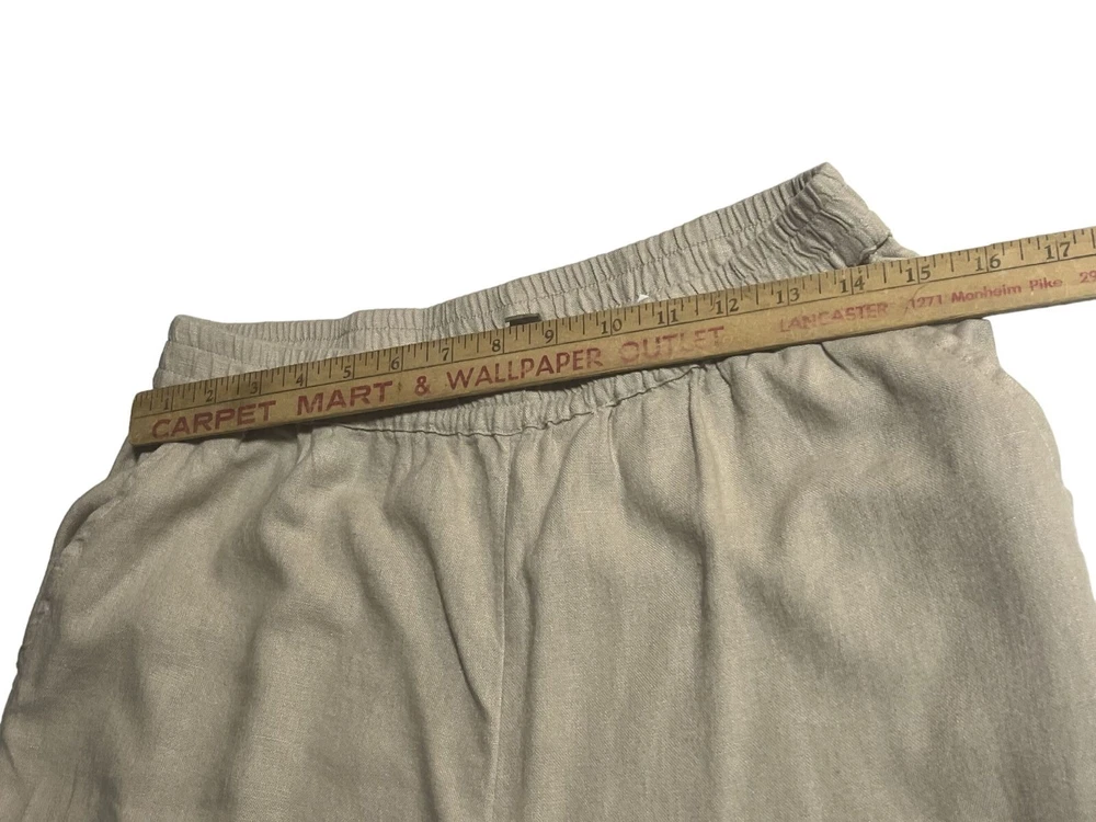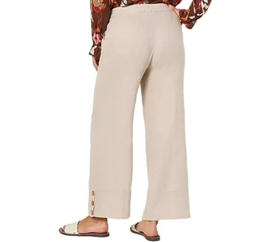 Fabrication: woven Features: side buttons at hem, elastic waistband, side pocket Rise: slightly below the waist Fit: semi-fitted; follows the lines of the body with added wearing ease Leg Shape: wide leg; widens fashionably from thigh to leg opening Inseam: missy/plus inseam 28" Content: 55% linen/45% viscose Care: machine wash, tumble dry Imported Features: • Side Button Ankle Size: Womens XS Condition: New Without Tags
