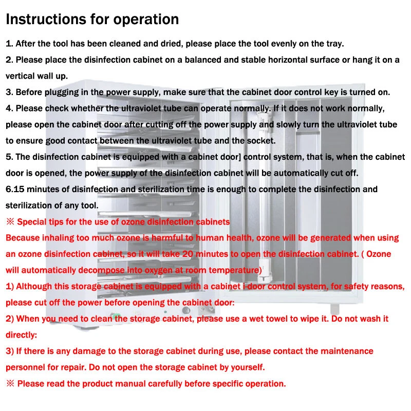 Store Categories Store Categories Sports & Outdoor Lifestyle Tools Motors Electric Dolls Other Product Description Description: 1.This tabletop UV sterilizer cabinet Can be used to sterilize brushes, combs, Dry towels(wet towel can't), manicure and pedicure implements, surgical equipment, scissors.etc and Suitable for various scenarios, hospitals, dental clinics, beauty salons, pedicure and nail shops, household disinfection, etc 2.Built-in UV lamp(ultraviolet light) to sterilize different types of tools, Effectively clean your utensils and sterilize them for complete effectiveness. 3.Humanized design with timing function. 4.It's not suitable for liquid sterilization.Disinfection items need to be in a dry state and cannot be wet. 5.UV+ozone dual effect, more thorough dual disinfection. Feature: Size:31*23*48cm(9*12.2*18.9inch) Voltage:220V/110V Capacity:27L Package include: 1 X UV Sterilizer Cabinet With 10Pcs Trays (If you want to extra more Trays,pls connect with us,thank you) Instructions for operation: 1. After the tool has been cleaned and dried, please place the tool evenly on the tray. 2. Please place the disinfection cabinet on a balanced and stable horizontal surface or hang it on a vertical wall. 3. Before plugging in the power supply, make sure that the cabinet door control key is turned on. 4. Please check whether the ultraviolet tube can operate normally. If it does not work normally, please open the cabinet door after cutting off the power supply and slowly turn the ultraviolet tube to ensure good contact between the ultraviolet tube and the socket. 5. The disinfection cabinet is equipped with a cabinet door] control system, that is, when the cabinet door is opened, the power supply of the disinfection cabinet will be automatically cut off. 6.15 minutes of disinfection and sterilization time is enough to complete the disinfection and sterilization of any tool. ※ Special tips for the use of ozone disinfection cabinets Because inhaling too much ozone is harmful to human health, ozone will be generated when using an ozone disinfection cabinet, So we need to open the disinfection cabinet after 20 minutes after the disinfection is completed. ( Ozone will automatically decompose into oxygen at room temperature) 1) Although this storage cabinet is equipped with a cabinet door control system, for safety reasons, please cut off the power before opening the cabinet door: 2) When you need to clean the storage cabinet, please use a wet towel to wipe it. Do not wash it directly: 3) If there is any damage to the storage cabinet during use, please contact the maintenance personnel for repair. Do not open the storage cabinet by yourself. ※ Please read the product manual carefully before specific operation. Note: -Please allow slightly errors due to manual measurement and different monitors. Payment Policy Shipping Policy Returns Policy About Us Contact Us Payment Policy 1. We accept PayPal only. 2. All major credit cards are accepted through secure payment processor PayPal. 3. Payment must be received within 7 business days of auction closing. 4. If you have bought multiple items from me, you can send me one payment for all the items instead of paying for them individually. When you click the Pay Now button, eBay will automatically determine if there are other items you have won or purchased from me and will combine them for your review. 5. NOTE: Import duties, taxes and chargers are not included in the item price or shipping charges. These charges are the buyer's responsibility. Please check with your country's customs office to determine what these additional costs will be prior to bidding buying. Shipping Policy 1. We Ship to Worldwide. 2. Items will be shipped within 7-14 business day on payment received. 3. Item are shipped from Shenzhen using Airmail, reach most of the countries within 10 to 35. 4. Delivery time depends on destination and other factors, it may takes up to 40 business days. 5. We are not responsible for undeliverable address, we reserve the right to charge the shipping fee again for returned items due to wrong address. 6. If you do not receive your item by 30 business days, Please feel free to contact us via ebay mail system, we will try our best to resolve any problems with you. Returns Policy 1. You have 7 day to contact us and 10 days to return it from the date it was received. If this item is in your possession more than 7 days, it is considered used and WE WILL NOT ISSUE YOU A REFUND OR REPLACEMENT.There are NO EXCEPTIONS! 2. All Returned items Must Be in the original packaging and you MUST PROVIDE us with the shipping tracking number, specific reason for the return,and your ebay ID. 3. We will refund YOUR FULL WINNING BID AMOUNT, upon receipt of the item in its original condition and packaging with all components and accessories included, AFTER BOTH Buyer and Seller cancel the transaction form ebay.OR, you may choose to have a replacement. 4. Return shipping is to be paid by the Buyer. About Us 1. We strive for our customer satisfaction at best possible. If you have any questions, please feel free to email our service specialists 24 Hours a Day, 7 Days a week. We will reply you ASAP. If no response within 24 Hours, please check the spam in your mail box. 2. We greatly appreciate your POSITIVE feedback. Please do NOT leave negative feedback without asking for help. Our aim is to provide Top Level Customer Service, normally so we will try our best to solve any problem you have. 3. Please DON'T leave negative or neutral feedback if you haven't received item in 30 days, because we have mentioned the shipping time repeatedly. Contact Us Our customer-oriented service strives for positive feedbacks with all 5 star selling ratings . Please feel free to contact us via eBay message once you have any question before you giving us negative feedback or open case. Business time: GMT8 (9:00-18:00) from Monday to Friday Copyright © 2023 Dianxiaomi