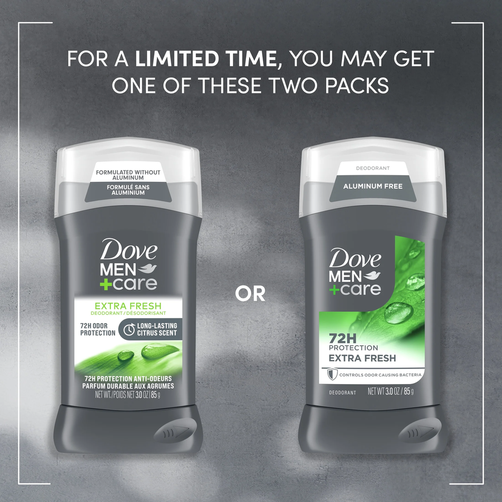 Dove Men+Care Deodorant Stick for Men Extra Fresh Aluminum Free with Moisturizing Cream, 3 oz. Dove Men+Care Extra Fresh Deodorant formula is aluminum free. Dove Men+Care Extra Fresh Deodorant gives you powerful 72h odor protection while caring for your skin. This Dove mens deodorant is formulated with Moisturizing Cream to help retain skin moisture for comfortable underarms. Enjoy the reinvigorating, and long-lasting citrus scent of Bergamot, Lavender, and Sandalwood in our Extra Fresh aluminum free deodorant so you can feel fresh and confident all day. Apply this deodorant stick on your underarms to protect them from odor, for lasting confidence around the clock. Each Dove Men+Care deodorant stick can be recycled. Follow the How2Recycle instructions on the back. Looking for more Dove Men+Care skin care products? For adult use. Dove Men+Care Deodorant Stick for Men Extra Fresh Aluminum Free with Moisturizing Cream, 3 oz ALUMINUM FREE FORMULA: Dove Men+Care Extra Fresh Deodorant formula is aluminum free. 72H UNCOMPROMISING PROTECTION: Dove Men+Care Extra Fresh Deodorant for men gives you powerful 72h odor protection while caring for your skin. NON-IRRITANT FORMULA: This Dove mens deodorant is formulated with Moisturizing Cream to help retain skin moisture for comfortable underarms. LONG LASTING FRAGRANCE: Enjoy the reinvigorating, long-lasting citrus scent of Bergamot, Lavender, and Sandalwood in our aluminum free deodorant, so you can feel fresh and confident all day. HOW TO USE: Apply this deodorant stick on your underarms to protect them from odor, for lasting confidence around the clock. CARE FOR THE PLANET: Each Dove Men+Care deodorant stick can be recycled. Follow the How2Recycle instructions on the back. Dove Men+Care deodorants are PETA-certified Cruelty Free. For adult use. Ingredients Dipropylene Glycol, Water (Aqua), Propylene Glycol, Sodium Stearate, Poloxamine 1307, Fragrance (Parfum), Glycerin, Stearic Acid, Simethicone, Citronellol, Hexyl Cinnamal, Limonene, Linalool, Disodium Edta, BAHT./div>