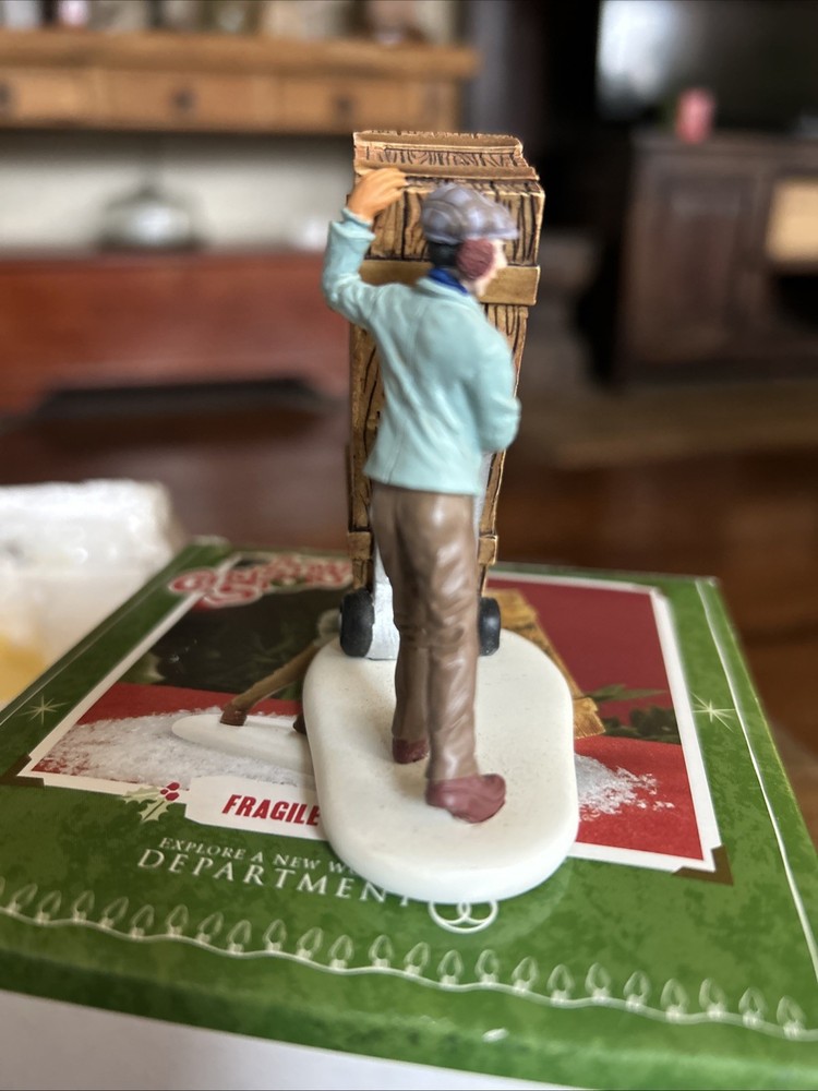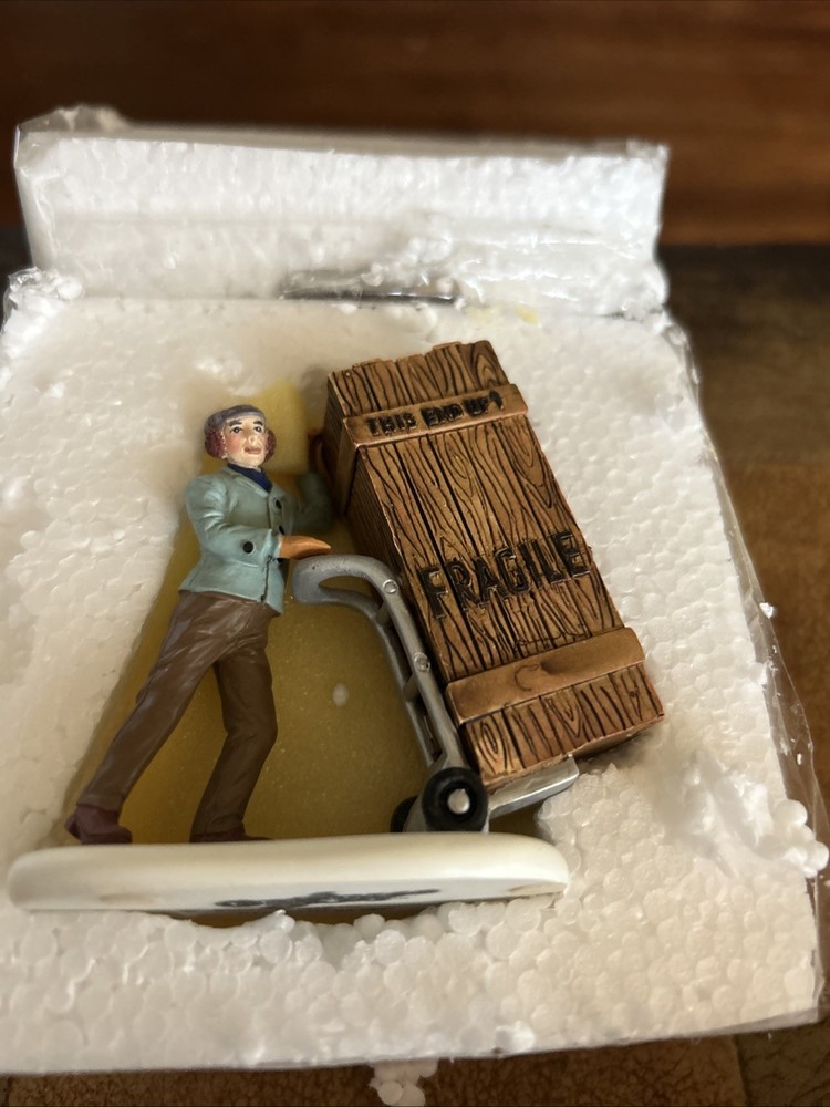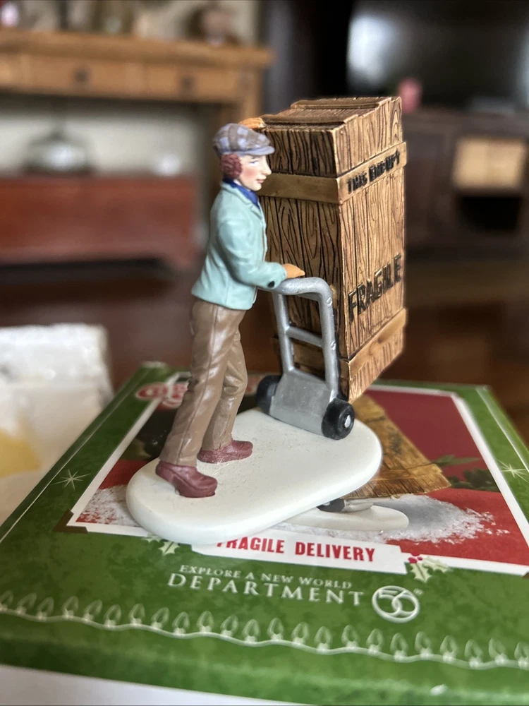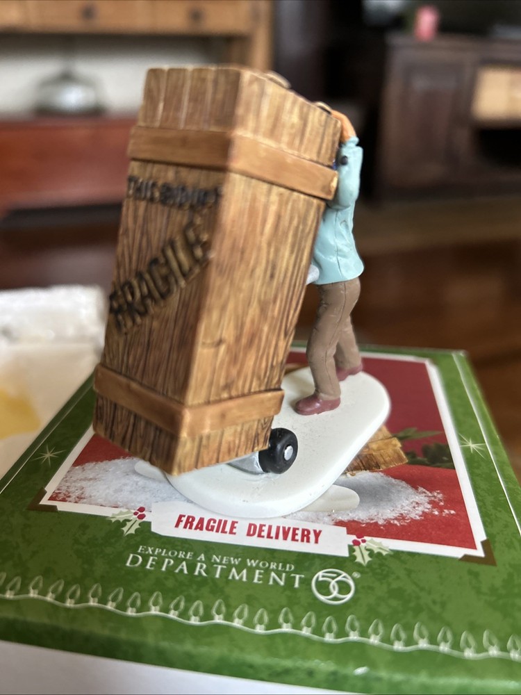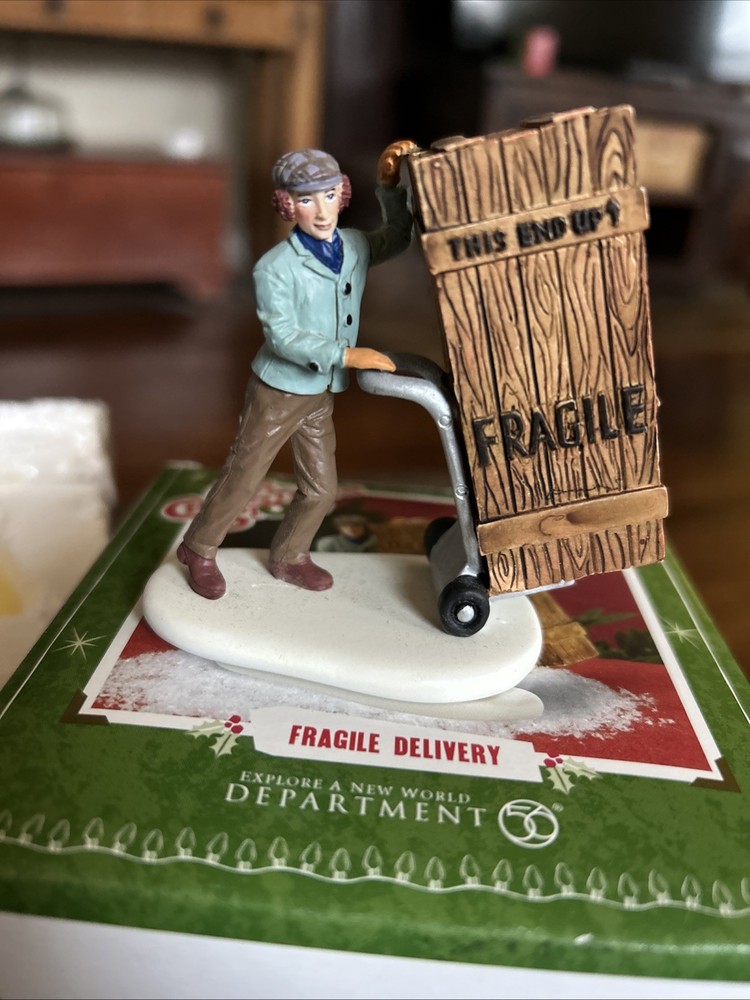 The Department 56 A Christmas Story Village Fragile Delivery Figurine with Box is a collectible Christmas village piece from the Snow Village collection. This hand-painted, asymmetrical figurine depicts a fragile delivery scene, perfect for adding a touch of Americana to any room during the holiday season. Manufactured in 2011, this retired piece comes in its original box, making it a nostalgic addition to any Christmas decor collection. Made of resin, ceramic, and porcelain, this figurine captures the essence of seasonal villages with its multicolor painted finish and detailed craftsmanship.