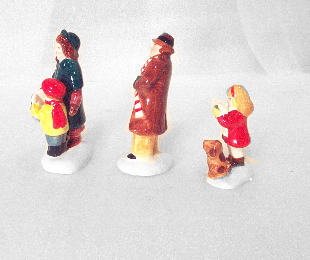 Vintage Department 56 Christmas Village Set of 3 Carolers. #5105-5. Featured are a caroling family: Mother and son (3 ½”); Father holding small child (3 5/8”) and Girl with dog (2 ½”). Please Note: There is some unevenness to paint from the manufacturing process to bottom of the girl the father is holding and paint is missing to the side of the boy’s face, also from the manufacturing process. Items come in their original box, but please note there is a large discoloration mark on box. Item is being offered, “As is”. PLEASE NOTE: Please forgive the Lighting. I do my best to describe the item as well as possible. In the event item does not arrive to you as described, Please contact me before leaving a Feedback. --------------------------- Buyer pays Actual Shipping plus $0.60 Packaging Fee. Sorry, No Local Pickups. Shipping weight approximately 0 pounds 10 ounces. All communications must be in English. Items are packaged prior to Listing, Therefore No Combined Shipping. --------------------------- If I do not receive a response from the winning bidder after one week, the item will be re-listed. Please contract us if you have any questions. Thank you for your consideration. THDZZ 24125 9x8x5 C1992