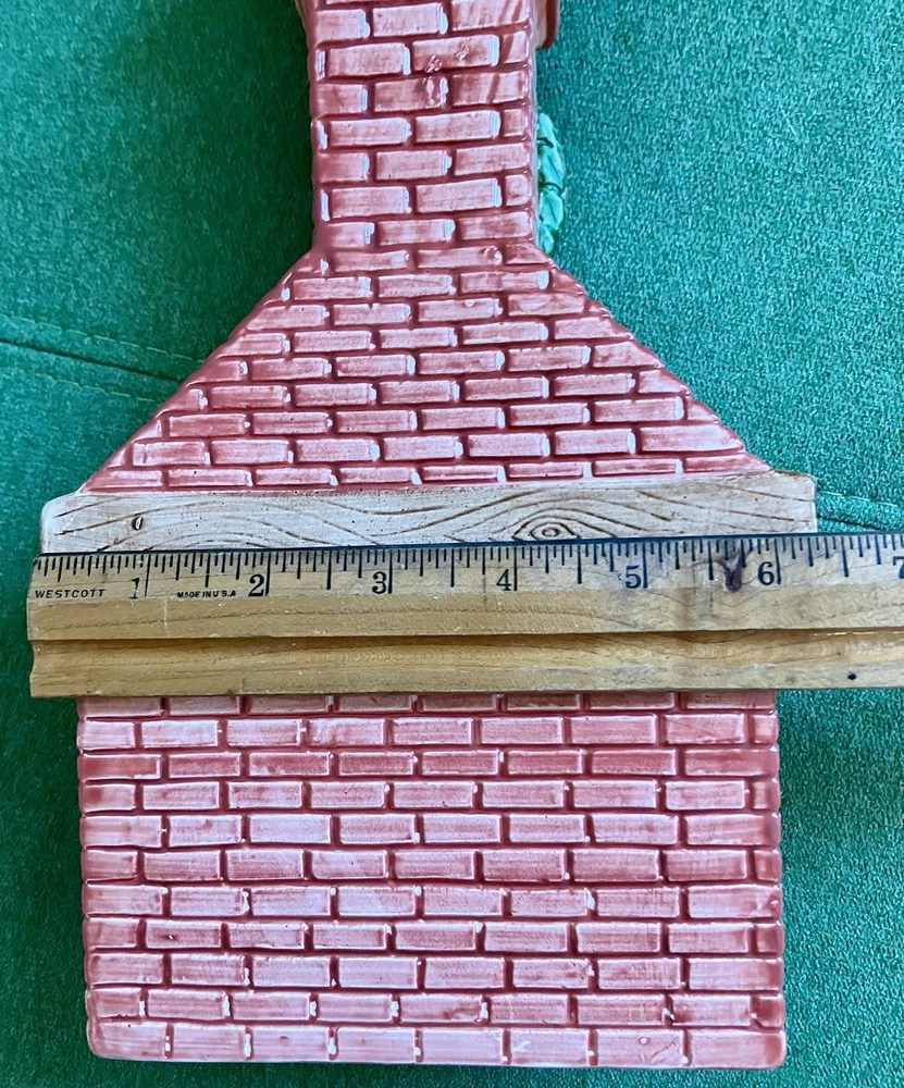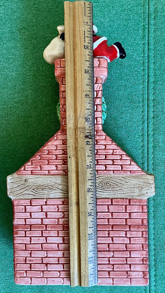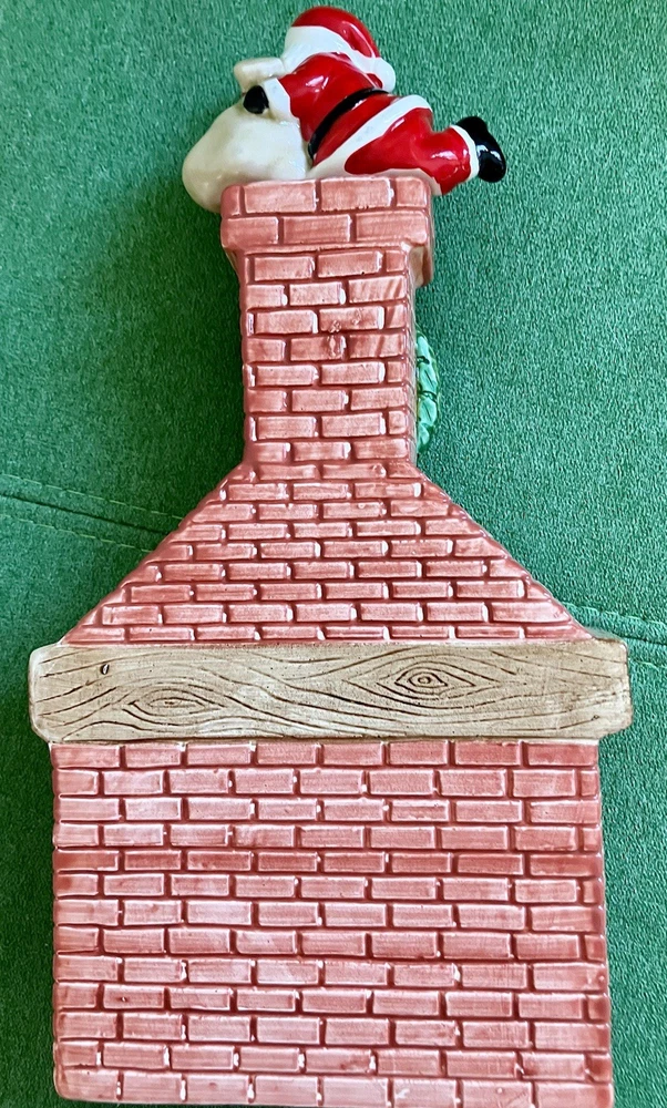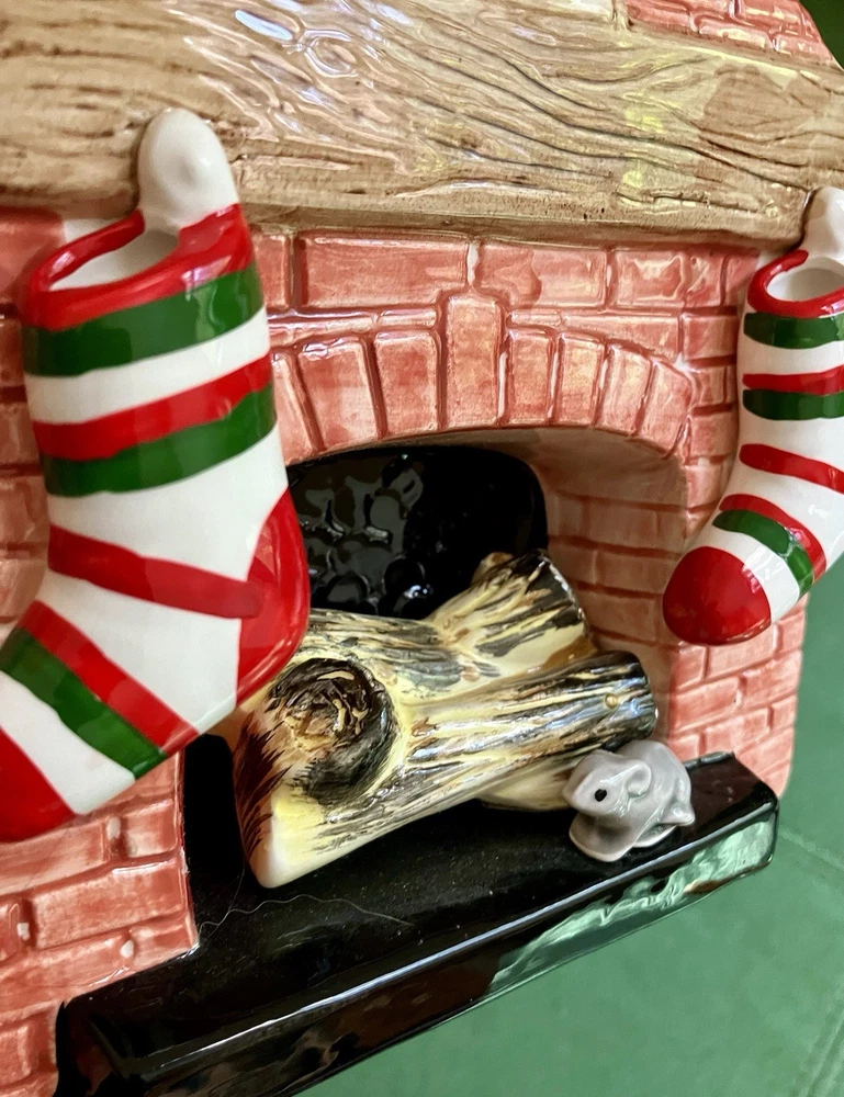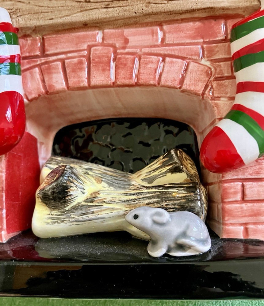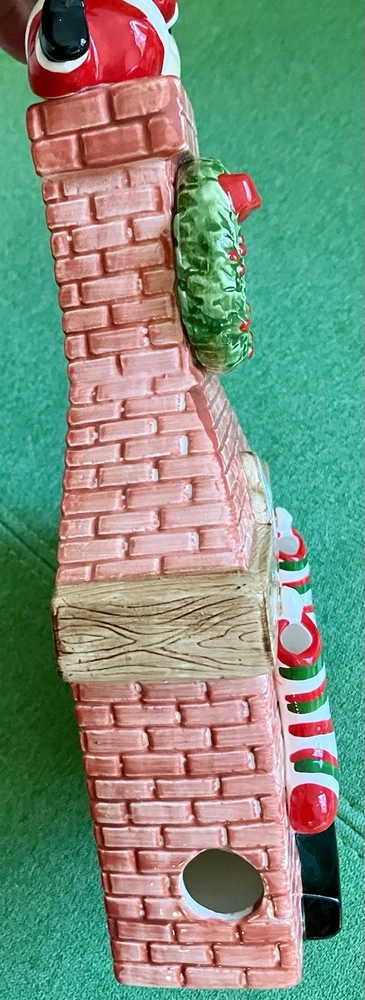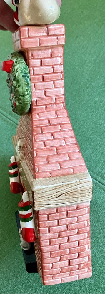 Dept 56 ceramic accessory lighted chimney w/ fireplace Does not have the lighted cord but does have the option on the left side of the fireplace 12" tall 6" across 2" deep. Featuring a little mouse sitting right by the logs, 2 stockings hanging from the mantel, a wreath at the top with Santa attempting to climb down the chimney with his presents #1/70