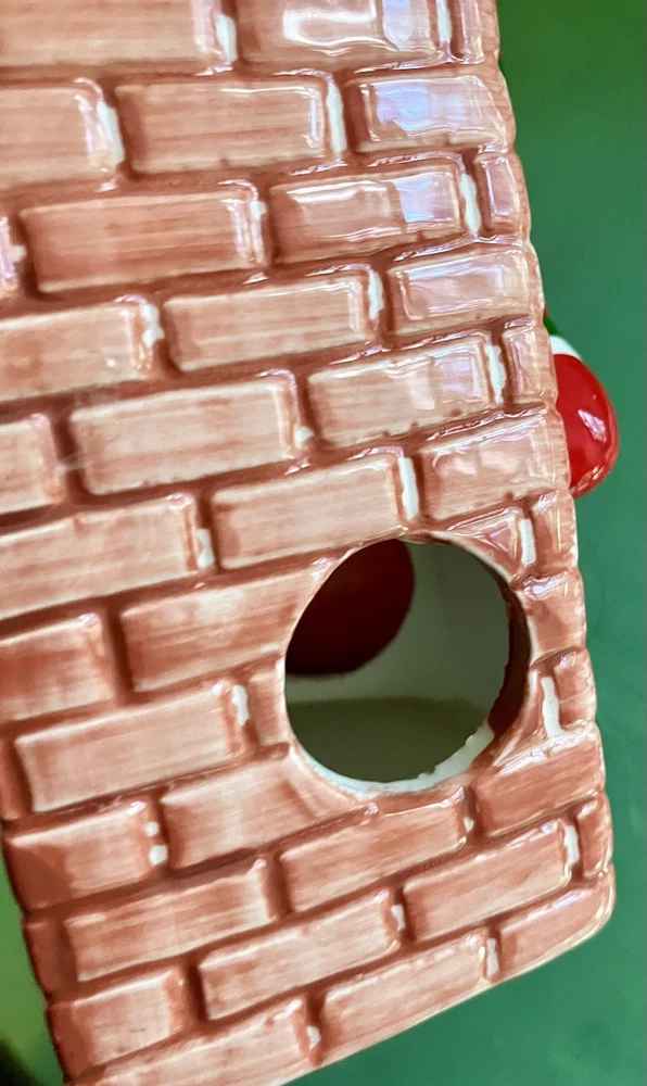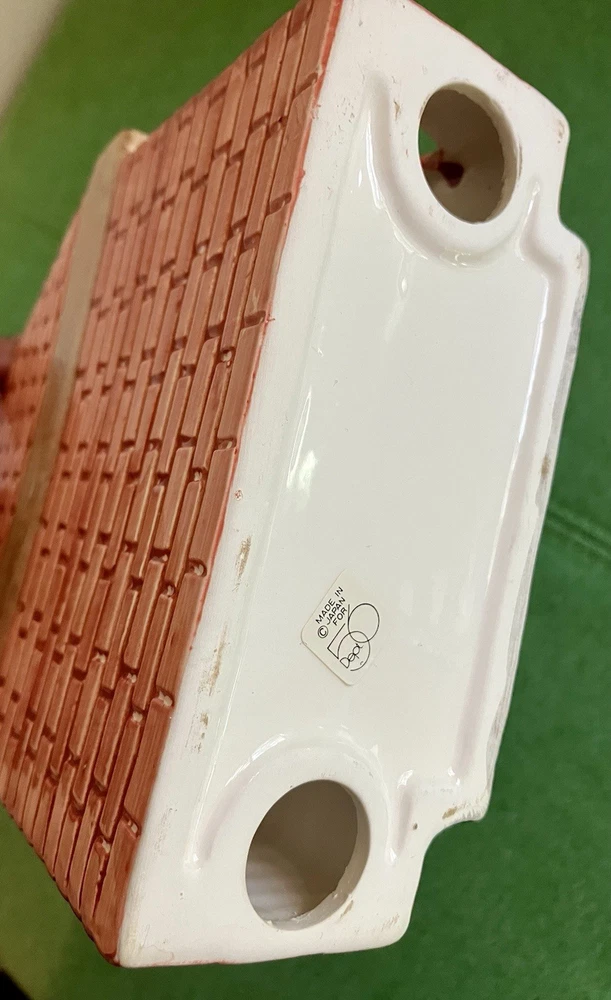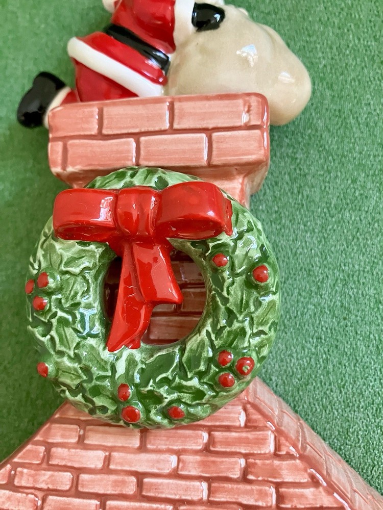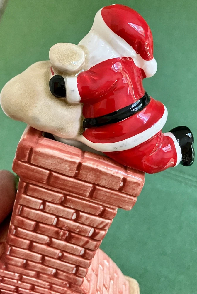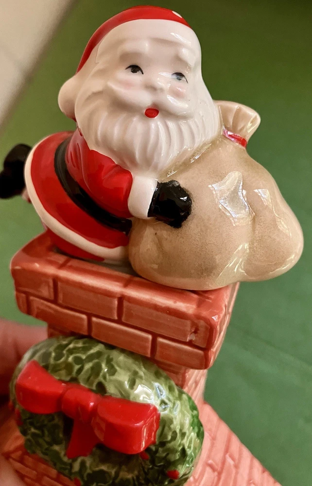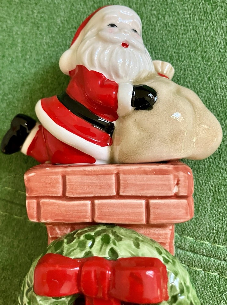 Dept 56 ceramic accessory lighted chimney w/ fireplace Does not have the lighted cord but does have the option on the left side of the fireplace 12" tall 6" across 2" deep. Featuring a little mouse sitting right by the logs, 2 stockings hanging from the mantel, a wreath at the top with Santa attempting to climb down the chimney with his presents #1/70