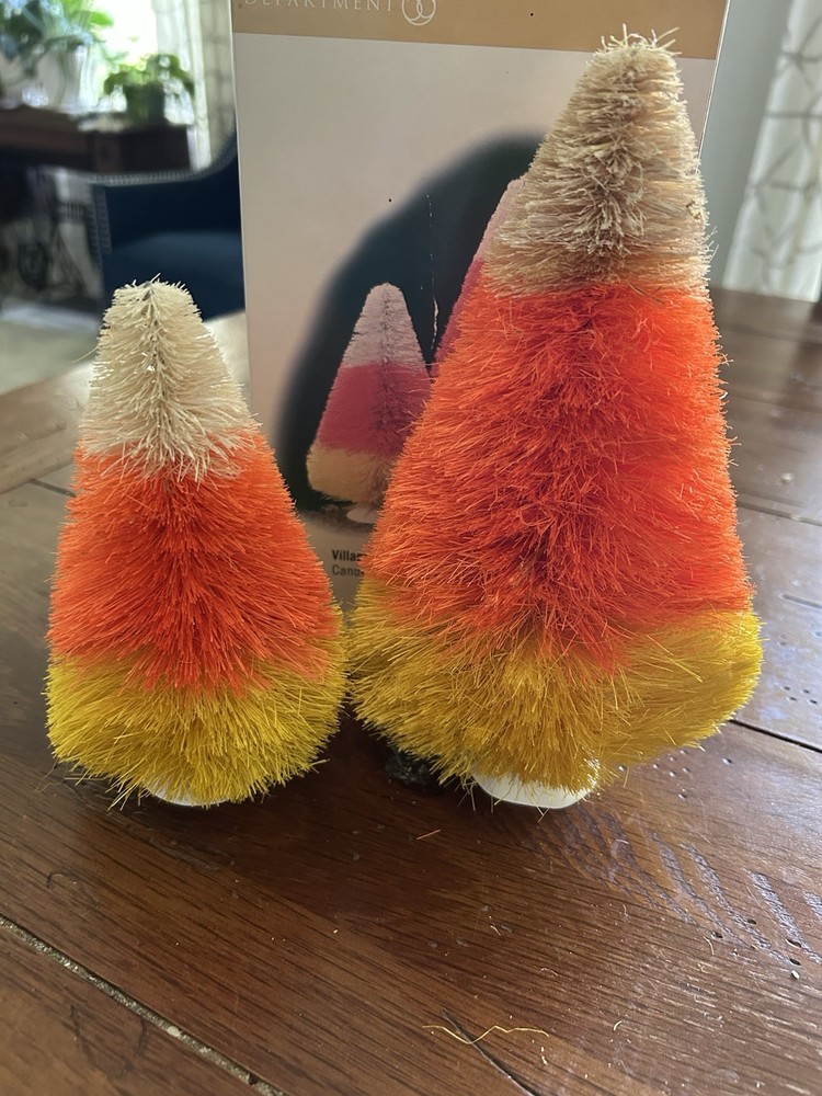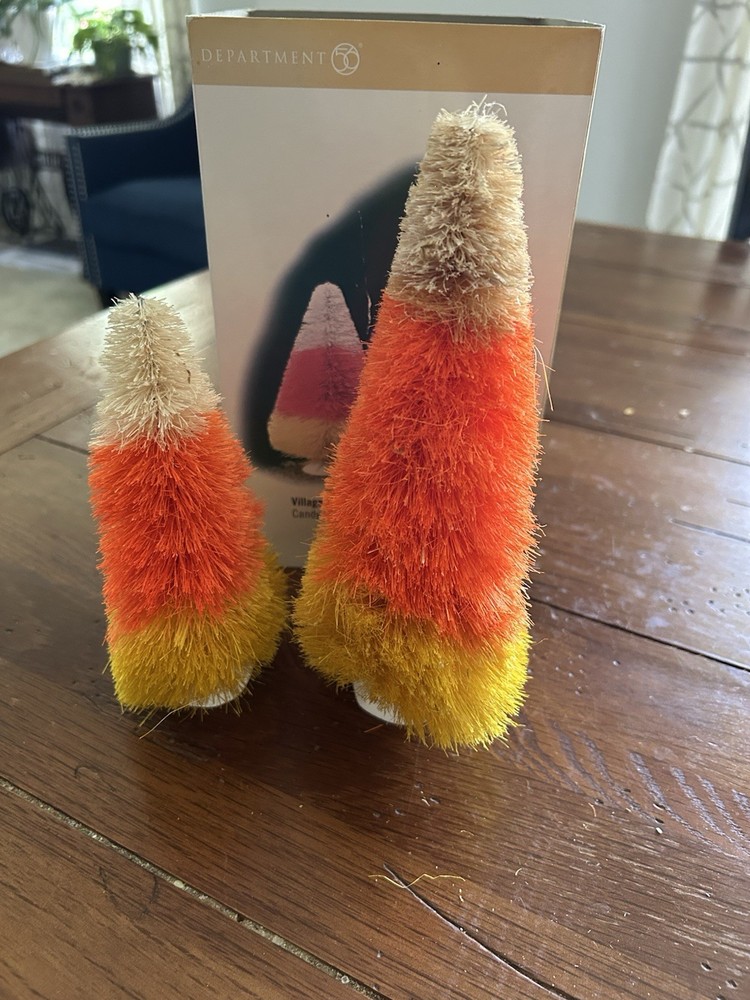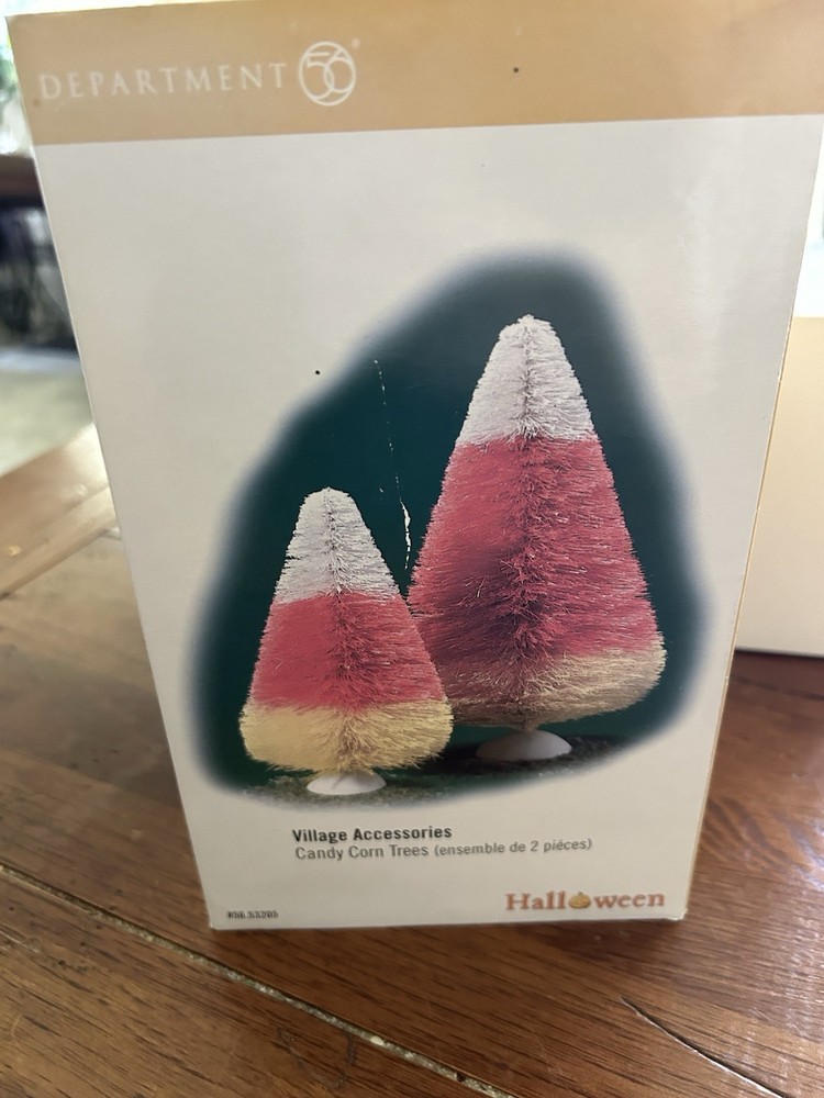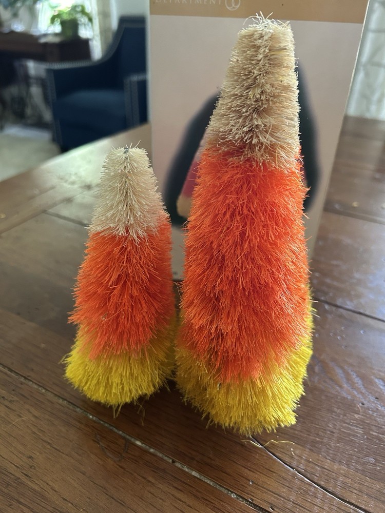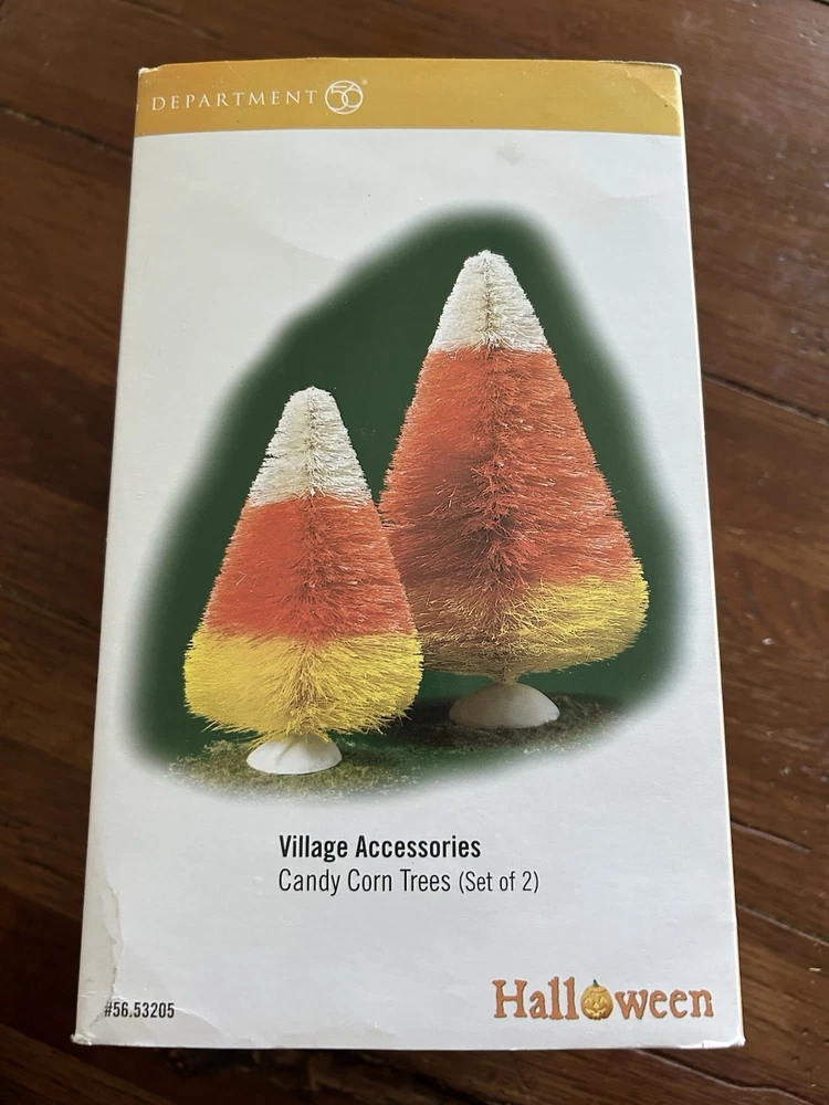 The Department 56 Candy Corn Trees Set of 2 is part of the Halloween Series #53205. These asymmetrical trees are perfect for Halloween decor, suitable for furniture placement in any room. Made in China, the original pieces come boxed, making them easy to store and display. The seasonal theme and festive design make these trees a charming addition to your Halloween collection. Always stored in original box.