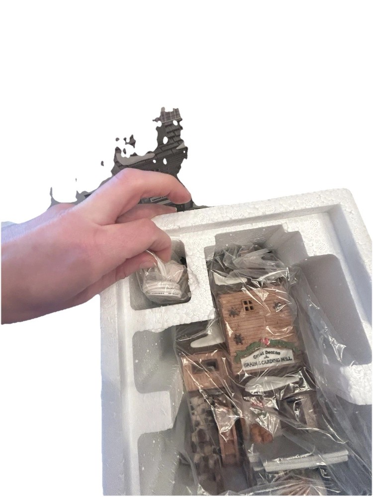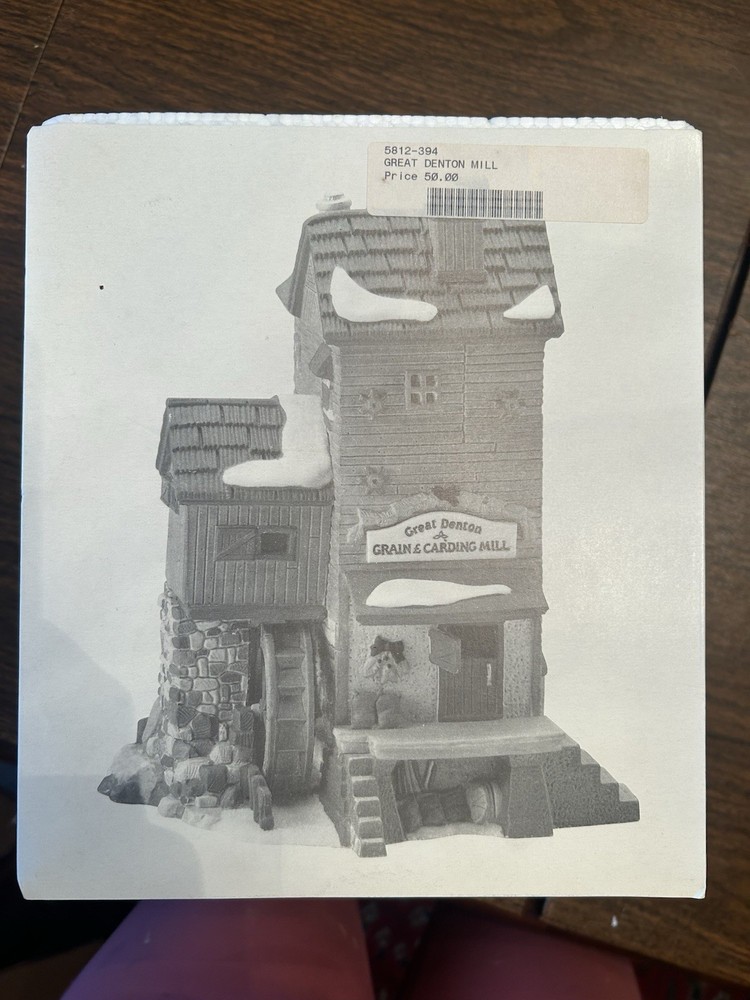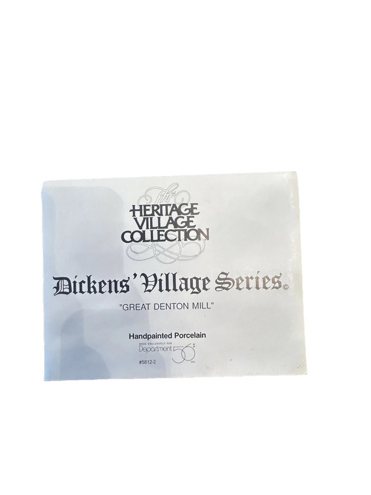 This is a collectible porcelain Christmas village made by Department 56. The piece is part of the Dickens Village collection and features the Great Denton Mill, item number 5812-2. The mill is asymmetrical in shape and multicolored, with a Victorian style. It was manufactured in 1995 and is a seasonal decoration for any room. The one piece character family is Dickensian in nature and the artist is Brent Lynch.