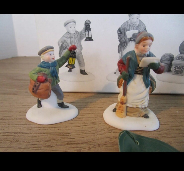 Lot Of 2 Christmas Village Figures Snowman With Skies & Children Will Dog