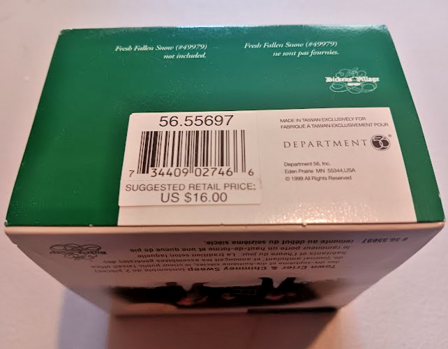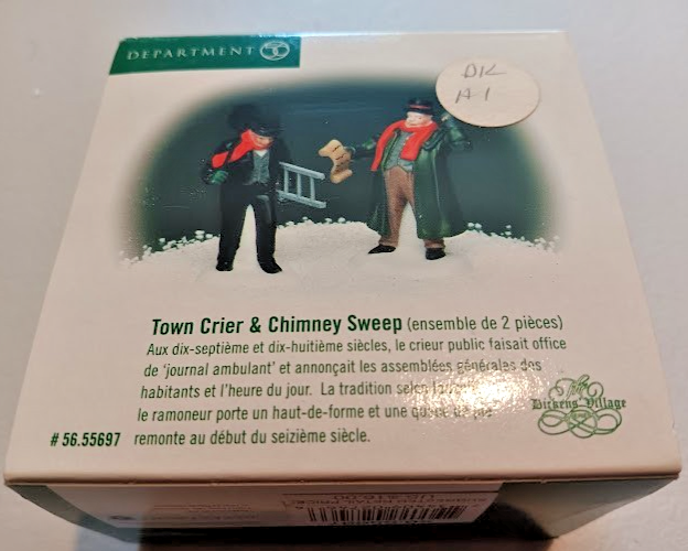O pen box. Box has discoloration, markings, dents, dings and tears present, See pictures for condition. The Department 56 Town Crier & Chimney Sweep building is part of the Dickens Village Series, perfect for adding a touch of nostalgia and charm to your holiday decor. This Christmas village piece captures a scene from a classic Dickens story, making it a special addition to your seasonal display. The intricate details and craftsmanship of this collectible item bring the spirit of Christmas to life in a unique and festive way.