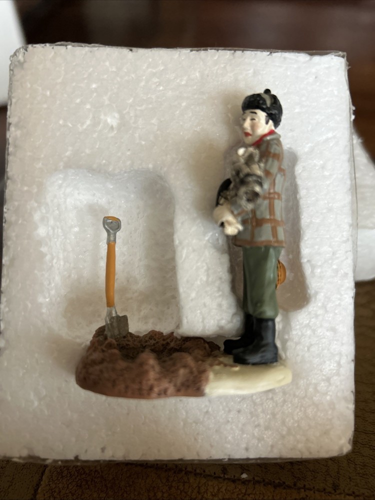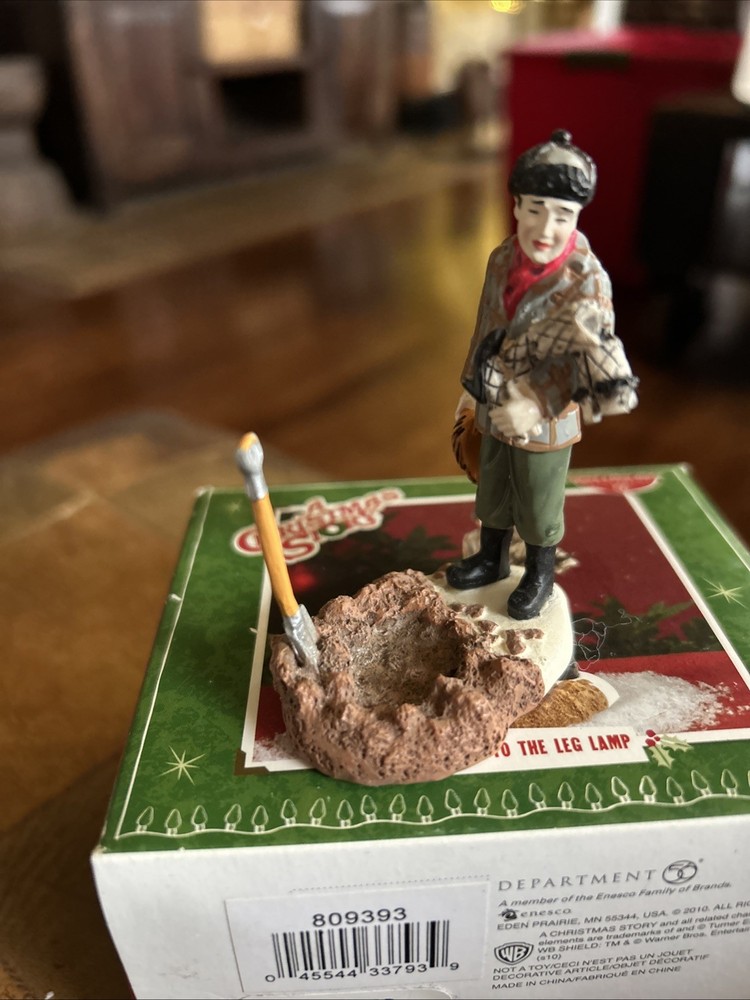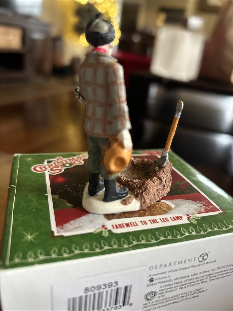 The product is a pre-owned Department 56 figure from the A Christmas Story collection, specifically depicting "Farewell To The Leg Lamp." This multicolored resin figure, manufactured in 2011, stands at 2 3/4 inches tall and is packaged in a box. With a contemporary style and seasonal theme, this collectible piece is a great addition for adults looking to add a unique and nostalgic touch to their Christmas decor.