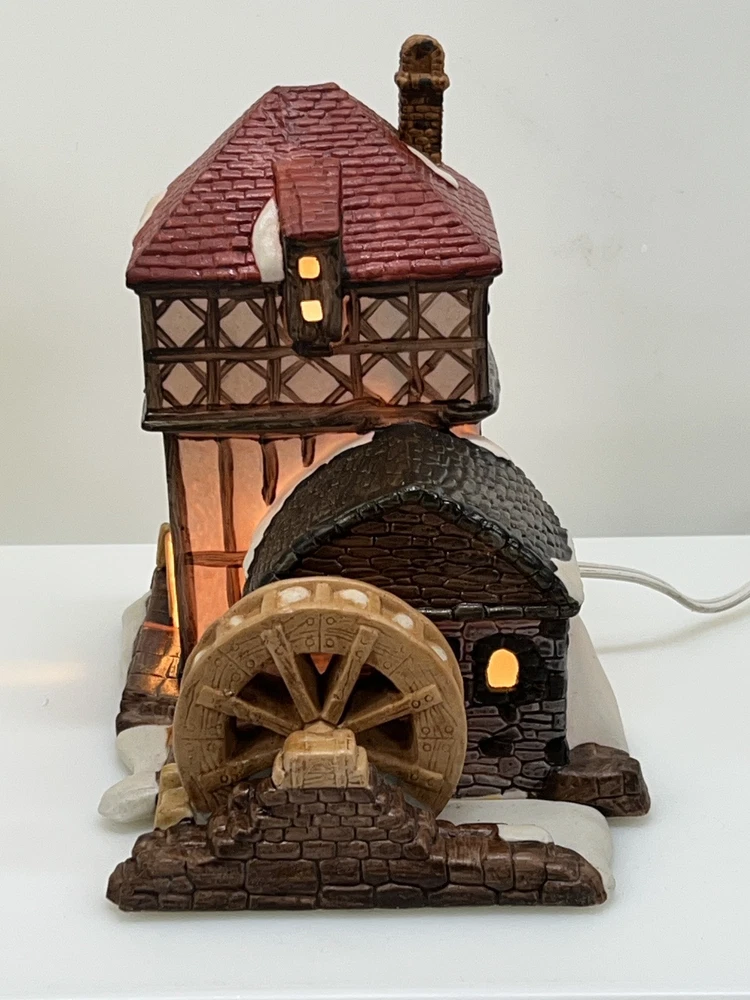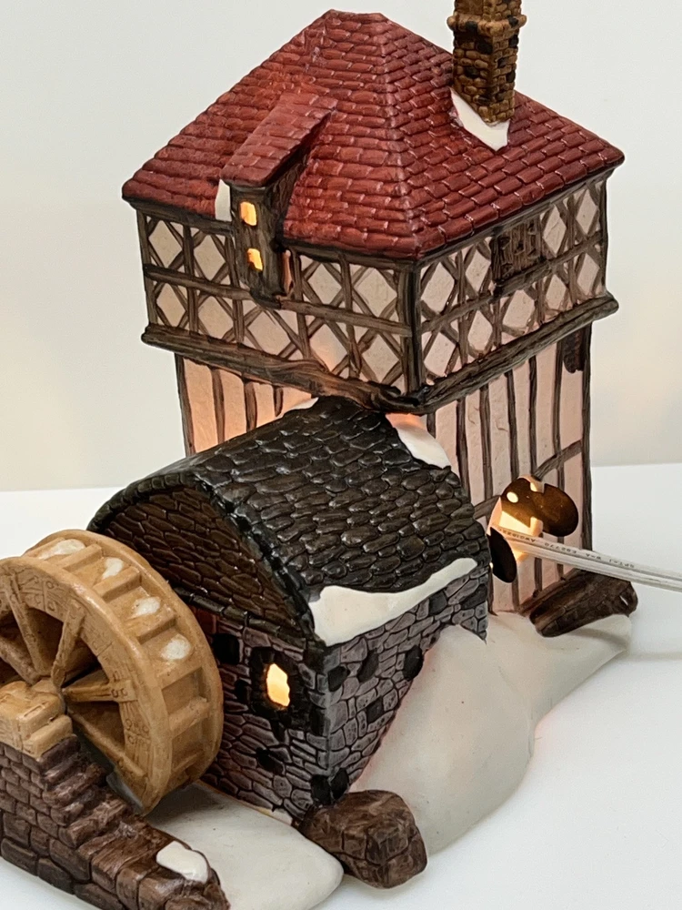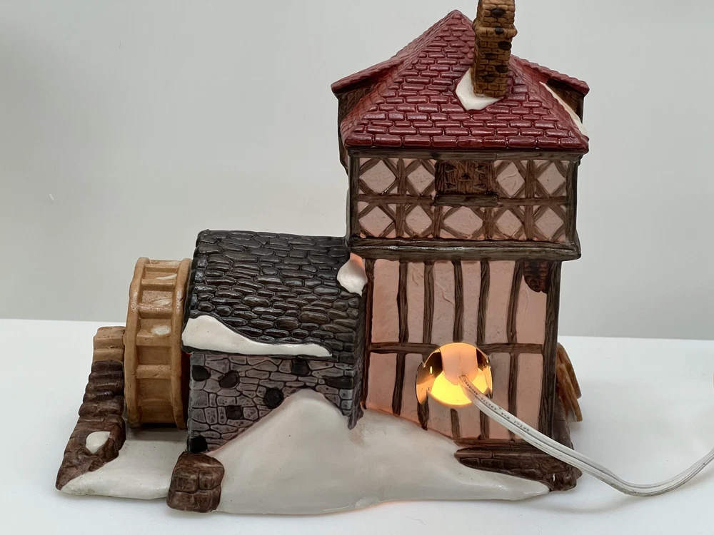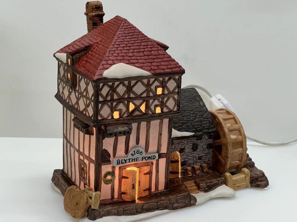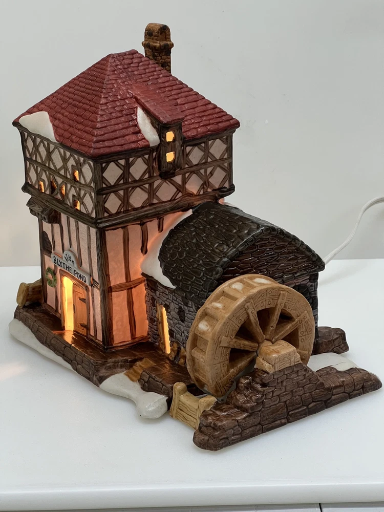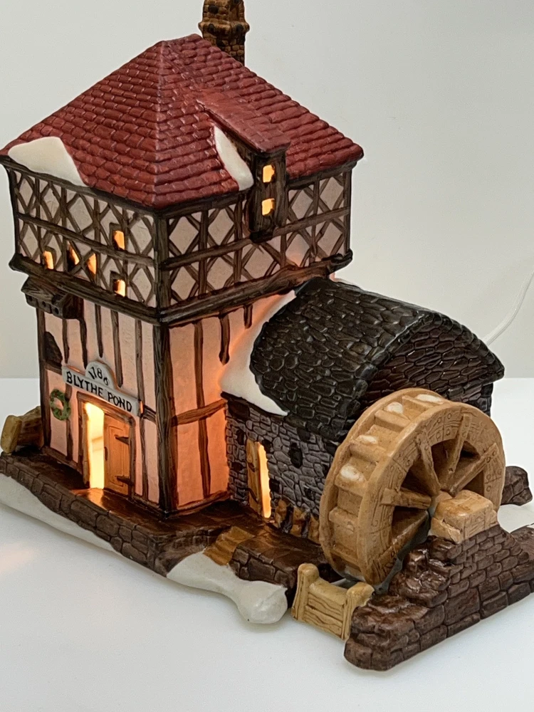 Dept 56 "Blythe Pond Mill House" from the Heritage Village Collection is a medium-sized Victorian style Christmas village house. It features an asymmetrical shape with a whimsical design, illuminated with a 3D effect. This limited edition, retired piece is hand-painted porcelain, suitable for indoor display in any room. Part of the Dickens Village theme, it depicts a water mill with a multicolor painted finish, measuring 8 inches in height, 8 inches in length, and 6 inches in width. 1986 !!! Absolutely perfect condition with all original packaging including cord & light