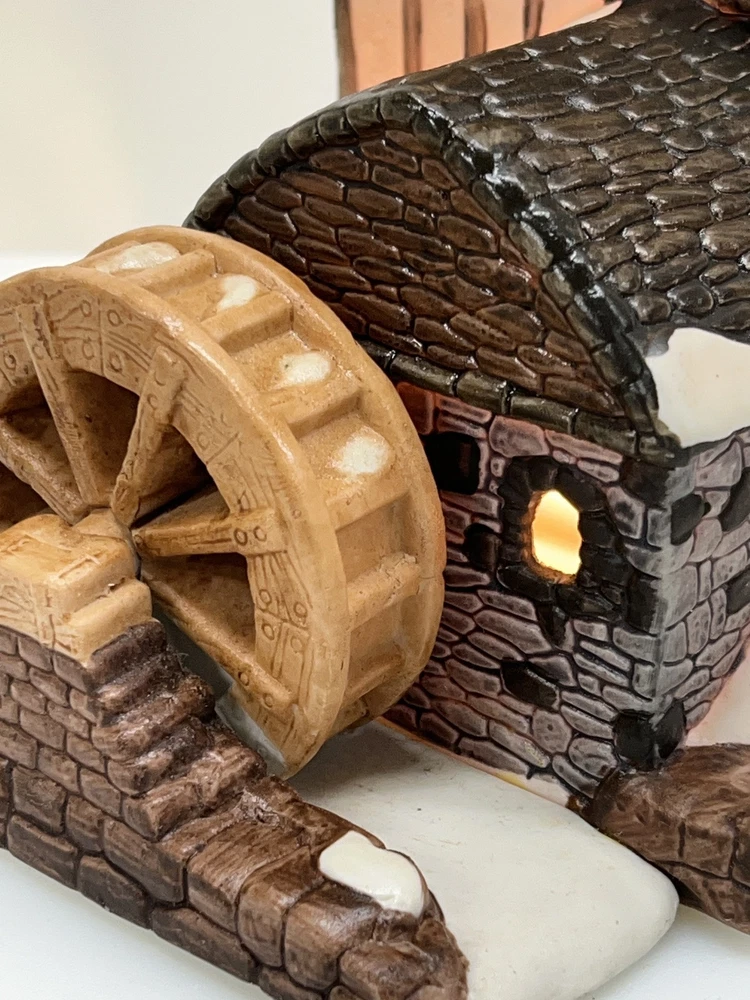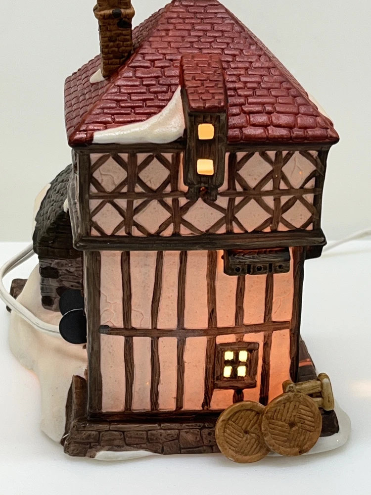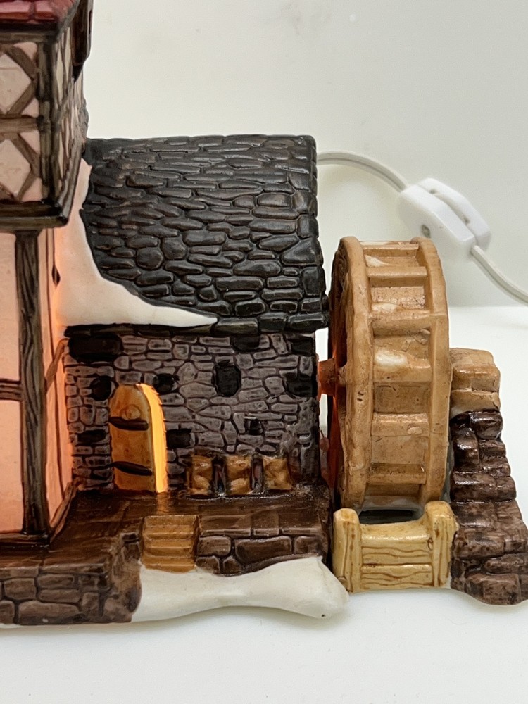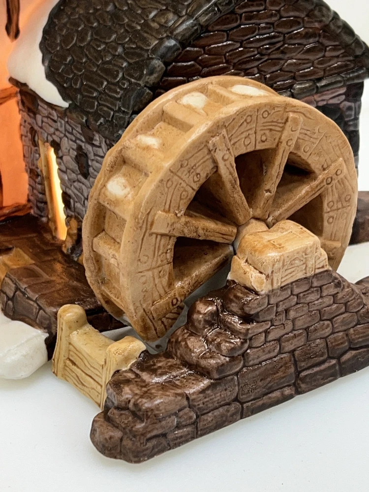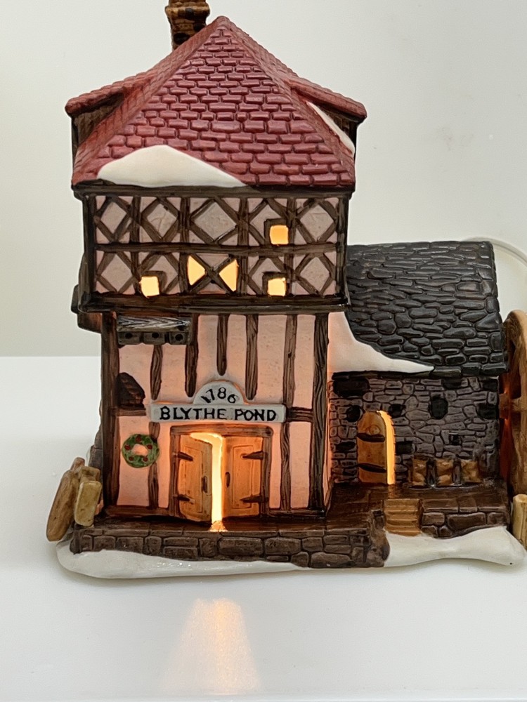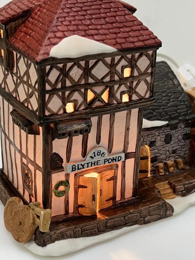 Dept 56 "Blythe Pond Mill House" from the Heritage Village Collection is a medium-sized Victorian style Christmas village house. It features an asymmetrical shape with a whimsical design, illuminated with a 3D effect. This limited edition, retired piece is hand-painted porcelain, suitable for indoor display in any room. Part of the Dickens Village theme, it depicts a water mill with a multicolor painted finish, measuring 8 inches in height, 8 inches in length, and 6 inches in width. 1986 !!! Absolutely perfect condition with all original packaging including cord & light