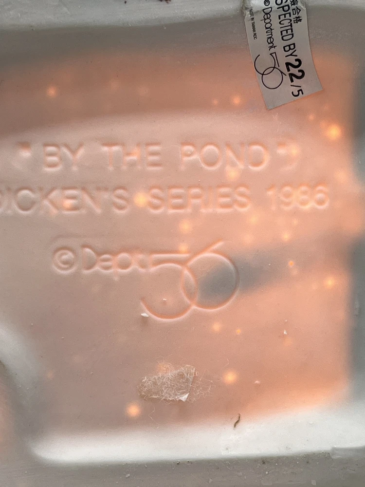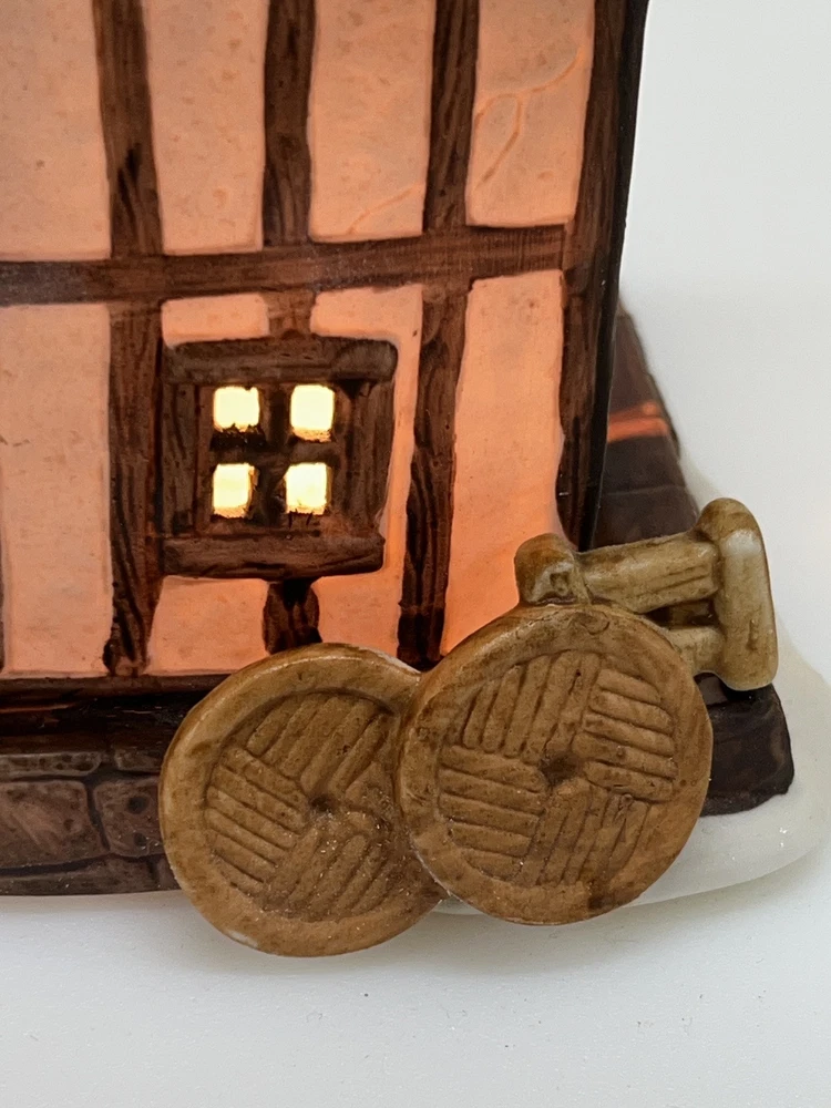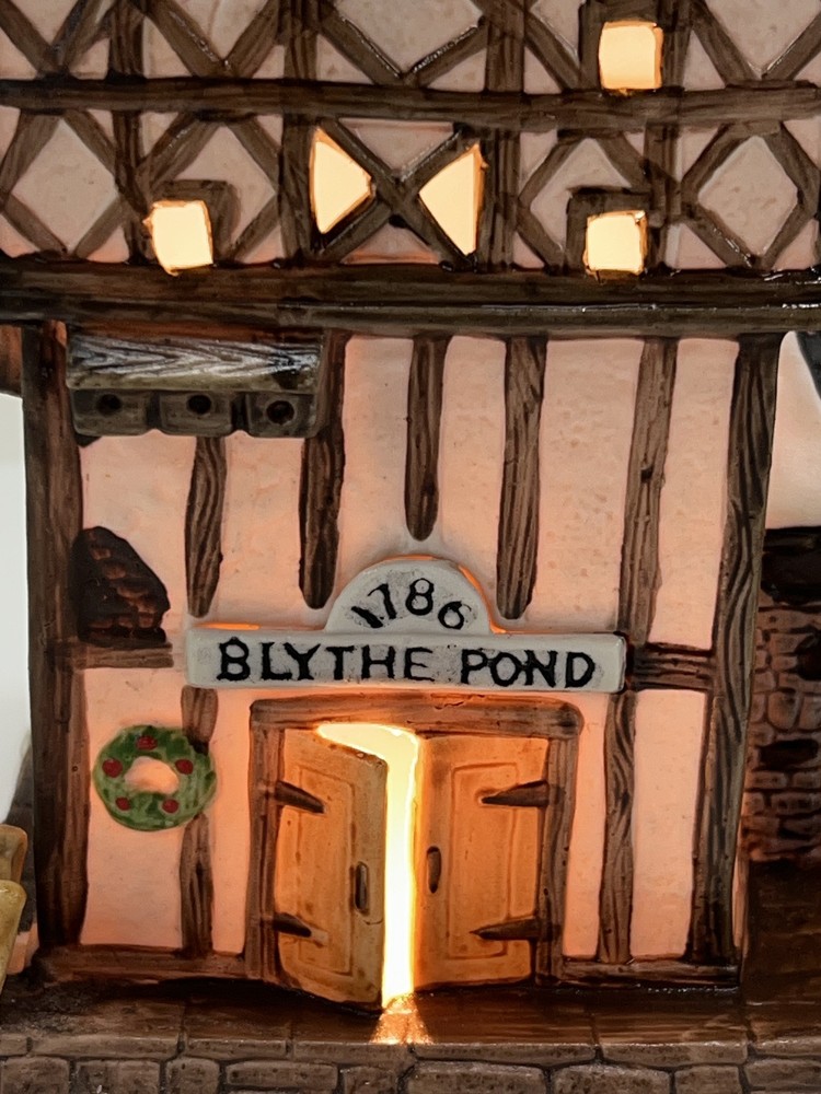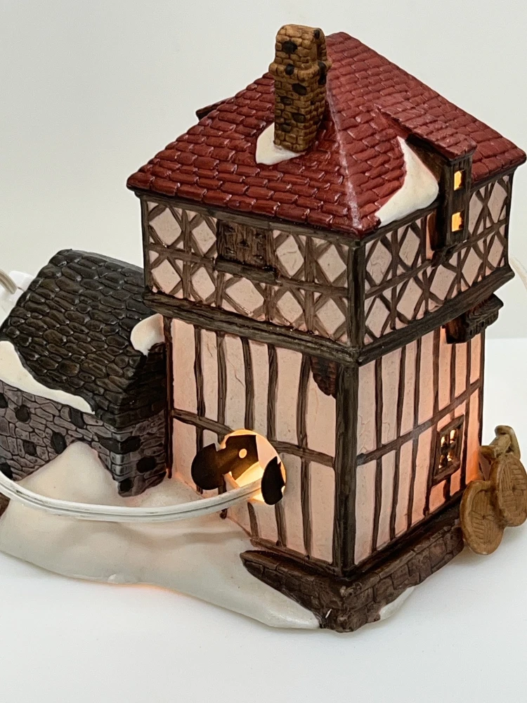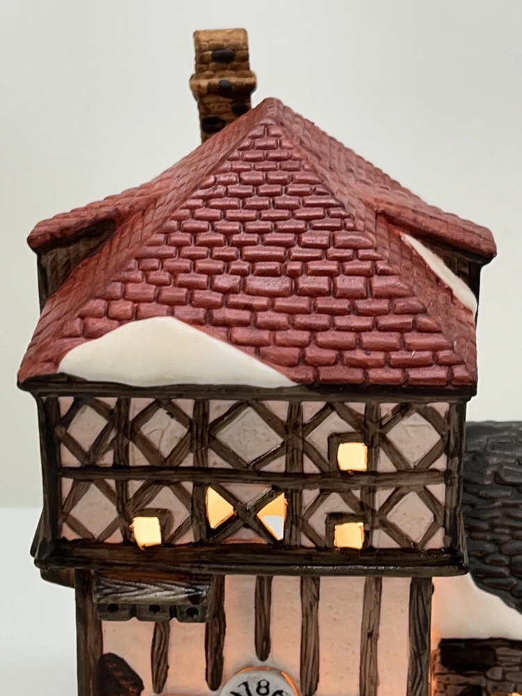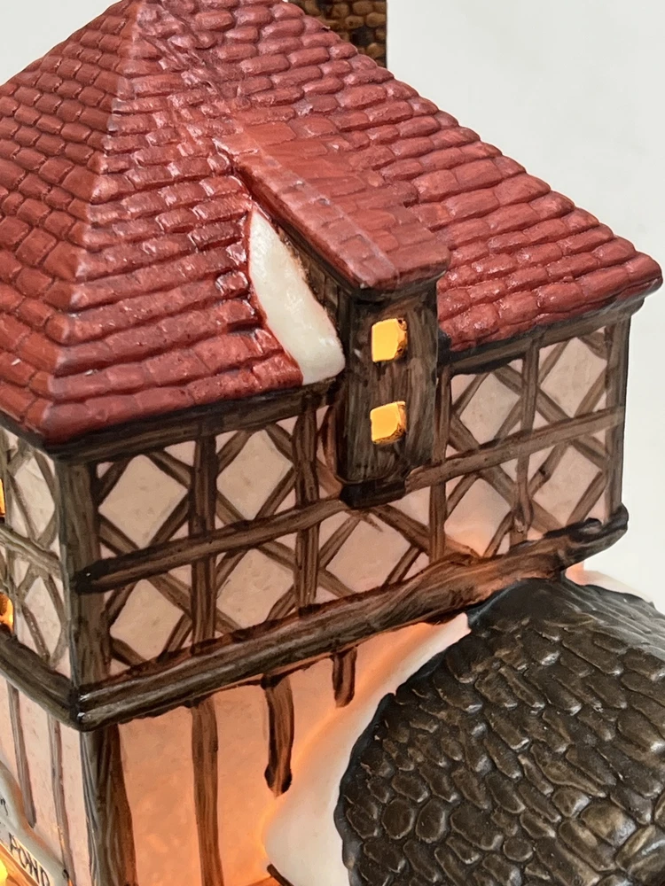 Dept 56 "Blythe Pond Mill House" from the Heritage Village Collection is a medium-sized Victorian style Christmas village house. It features an asymmetrical shape with a whimsical design, illuminated with a 3D effect. This limited edition, retired piece is hand-painted porcelain, suitable for indoor display in any room. Part of the Dickens Village theme, it depicts a water mill with a multicolor painted finish, measuring 8 inches in height, 8 inches in length, and 6 inches in width. 1986 !!! Absolutely perfect condition with all original packaging including cord & light