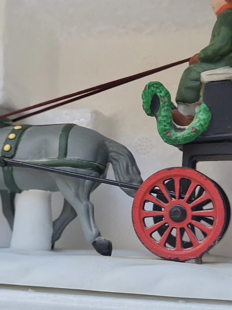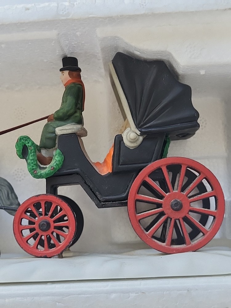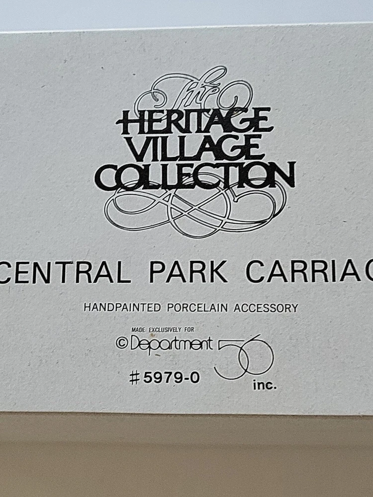 Missing 1 of the lower black straps from carriage to horse. We never noticed and just faced item with good side out. Discount priced accordingly. Please see Detailed Photos 📸 for Item Condition and Specifics Fast Shipping 🚢 The Dept 56 Central Park Carriage from the 1989 Heritage Village Collection is a small, hand-painted ceramic and porcelain carriage featuring an asymmetrical Victorian design. It measures 7 1/4 inches in length, 4 inches in height, and 2 5/8 inches in width, making it suitable for display in any room or as part of a Christmas village setup. The carriage is themed around Central Park and depicts a winter scene, perfect for adding a festive touch to your holiday decor. It comes in its original box and is a charming piece for collectors of seasonal village items.