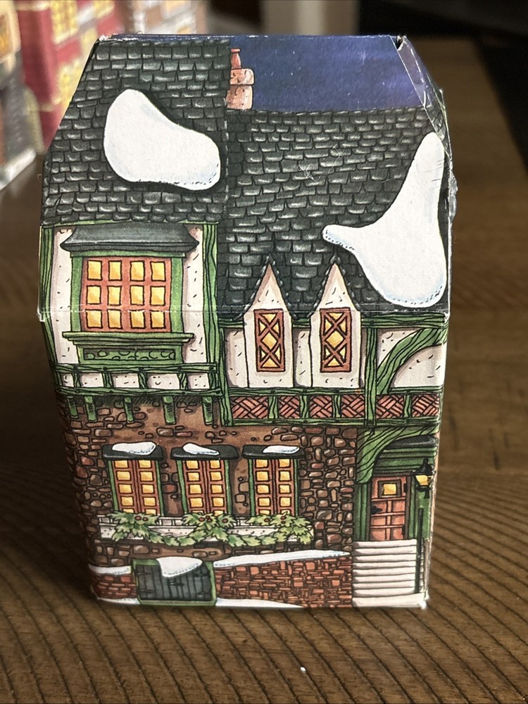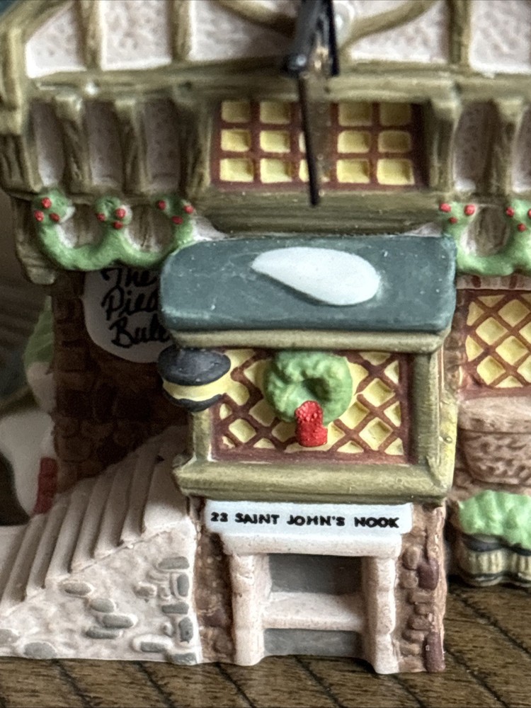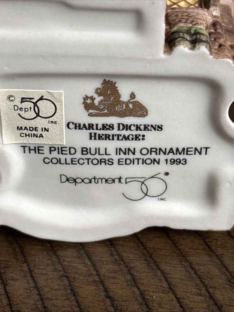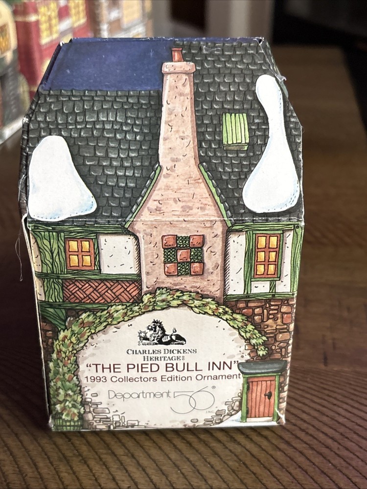 The Department 56 Charles Dickens Heritage "The Pied Bull Inn" 1993 Collectors Ornament is a medium-sized porcelain ornament suitable for furniture or a Christmas tree. Featuring an asymmetrical shape and a painted multicolor finish, this ornament depicts the iconic "The Pied Bull Inn" building from the Dickens Village collection. With a hanging feature, this ornament is perfect for any room during the holiday season, adding a touch of seasonal charm to your decor. Made in China in 1993 by Department 56, this ornament is a collectible piece that celebrates the work of Charles Dickens.