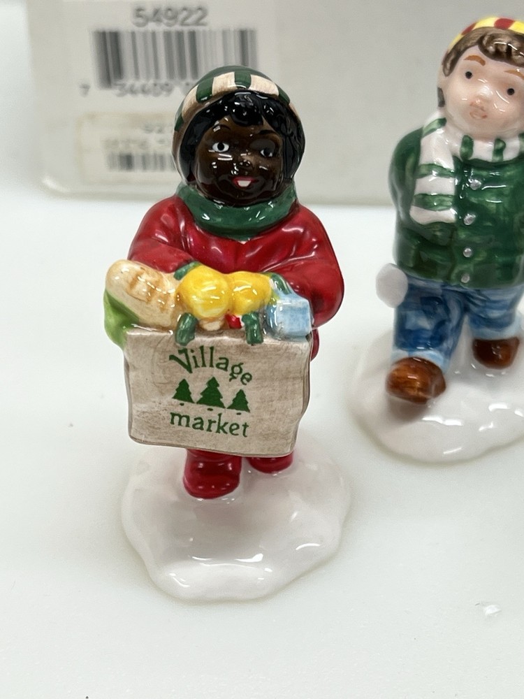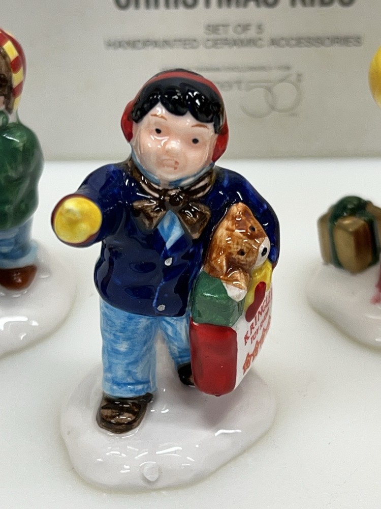 Dept 56 "Christmas Kids" The Original Snow Village 54992 Set Of 5 is a small set of ceramic and porcelain figurines from 1996. This American-style Christmas Village Kids collection features whimsical village kids in a multicolor painted finish. The set is part of the Snow Village series by Department 56, depicting seasonal scenes with a theme of Village People in a festive Christmas setting. The set comes in its original box packaging. Perfect pristine condition