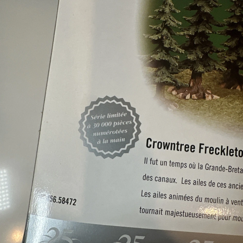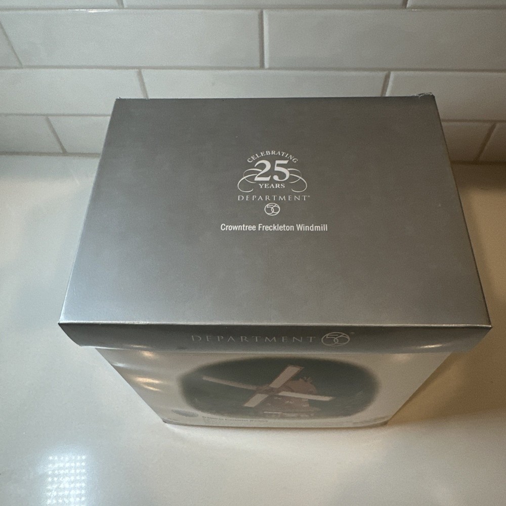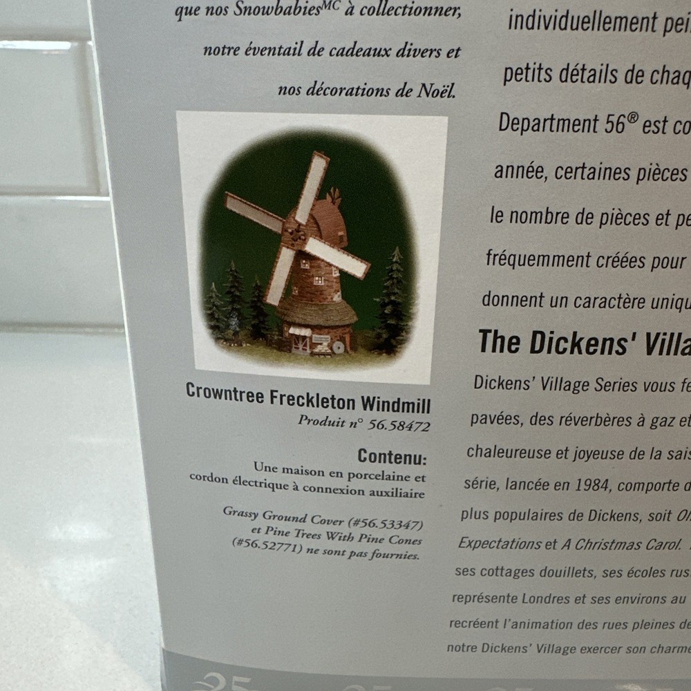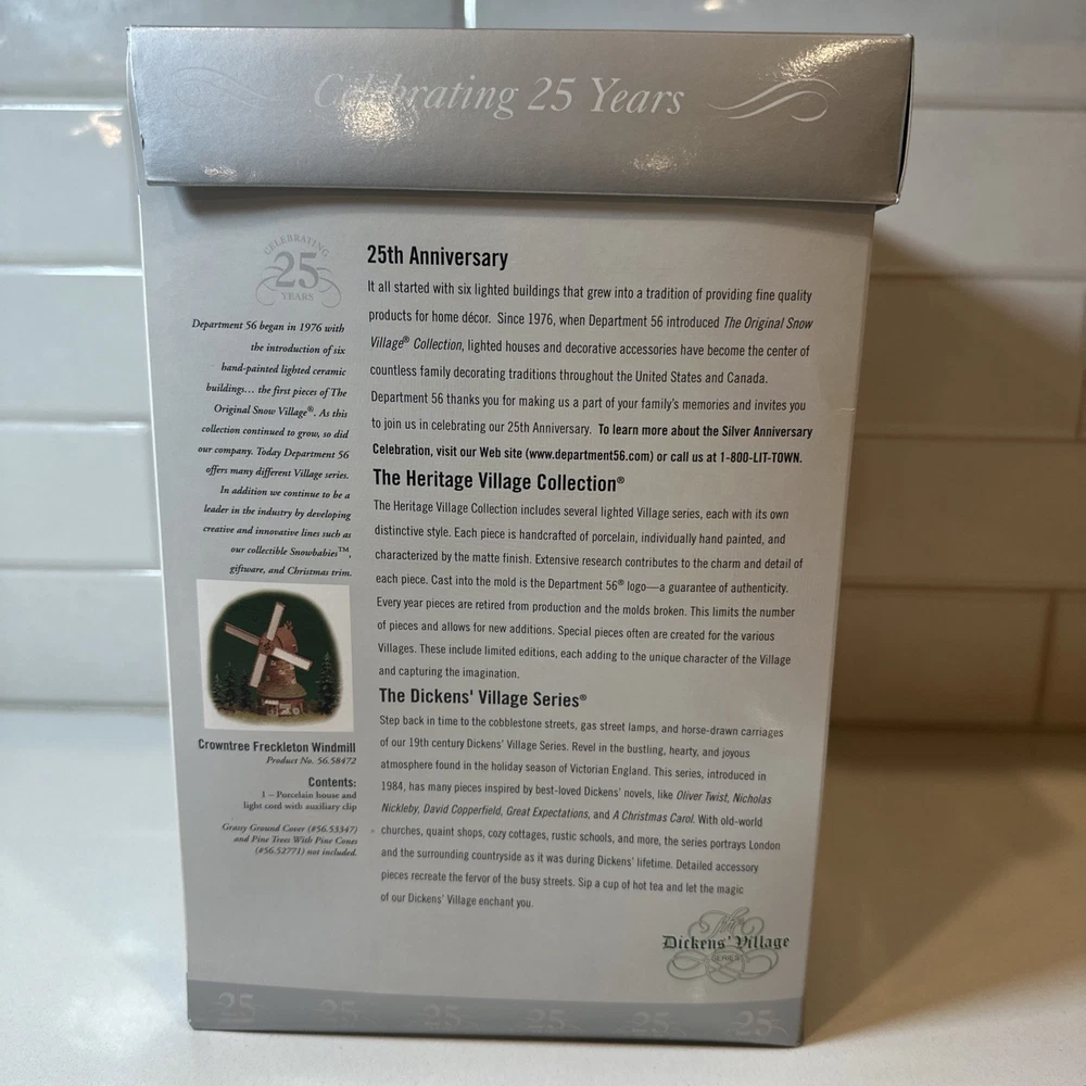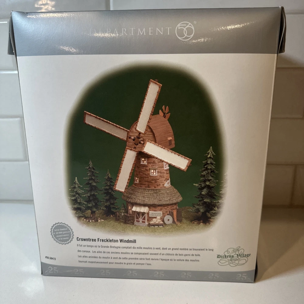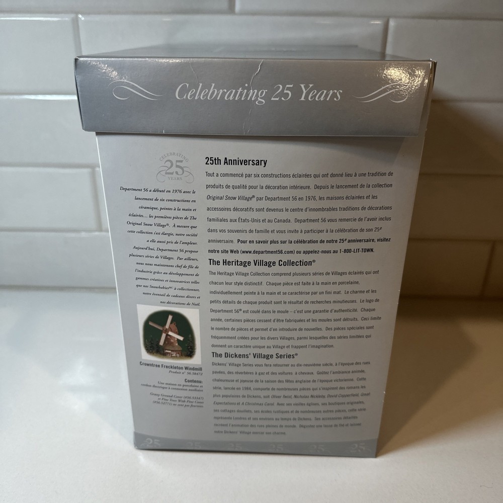 The Original Dept 56 Crowntree Freckleton Windmill 58472 is a rare and limited edition collectible piece from the Department 56 brand. This medium-sized, asymmetrical porcelain windmill features a multicolor painted finish, making it a unique addition to any holiday or seasonal village display. Manufactured in 2000 as part of the Dicken's Village collection, this original piece comes sealed in its box, adding to its value and appeal for collectors. Perfect for all occasions and any room in the house, this windmill is a charming and nostalgic decorative item for enthusiasts of vintage holiday decor.