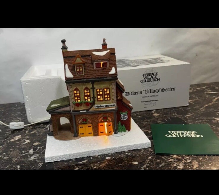 Add a piece of Victorian charm to your holiday decor with this Department 56 Dickens Heritage Christmas Village piece. The Harness Shop features hand-painted matte finish and intricate details, making it a unique addition to any room. This illuminated ceramic and porcelain building is suitable for window, floor, stairs, or furniture display, and is perfect for those who love Charles Dickens' work. This retired piece from the Heritage Village collection depicts a horse harness seller in a bustling Christmas market, and is part of a set of four buildings. The item measures 8" tall, 7 1/2" wide, and 4 1/4" deep, and weighs 2 lbs. It comes in its original box, and is an original piece from the 1990s. Perfect for collectors and those looking for a unique holiday decoration.