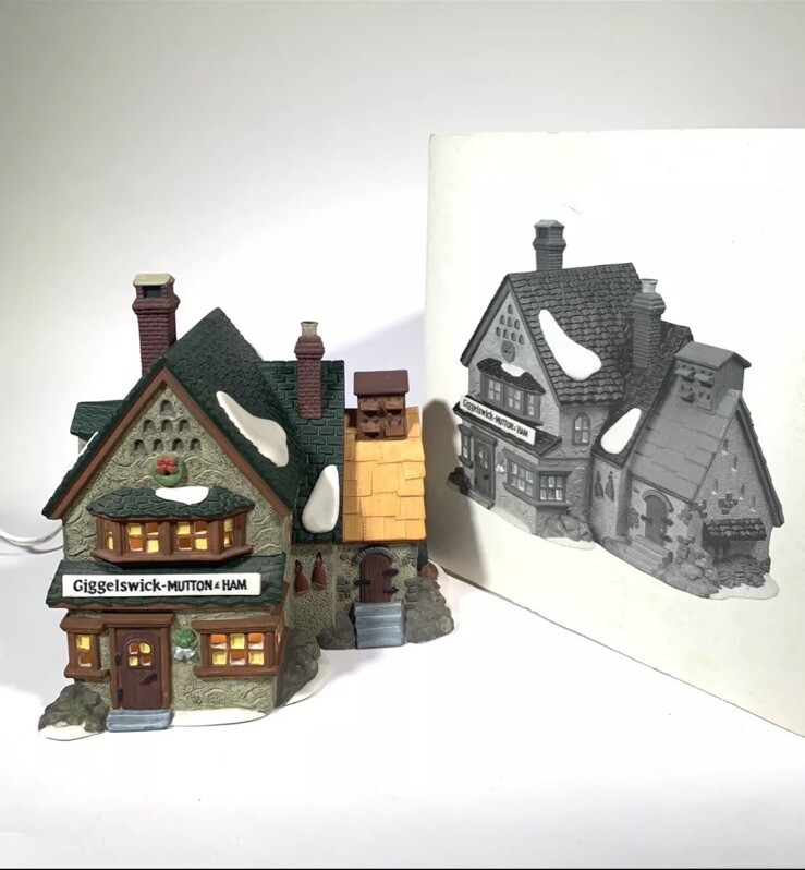 This is a small, hand-painted ceramic and porcelain Christmas village house from Department 56's Dickens Village collection. The Giggelswick Mutton & Ham house is a Victorian-style building with a matte painted finish. It features illuminated windows and a thatched roof, and is suitable for display on a window, floor, stairs, or furniture. The house measures 7 inches tall, 7 1/4 inches wide, and 7 inches deep, and weighs 2 pounds. It was manufactured in Taiwan in 1994 and is a retired, original piece. The house comes in a box and is part of a Dickens Christmas village theme.