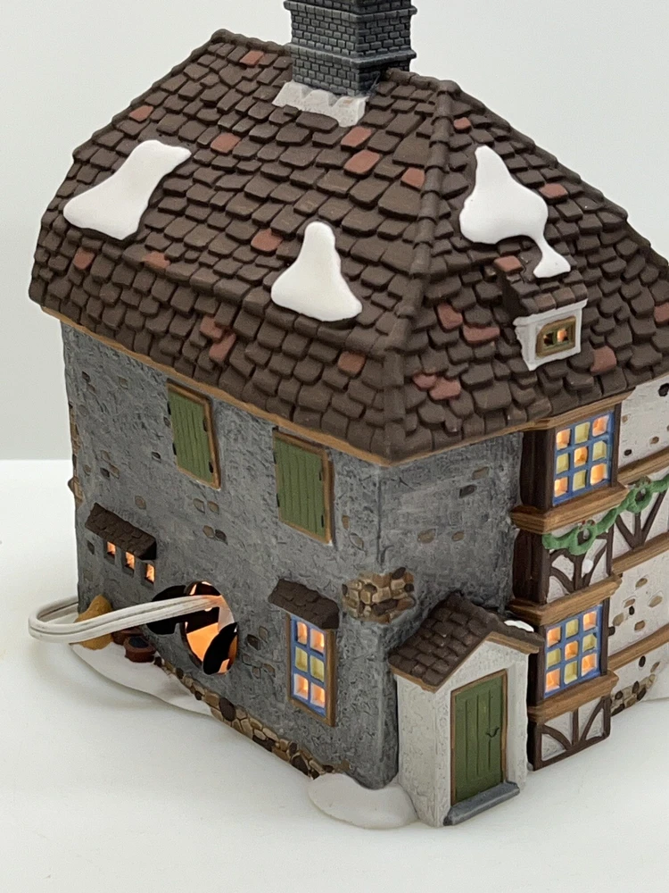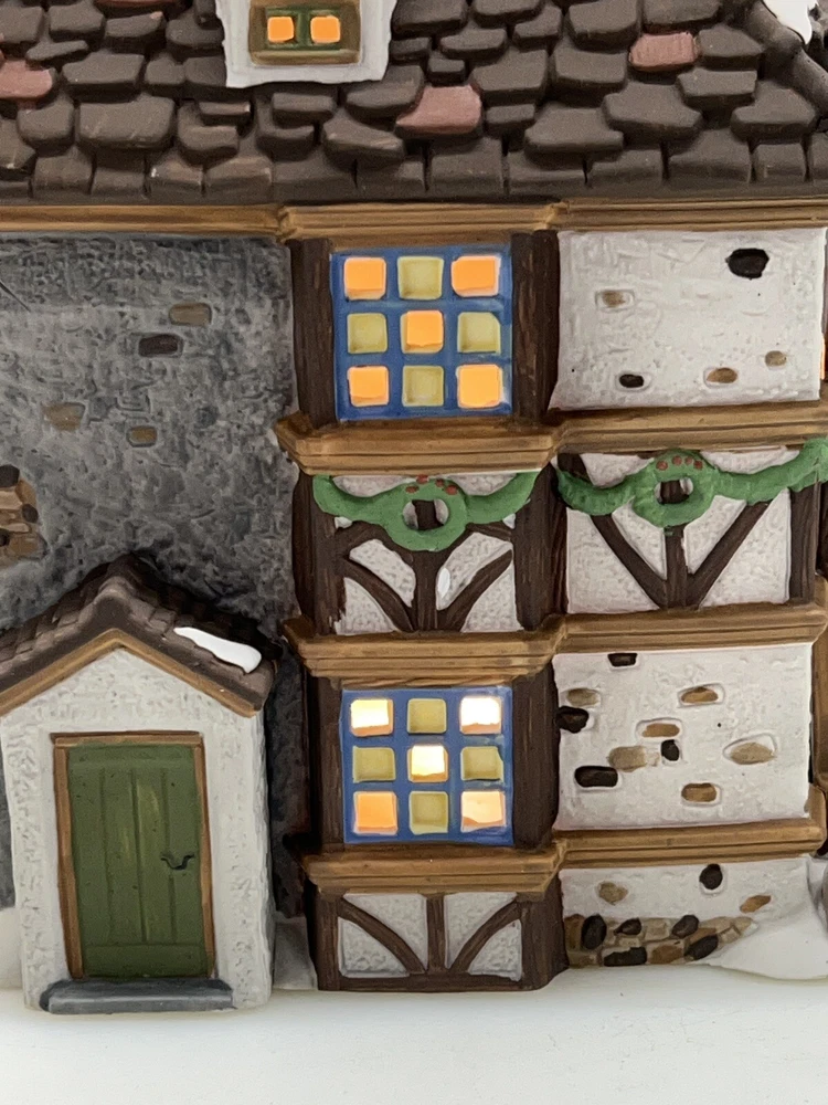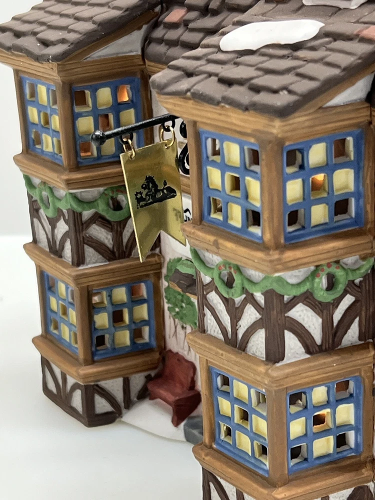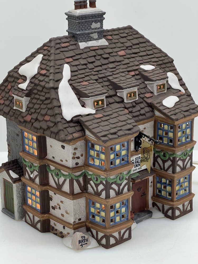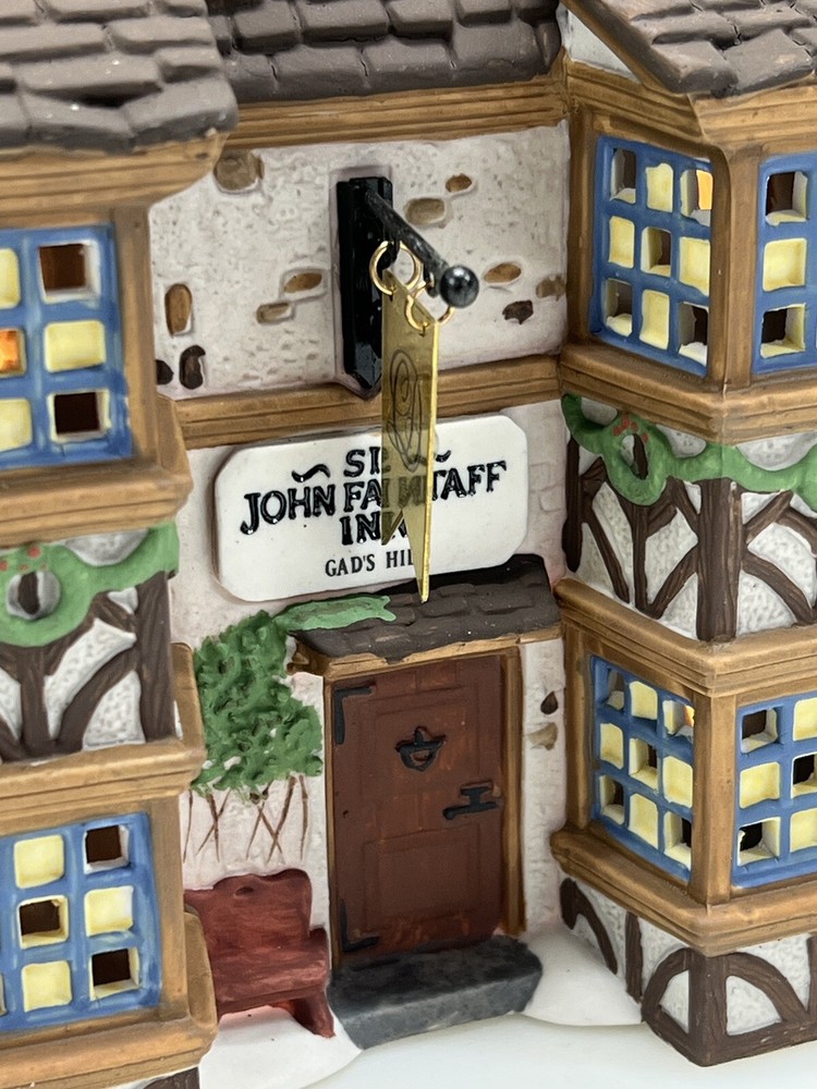 Dept 56 Dickens Heritage Village Series Sir John Falstaff Inn 57533 is a medium-sized Victorian-style ceramic and porcelain house from 1995. It is hand-painted, illuminated, and suitable for indoor seasonal display. The multicolor house is 8 1/2" tall, 6" deep, and 7 1/2" wide. Part of the Heritage Village Collection, it represents a Christmas-themed village scene, specifically the Dickens Village. It comes in its original boxed packaging and weighs 3 lbs. Absolutely mint clean pristine condition! Comes with original box and packaging Comes with cord & light Incredible detail
