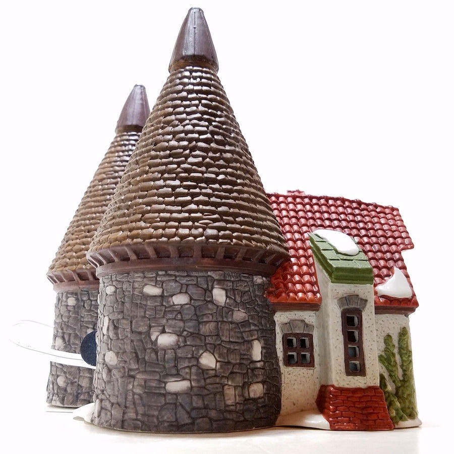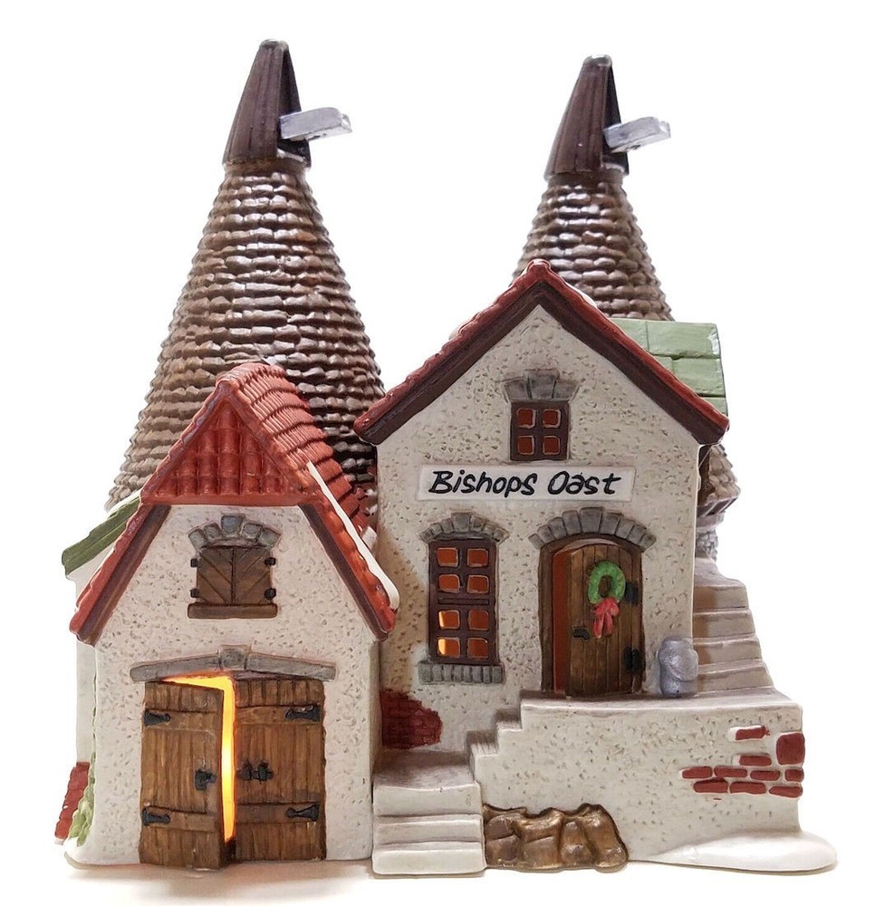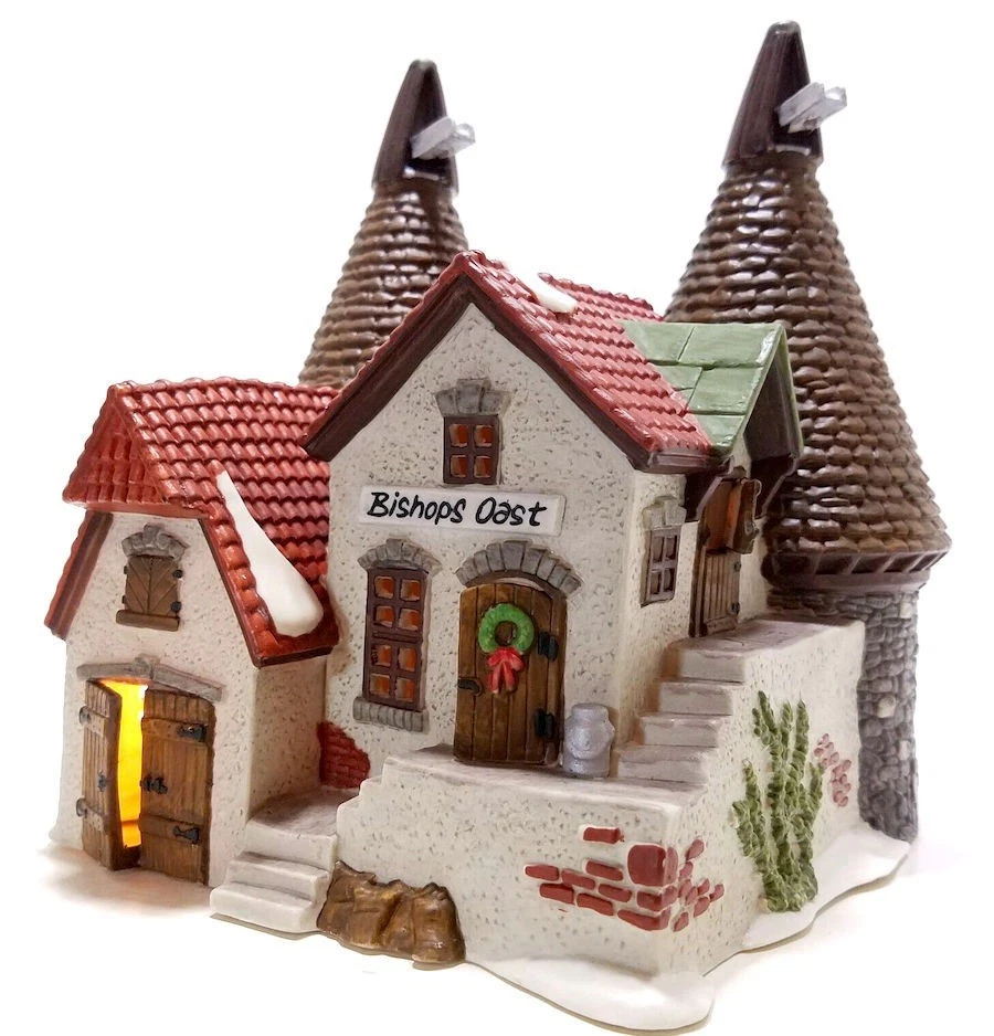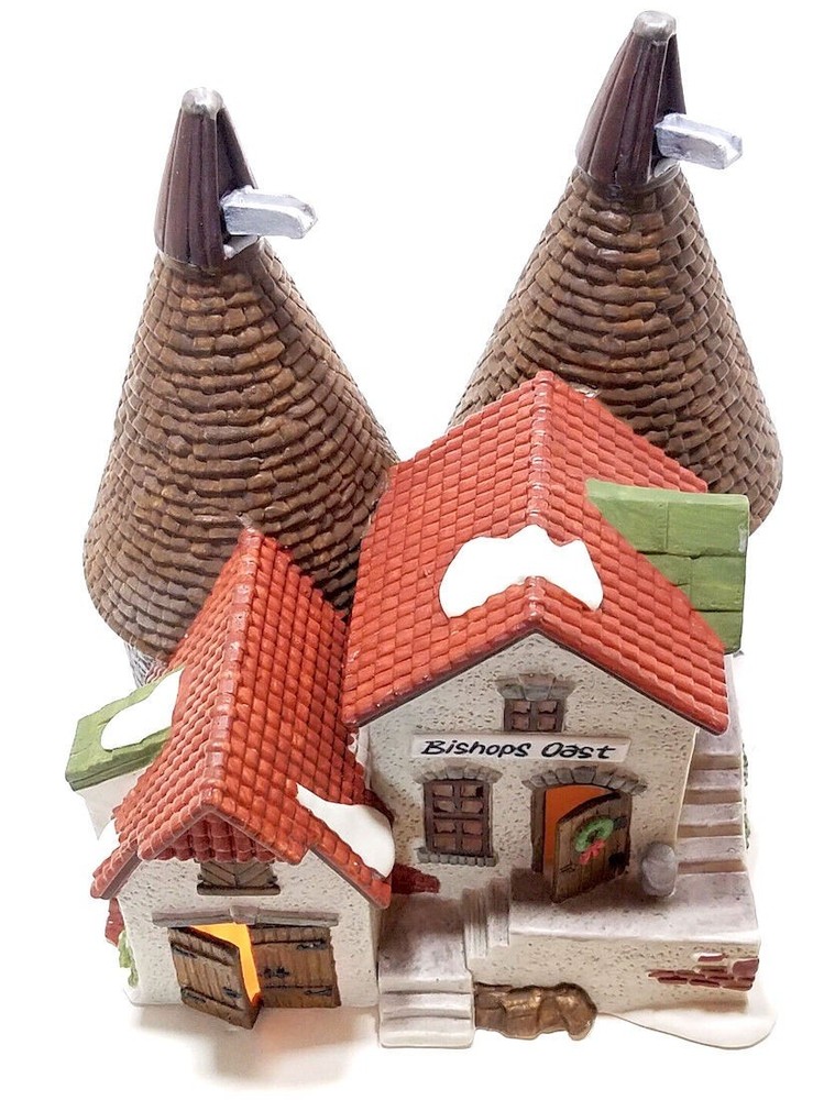 The Dept 56 Dickens Village "Bishops Oast House" is a beautifully crafted Christmas village piece from 1990. Hand-painted and illuminated with a light cord, this Victorian-style house is part of the Dickens Village collection by Department 56. Standing at 7 3/4" tall and 6 3/4" wide, it features intricate details and is suitable for display in any room. The multicolor painted finish and unique design of the house with grain silos make it a charming addition to any Christmas display, bringing the spirit of Charles Dickens' "A Christmas Carol" to life in a festive and whimsical way.. Original cost $58