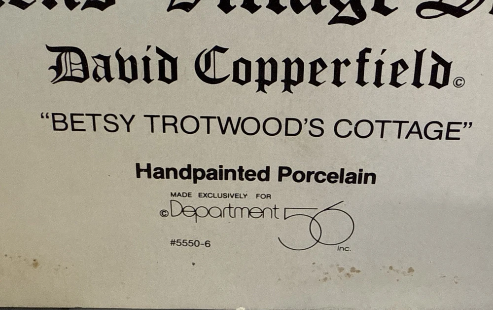 Dept 56 Dickens' Village David Copperfield Betsy Trotwood's Cottage Vintage Pre-Owned in very good condition. Well taken care of all of these years. Please see all photos for best representation. Thank you for looking and supporting my small business!