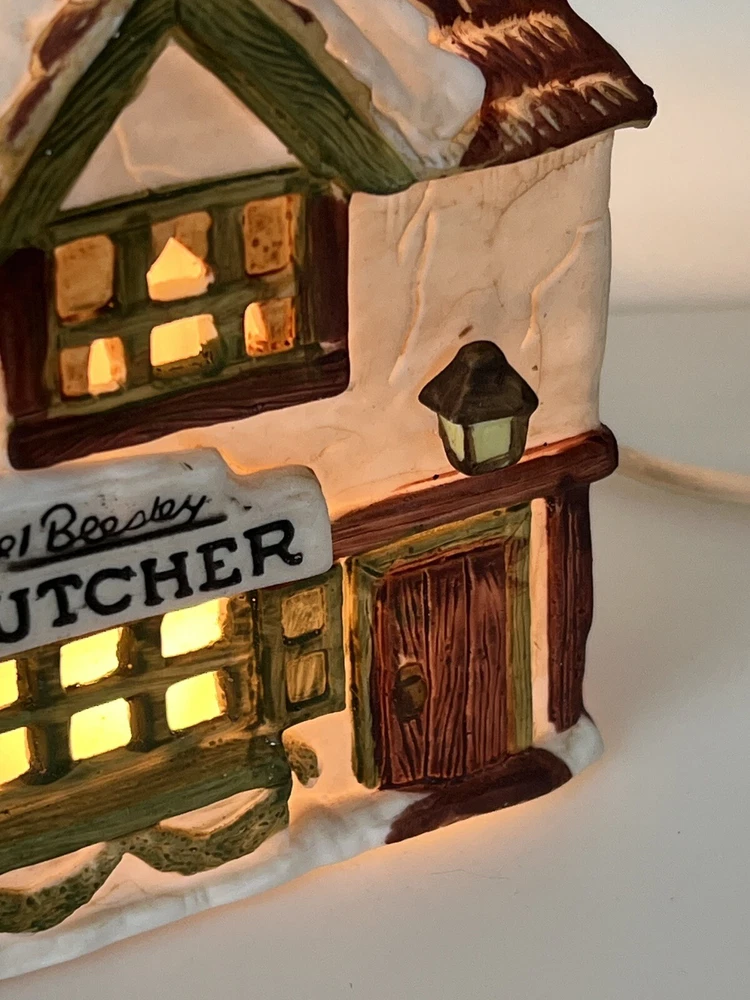 This is a Dept 56 Shops of Dickens Village Heritage Beesley Butcher figurine from 1984. It is a small, illuminated Victorian-style porcelain building featuring Beesley Butcher in a whimsical Christmas Village theme. The hand-painted piece has a 3D effect, multicolor finish, and measures 5" in length, 4" in width, and 6" in height. It is suitable for seasonal display in any room and is part of the Dickens Village collection. 1984 !!! Excellent condition!! comes with all original packaging including cord & light .