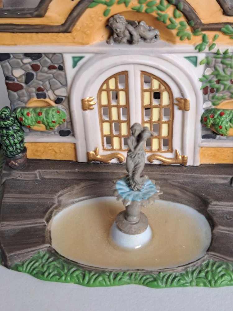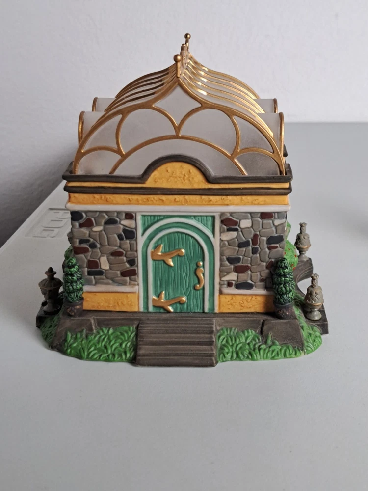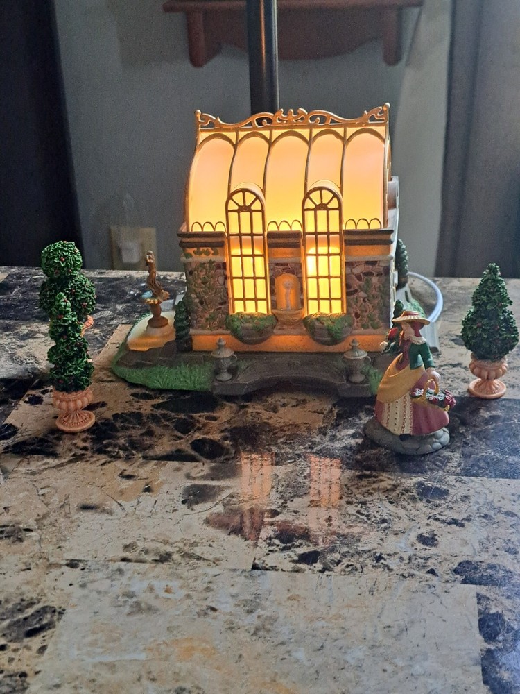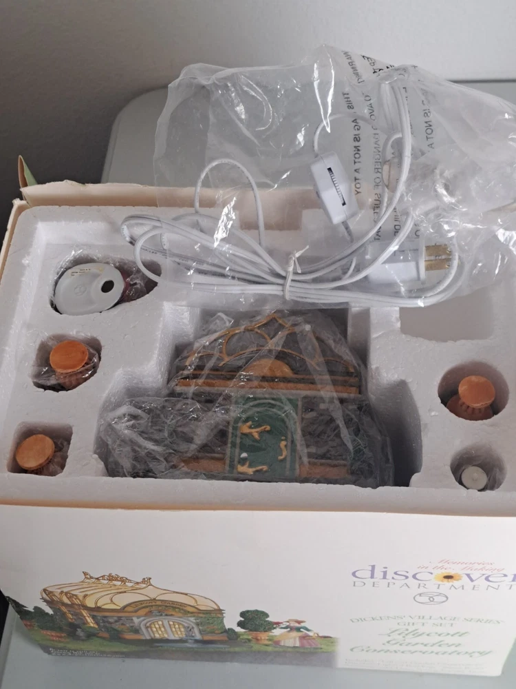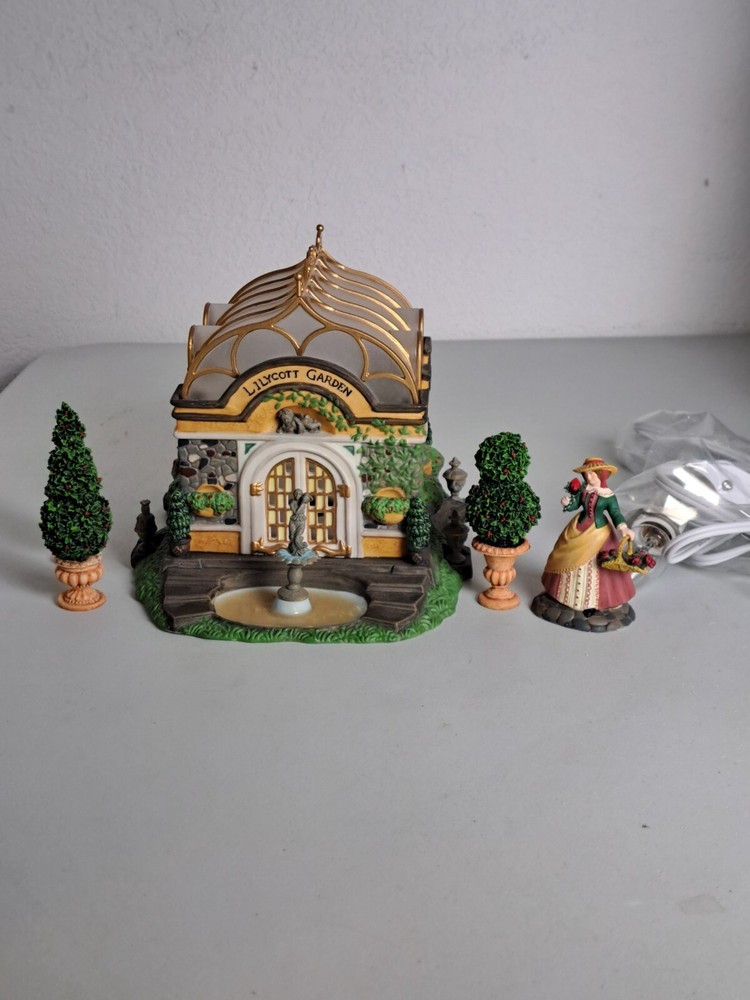 Dept. 56 Dickens Village Series Set LILYCOTT GARDEN CONSERVATORY is in Nice Pre-Owned Complete Condition. 2 Urn Pots On Building Side Have Been Reglued. Brand New Cord w/ Light Bulb. Box Flap Has Tear On Back Side and Taped. VERY PRETTY PIECE!!