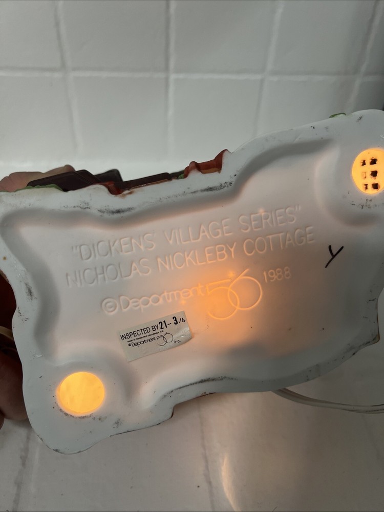 The Department 56 Dickens Village Nicholas Nickleby Cottage is a multicolored porcelain Christmas village piece from 1988. Part of the Dickens Village collection, this original and retired cottage features a quaint design inspired by the classic tale of Nicholas Nickleby. It does not come in its original box and was retired in 1991, adding to its collectible value for adults who enjoy creating holiday village displays.
