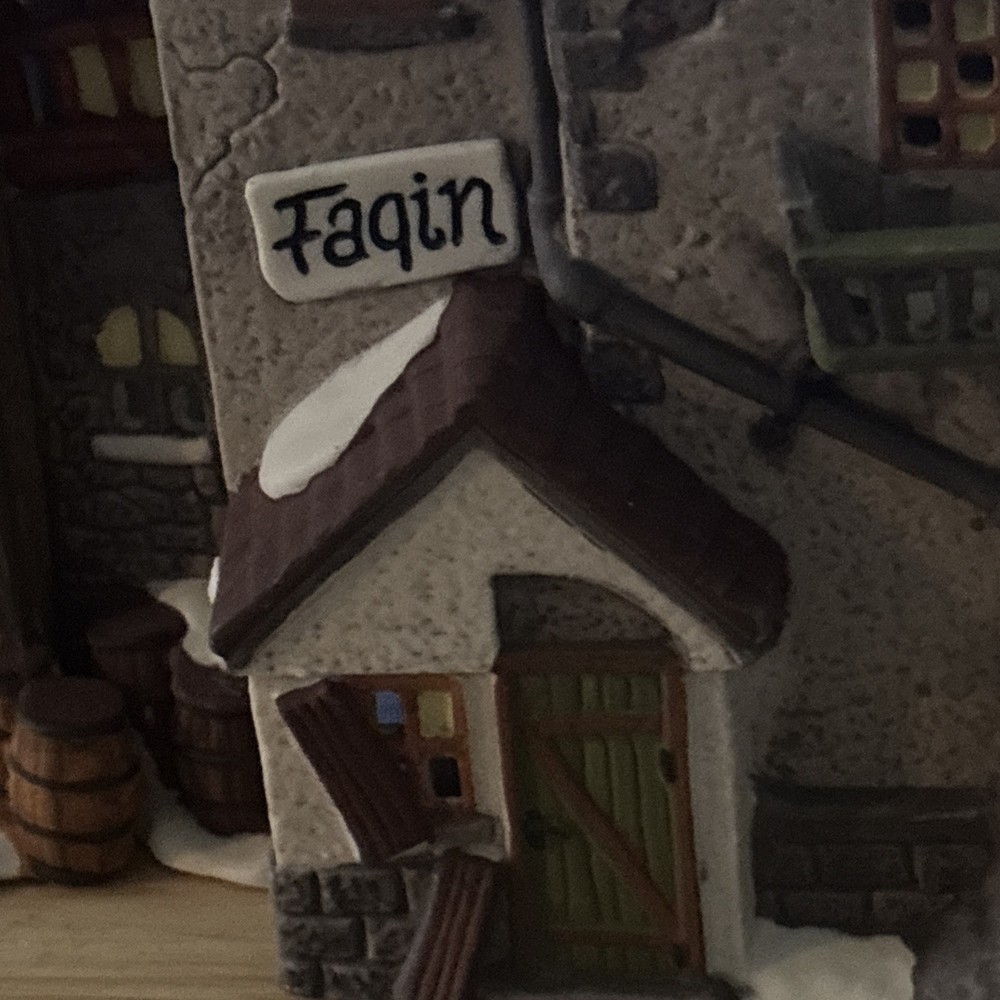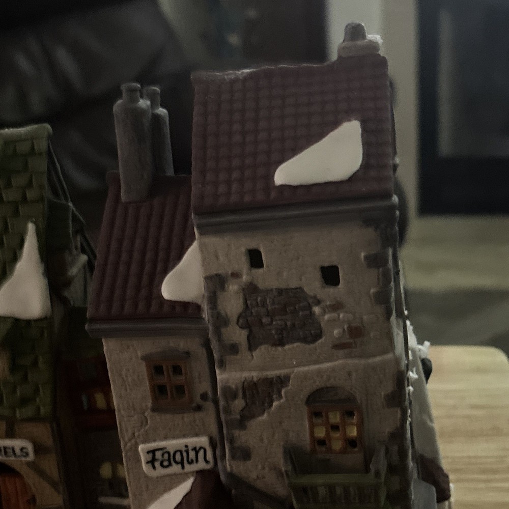 The product is a vintage Department 56 Dickens Village Series house from 1990, titled "Oliver Twist 'Fagin's Hideaway'. This asymmetrical, Victorian-style ceramic and porcelain building is hand-painted and illuminated, perfect for Christmas decor. The medium-sized piece features intricate details and a textured matte finish, making it suitable for display on a window, floor, or furniture in any room. Packaged in a box, this collectible item is a part of the Dickens Village collection, adding a touch of nostalgia and seasonal charm to any holiday display.