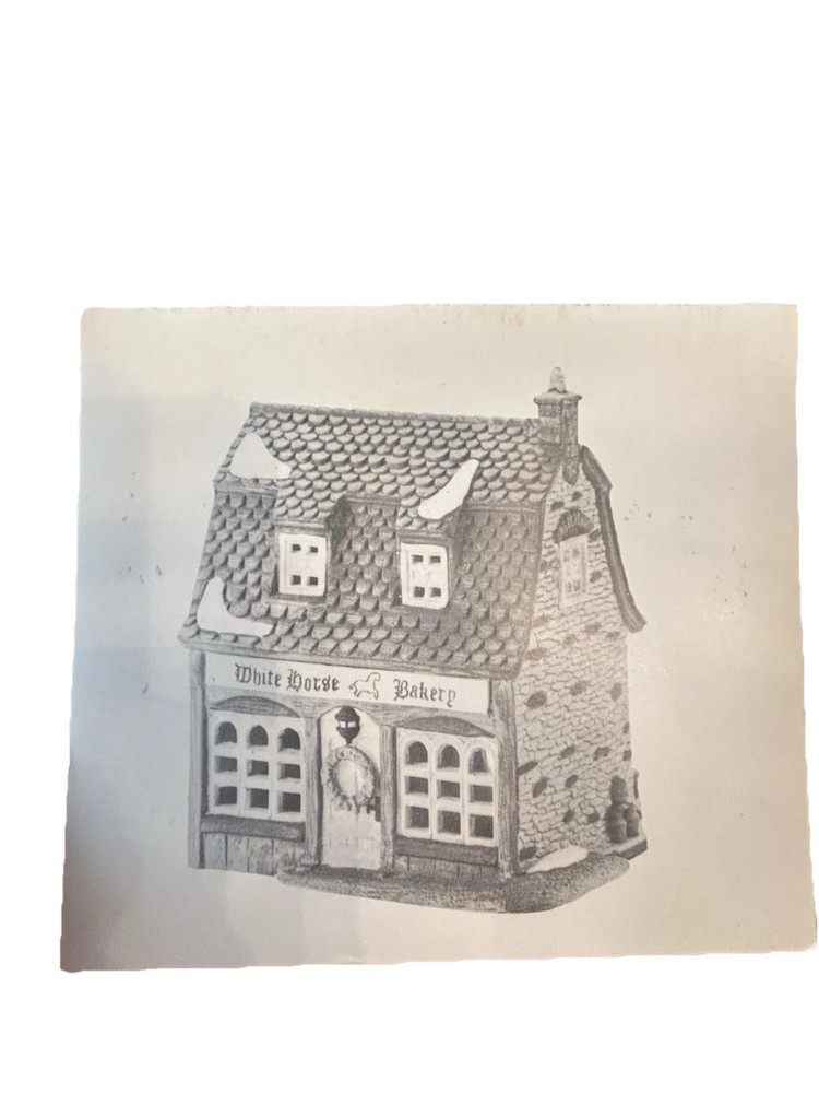 This is a medium-sized porcelain Christmas village house from the Dept 56 Dickens Village Series, featuring the White Horse Bakery. It was manufactured in 1988 and is an original piece. The house is hand-painted and comes in a box, but does not come with a light. The bakery is part of a collection of Christmas Carol character family buildings, and its style is Victorian. It weighs 2 lbs and is suitable for any room. The house is retired and boxed, making it a great addition to any holiday or seasonal collection.