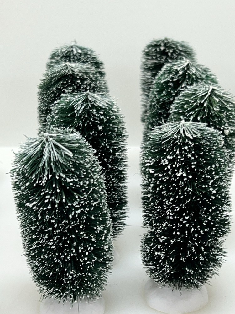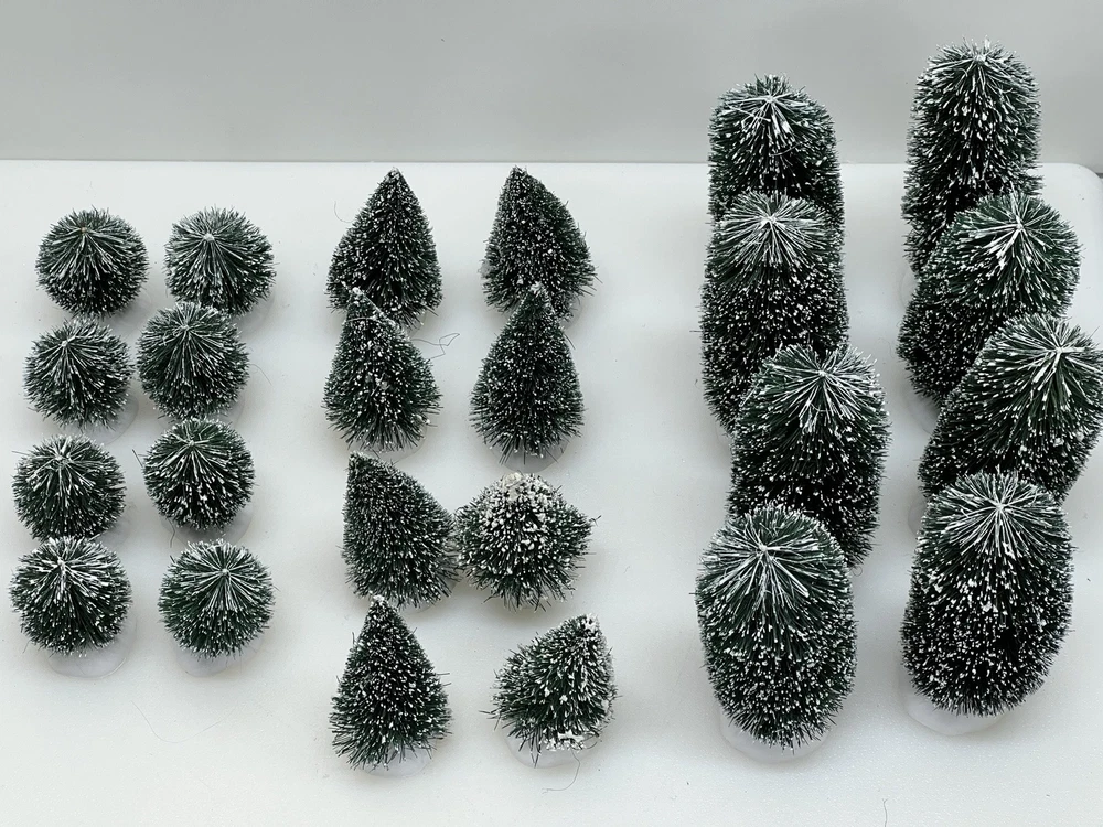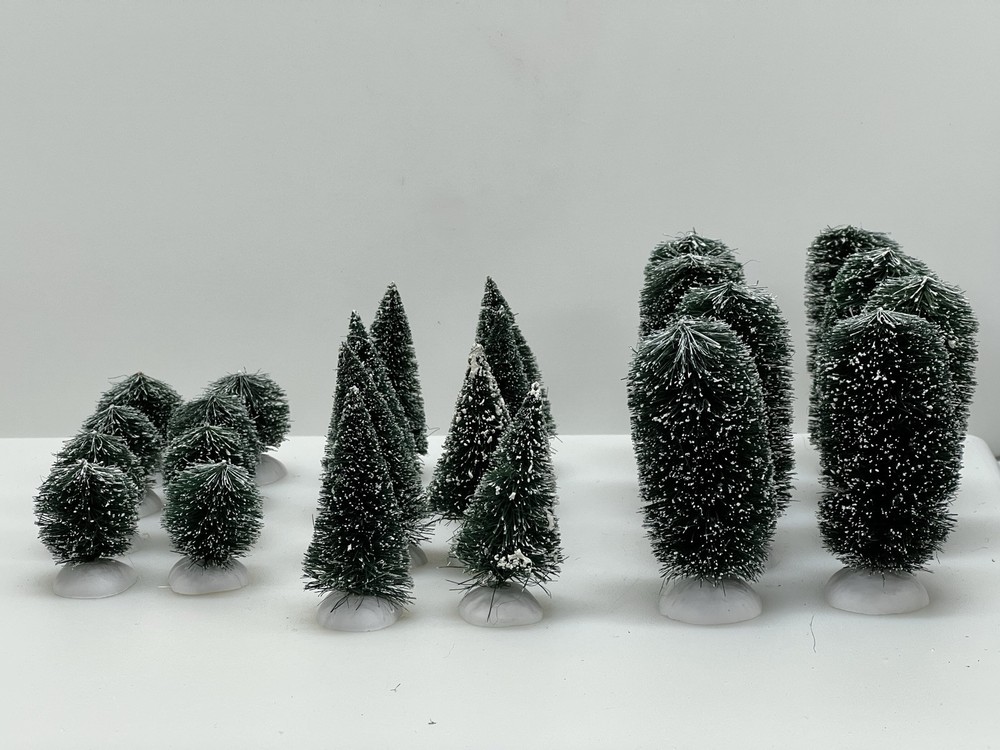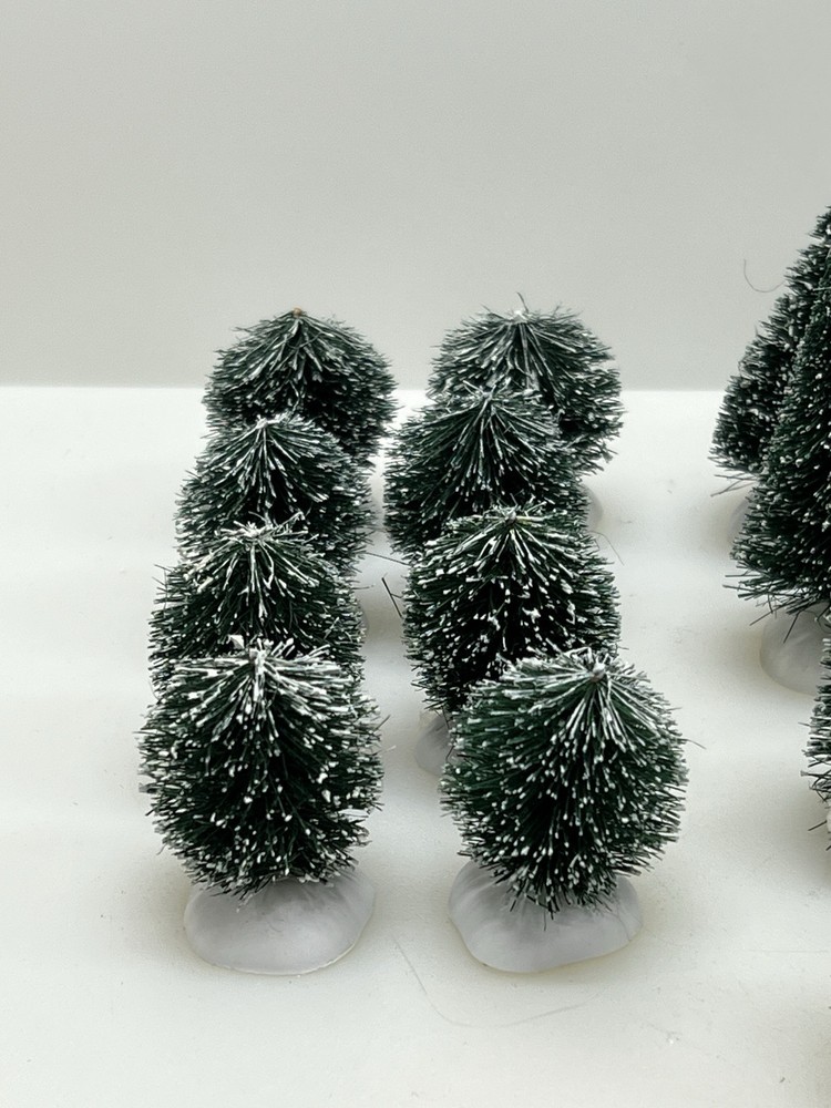This Department 56 "Frosted Shrubbery" set of 24 village accessories is suitable for Christmas village displays. The small asymmetrical evergreen shrubs feature a frosted finish and are made of mixed materials. Manufactured in 1999, they are part of the seasonal Village Accessories collection, perfect for late 20th-century village scenes. Perfect pristine condition