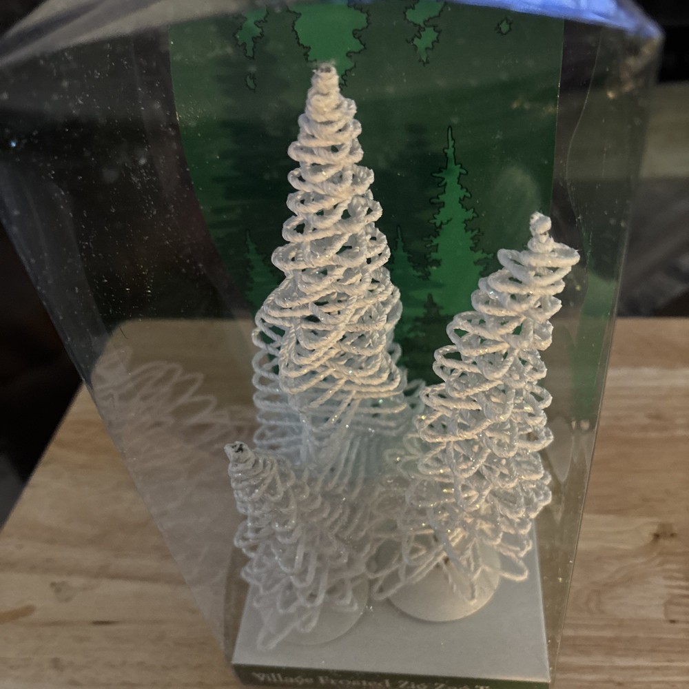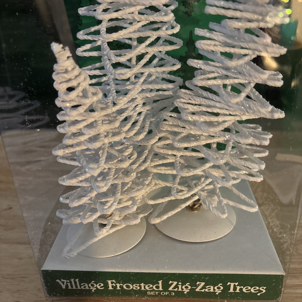 The Dept 56 Village Frosted Zig-Zag Trees Accessories Set of 3 in White #5249-3 is a traditional Christmas village accessory with an asymmetrical zig-zag pattern. These medium-sized trees are perfect for decorating windows, floors, or furniture in any room. Made by Department 56, the set includes glitter accents, comes boxed and is part of the seasonal collection. The frosted finish adds a touch of elegance to these indoor decorations, making them a charming addition to your holiday decor.