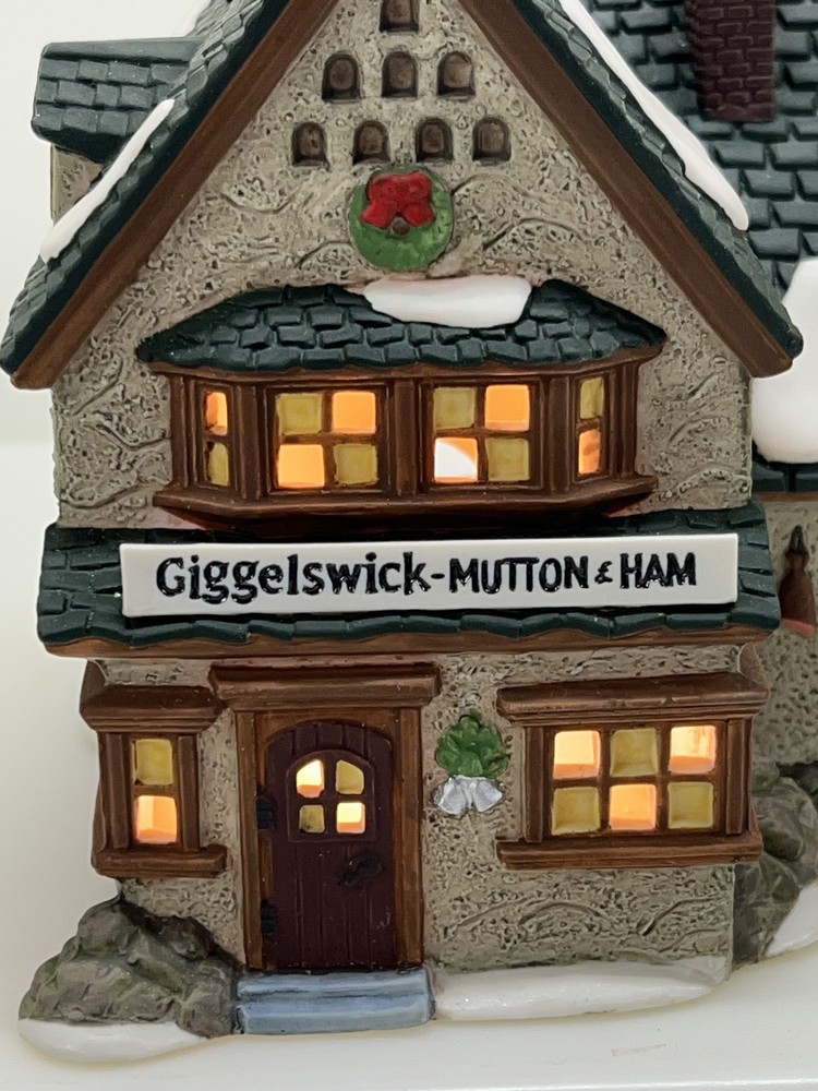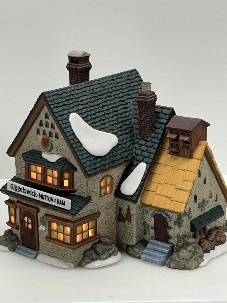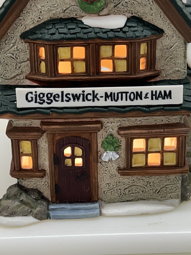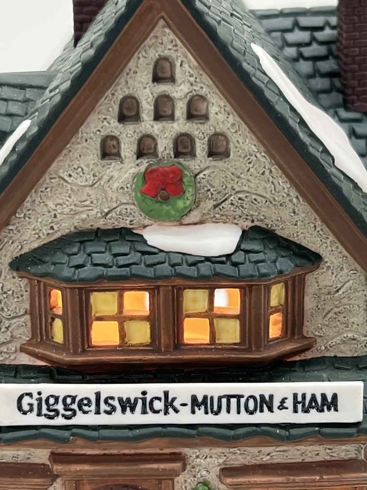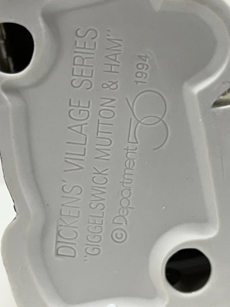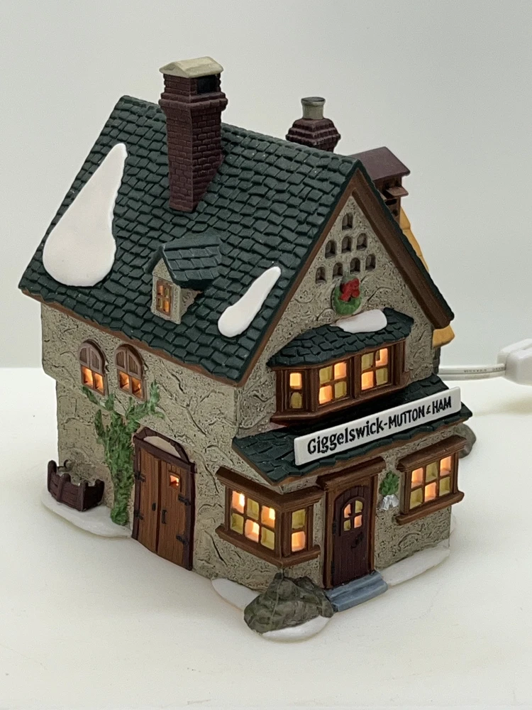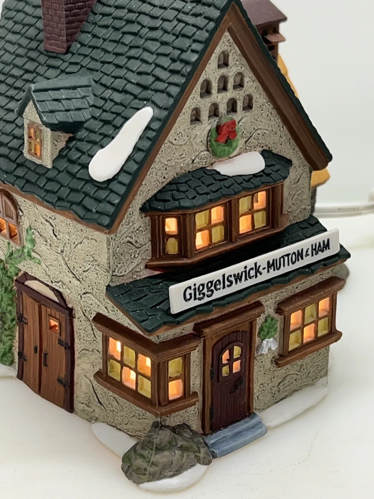 Dept 56 "Giggleswick-Mutton & Ham" is a medium-sized Victorian style ceramic Christmas village house from the Dickens Village Collection. This retired piece features a multicolor painted finish, measures 7.25 inches in length, 7 inches in height, and 6 inches in width. It is suitable for a seasonal village display and comes boxed. The item is part of the Department 56 brand and is ideal for a fantasy-themed, seasonal, or novelty Christmas village setup. Absolutely perfect condition with all original packaging including light & cord