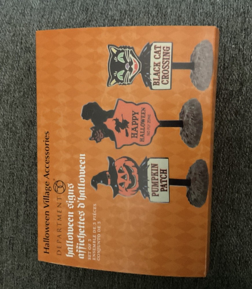 The Department 56 Halloween Village Halloween Signs Set of 3 is a new in box collectible item perfect for Halloween enthusiasts. This set includes three decorative signs that can be used to add a spooky touch to your Halloween village display. Manufactured in 2022, these retired signs feature a village-themed design that will enhance any Halloween decor. The boxed packaging ensures that the signs are well-protected and ready to be displayed for years to come.