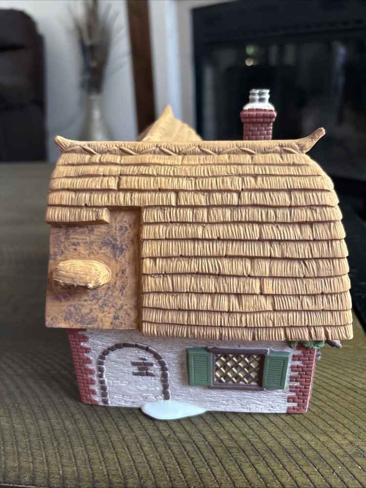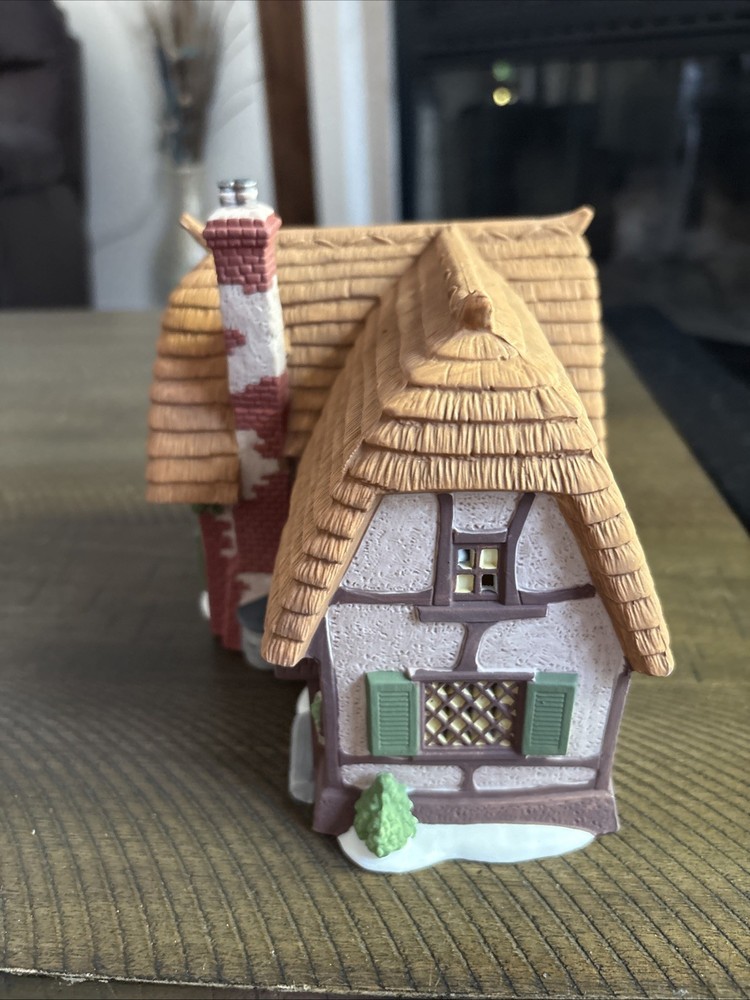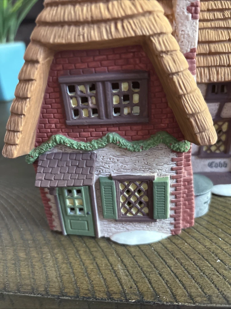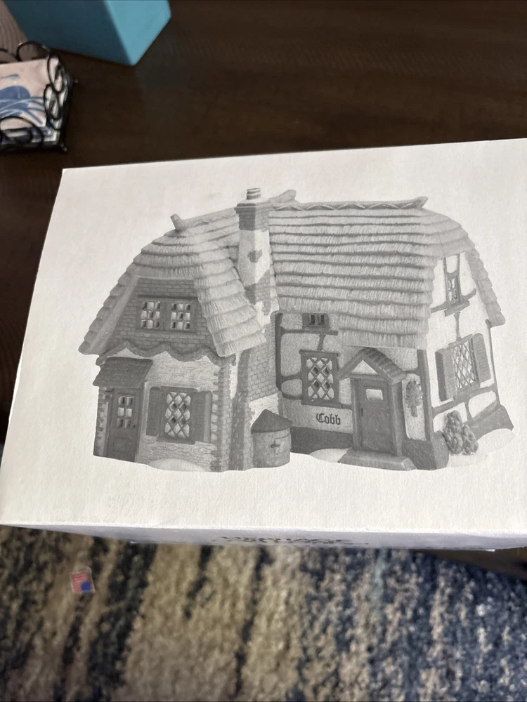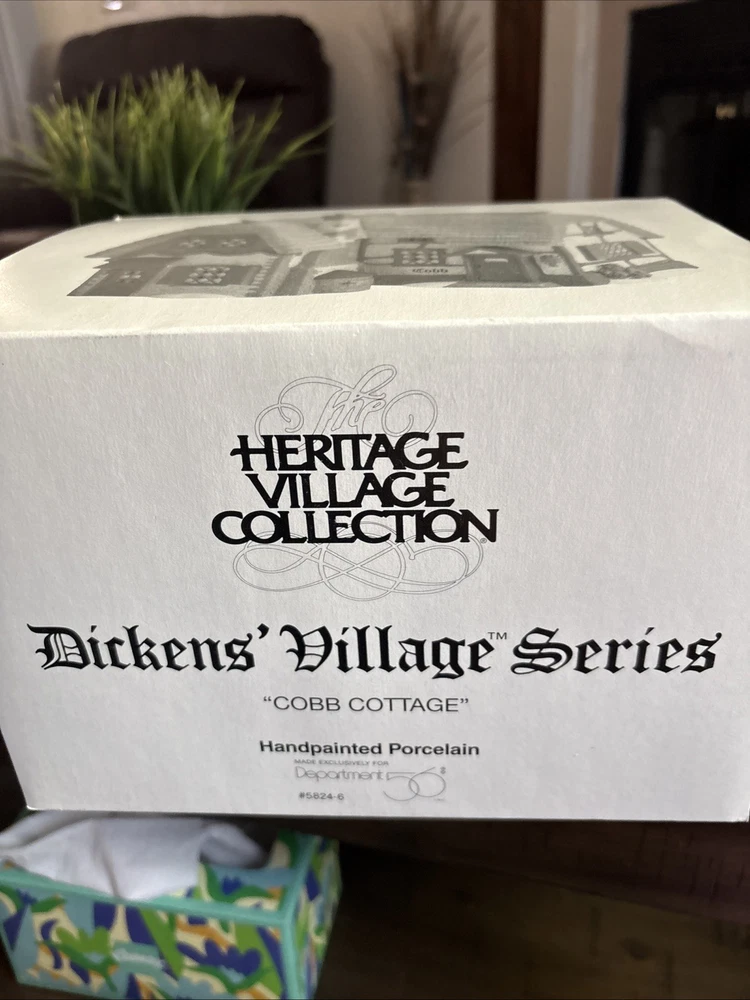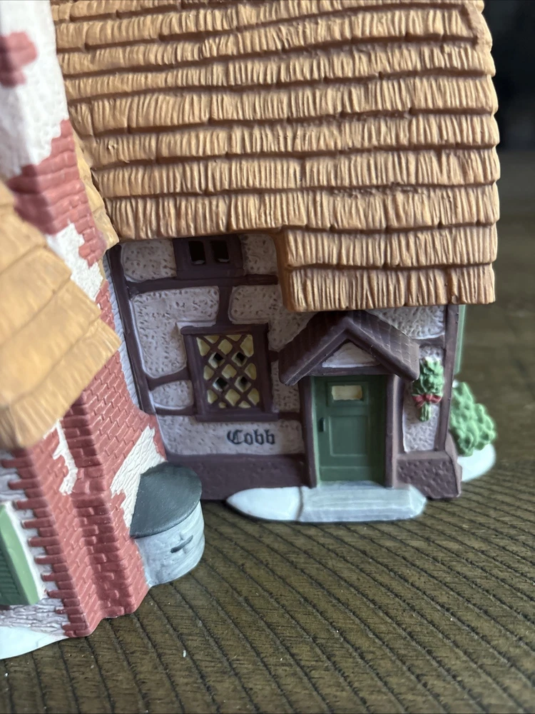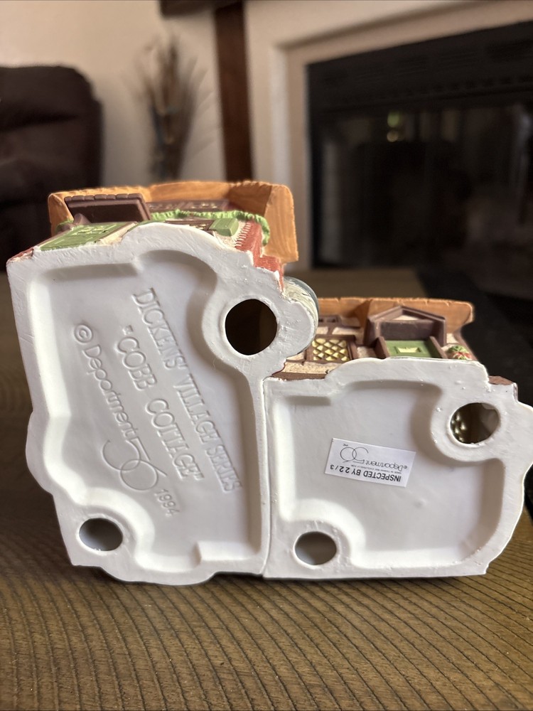 The Dept 56 Heritage Dickens Village Series "Cobb Cottage" 5824-6 from 1994 is a vintage collectible item suitable for Christmas decor. Made of ceramic and porcelain, this medium-sized cottage is part of the Dickens Village collection, featuring a Victorian-era design. It can be illuminated, hand-painted, and displayed on a window, floor, or furniture. This classic piece comes in its original box and is a perfect addition to any holiday or seasonal display.