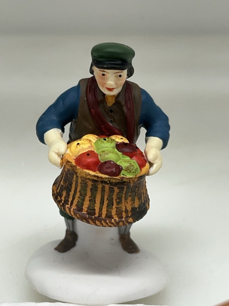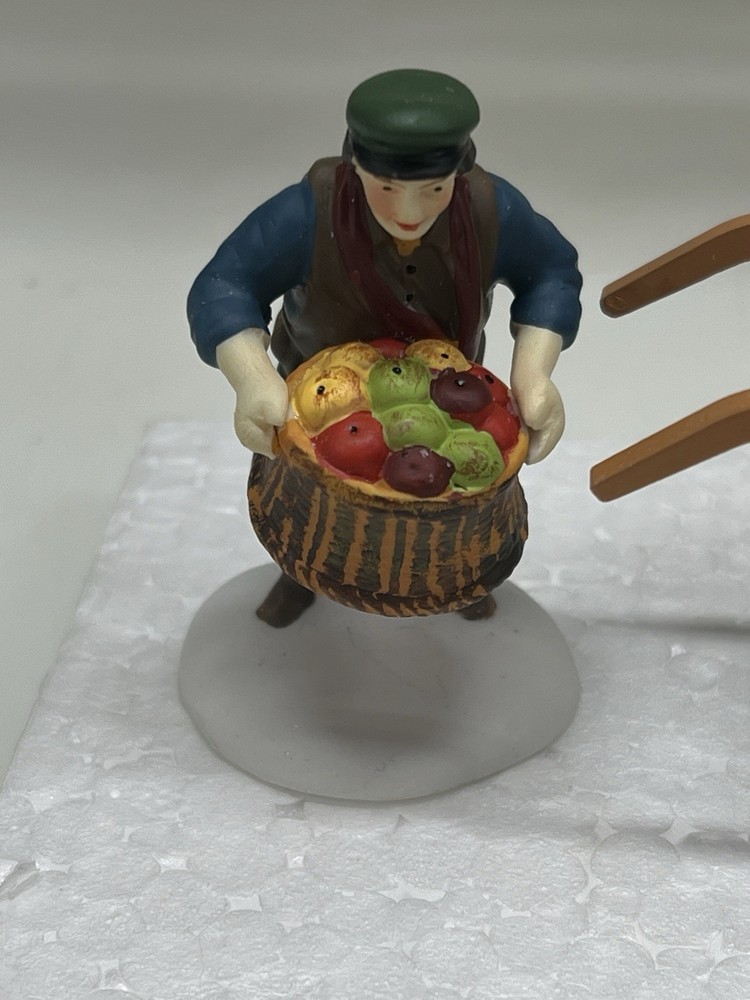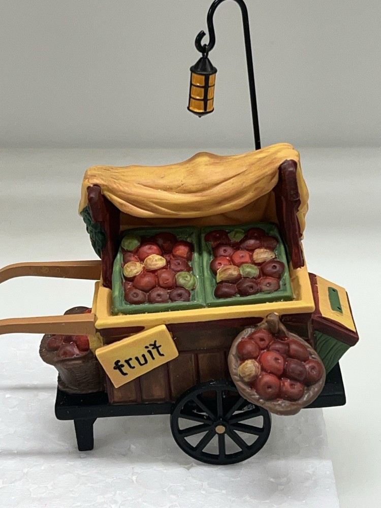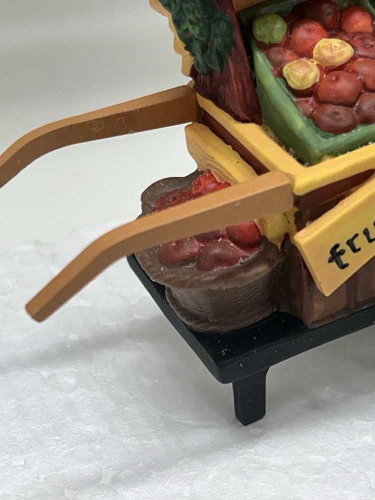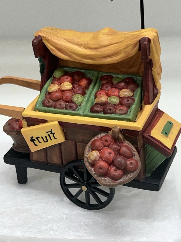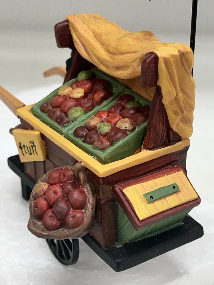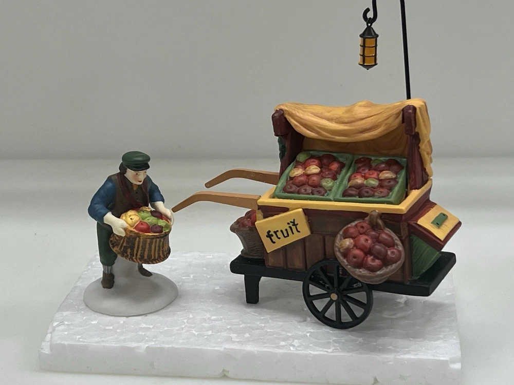 The Dept 56 Heritage Village Collection Chelsea Market Fruit Monger & Cart Set of 2 is a beautifully hand-painted porcelain figurine set from the Dickens Village collection. Featuring a charming fruit market scene, this retired piece is perfect for all occasions and comes boxed for easy display. The intricate painting and attention to detail make this a delightful addition to any holiday or seasonal village display. Ideal for collectors or anyone looking to add a touch of nostalgia to their home decor.