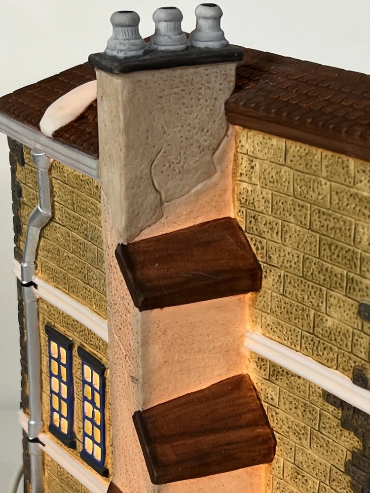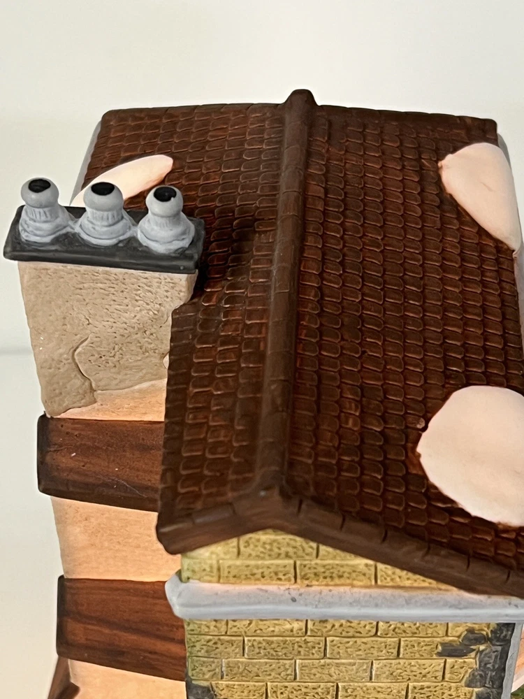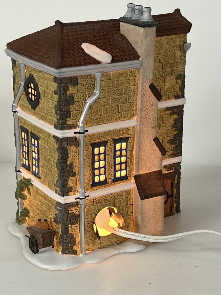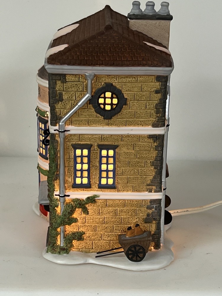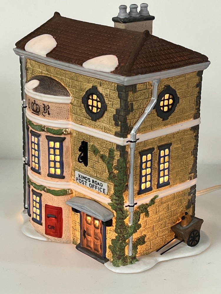 This is a Department 56 Kings Road Post Office from the Dickens Village series. It is a medium-sized, asymmetrical ceramic and porcelain Christmas village house that is hand-painted and illuminated. The house is part of the traditional Dickens Village collection and features a whimsical design. It measures 6 inches in length, 8 inches in height, and 4 inches in width. The item is suitable for seasonal display and is a retired piece from 1992. No original box, comes with cord & light