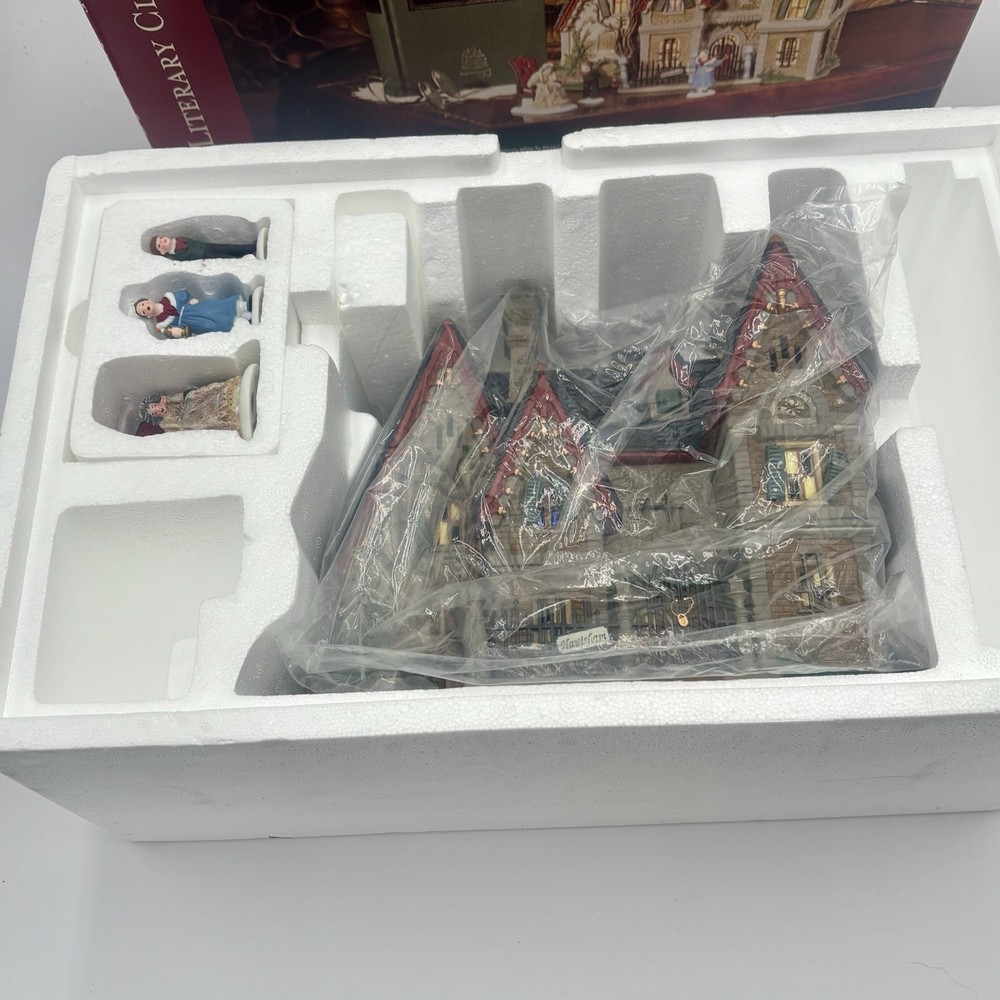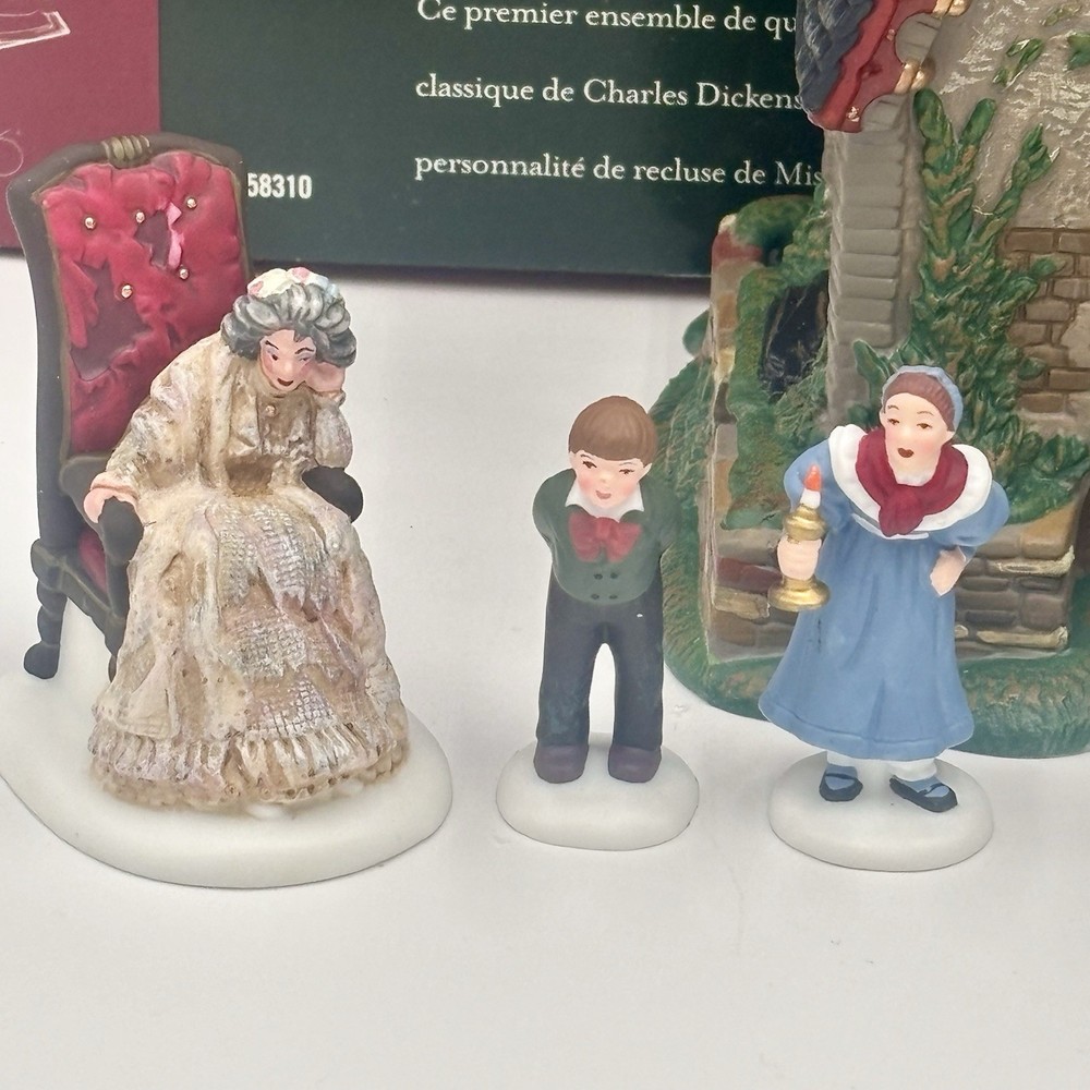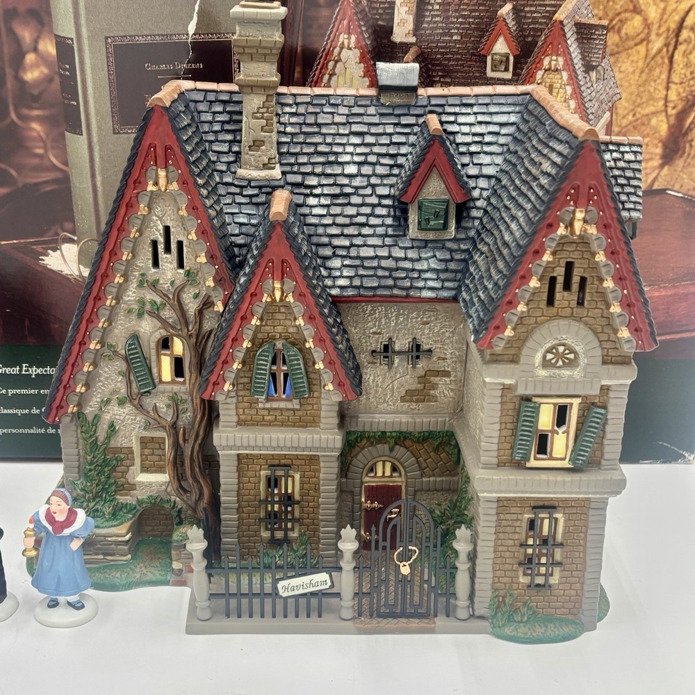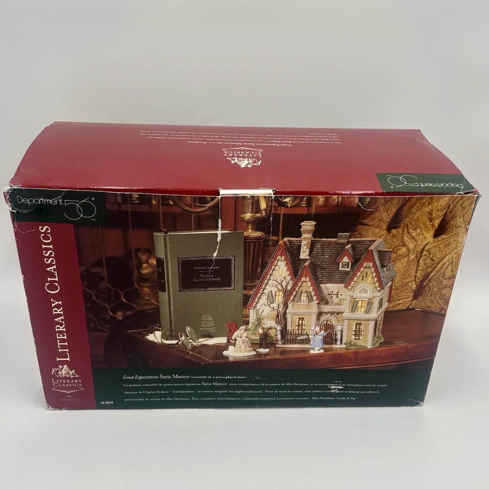 The book is missing from the set. The Department 56 Literary Classics Great Expectations Satis Manor Charles Dickens 58310 is a medium-sized, asymmetrical ceramic and porcelain Christmas village piece from 1998. Hand painted with a Victorian style, this collectible features characters from Charles Dickens' famous novel. Part of the Dickens Village collection by Department 56, this retired piece comes boxed and weighs 7 lbs. Perfect for any room during the holiday season, this multicolor piece celebrates the historical figure of Dickens and his literary works in a festive and nostalgic way.
