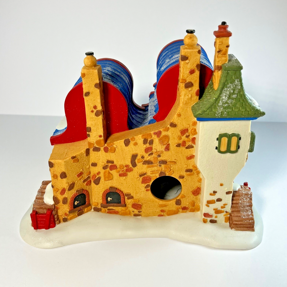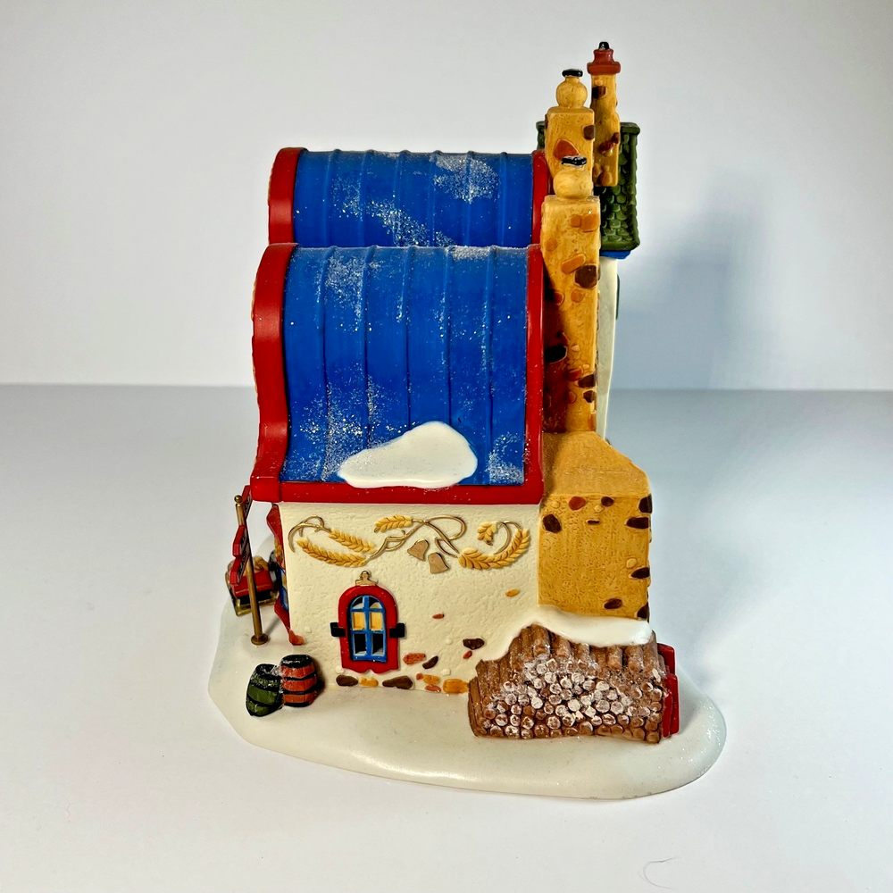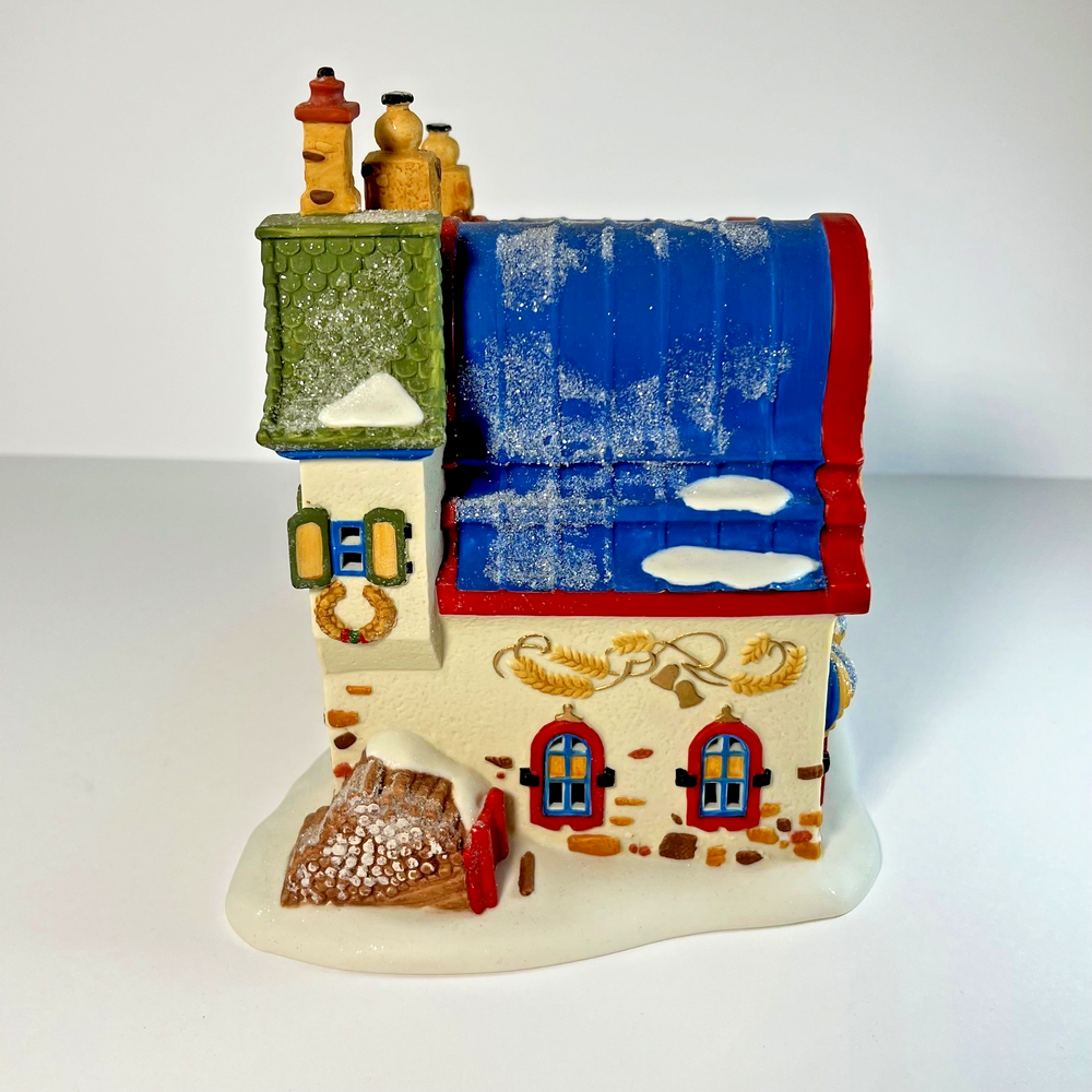 The Dept 56 North Pole Series Christmas Bread Bakers Shop is a small, asymmetrical Christmas village house from 1996. This hand-painted, illuminated building features a multicolor snow pattern and a baker character. Part of the North Pole Series collection by Department 56, this porcelain and ceramic piece is suitable for indoor display in any room during the holiday season. It comes with a light cord and original box, making it a charming addition to any Christmas decor.