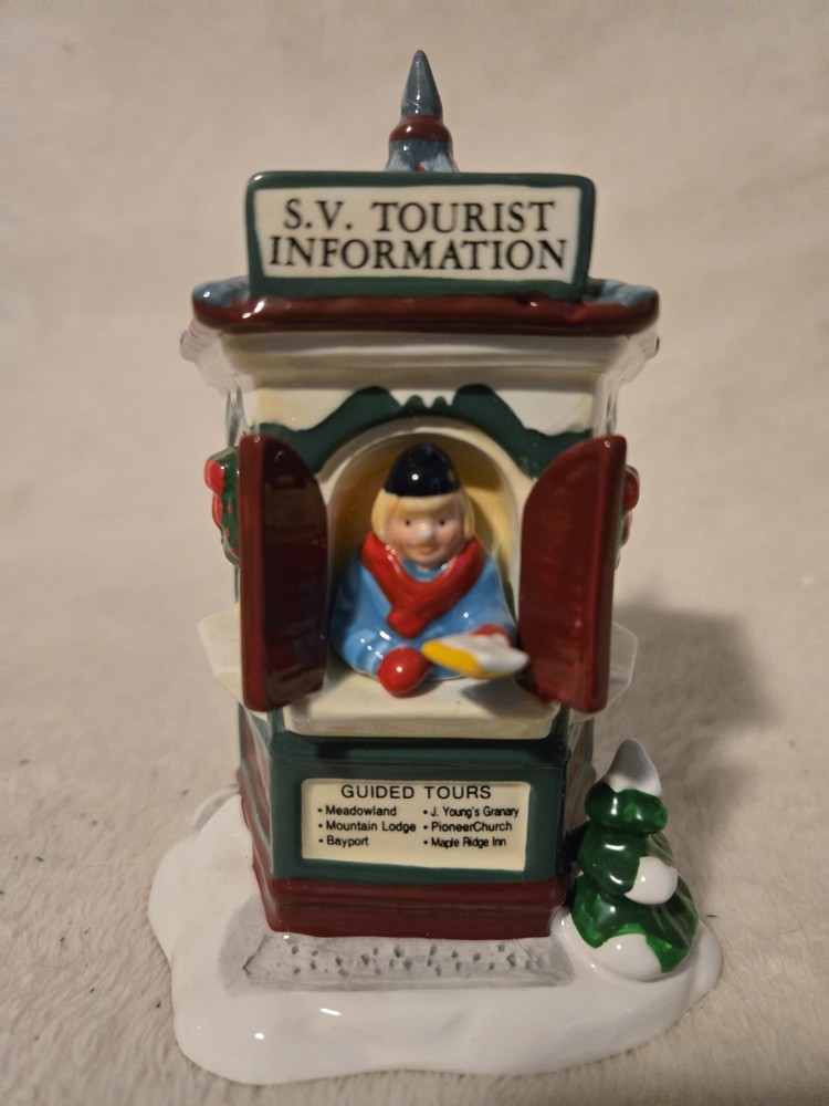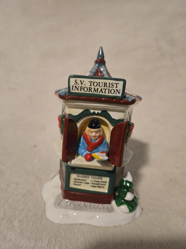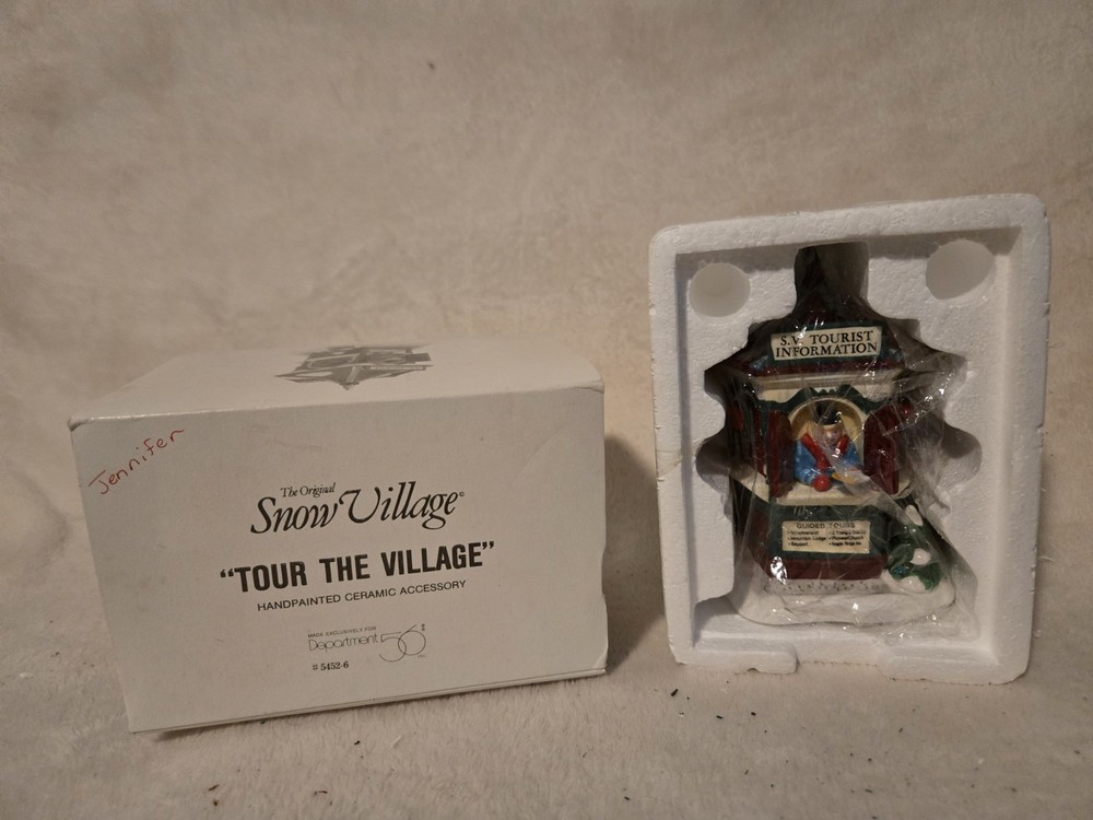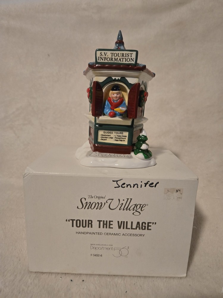 The Dept 56 Original Snow Village "Tour The Village" #5452-6 is a small, hand-painted ceramic and porcelain Christmas village piece from the late 20th century. This traditional style piece features a pentagon shaped "Snow Village Tourist Information Booth" with a glossy finish and colorful details. It is part of the Snow Village collection by Department 56 and comes in its original box, making it a collectible item suitable for any room during Christmas season. This retired piece from 1997 offers a nostalgic touch to any holiday decor.