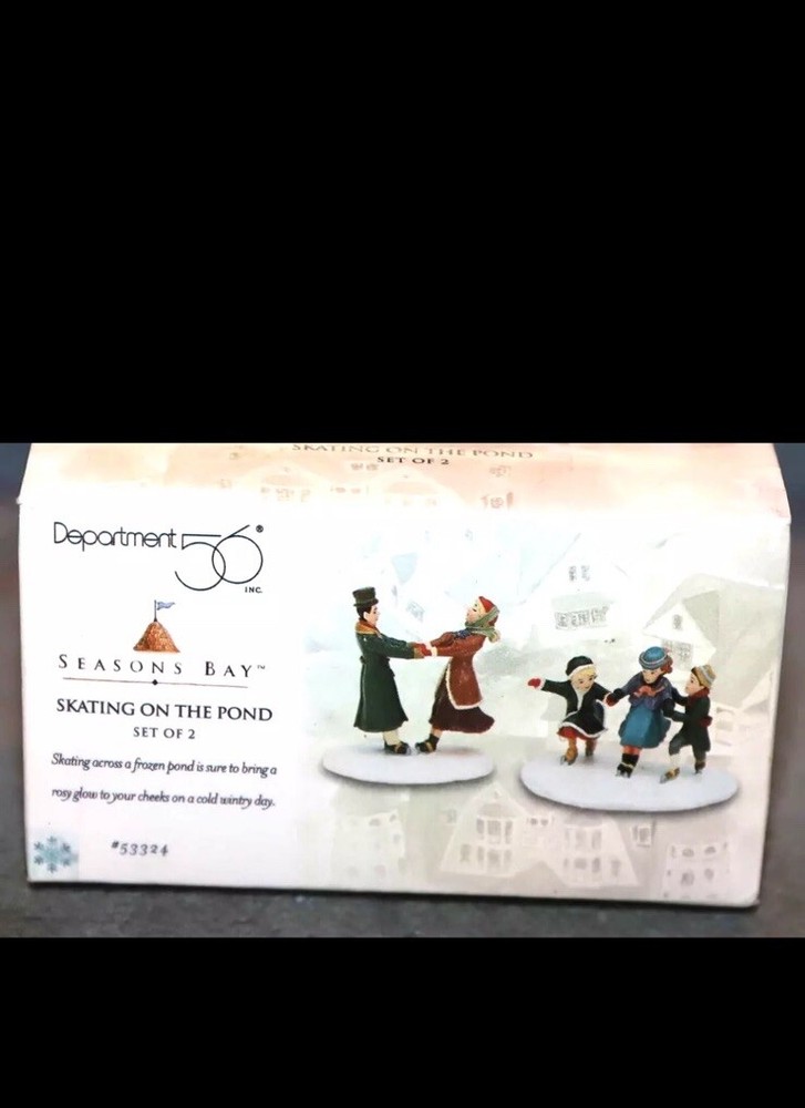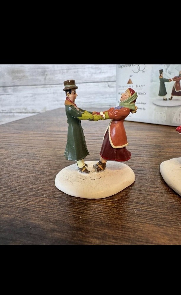 Add a touch of Victorian charm to your holiday decor with these delightful Department 56 Seasons Bay "Skating on the Pond" figurines. Crafted in 1998, this set of two small ceramic and porcelain figurines features skaters gliding merrily on a snowy pond, bringing the joy of the season to any room. These hand-painted figurines are boxed, retired, and perfect for adding to your existing Christmas village collection or starting a new one. They measure 2.25 inches in length, 1-2 inches in height, and 2 inches in width, making them suitable for any furniture surface. Celebrate the holidays with these traditional, seasonal figurines from the beloved Seasons Bay collection.