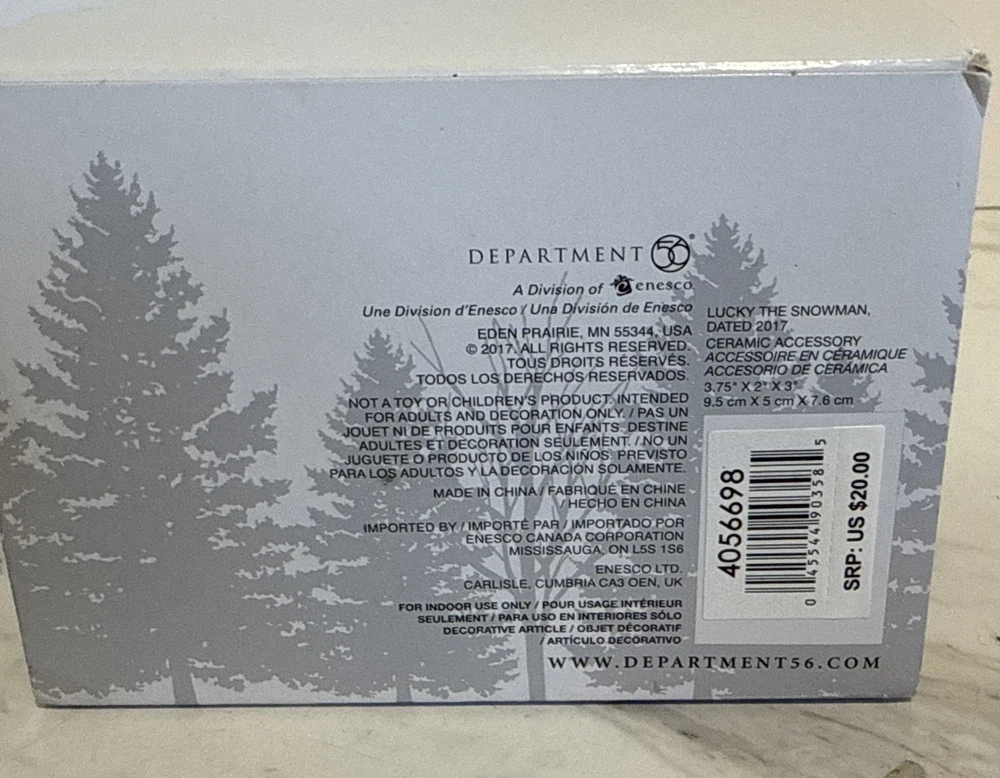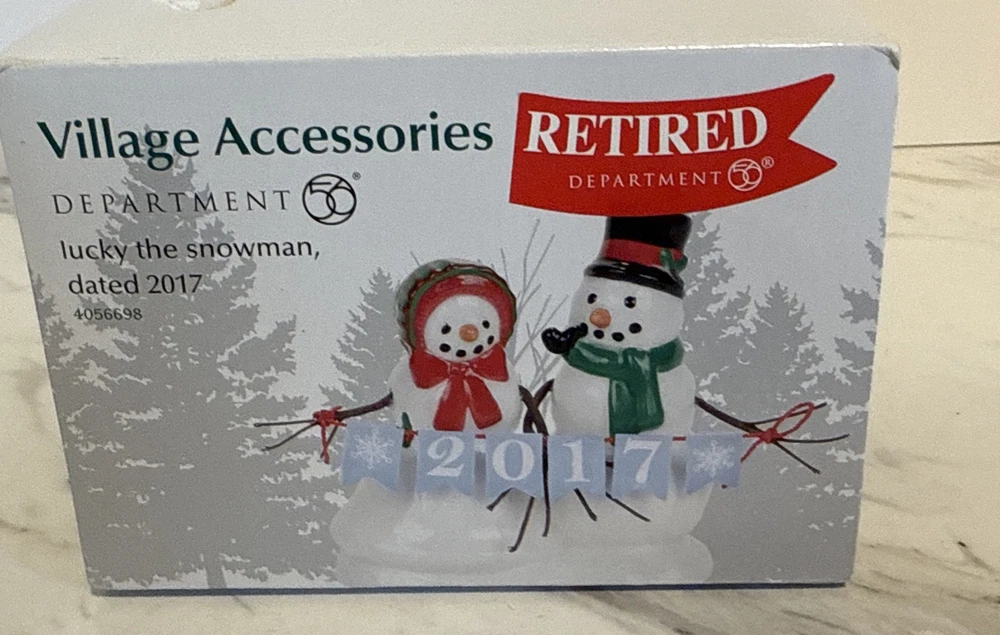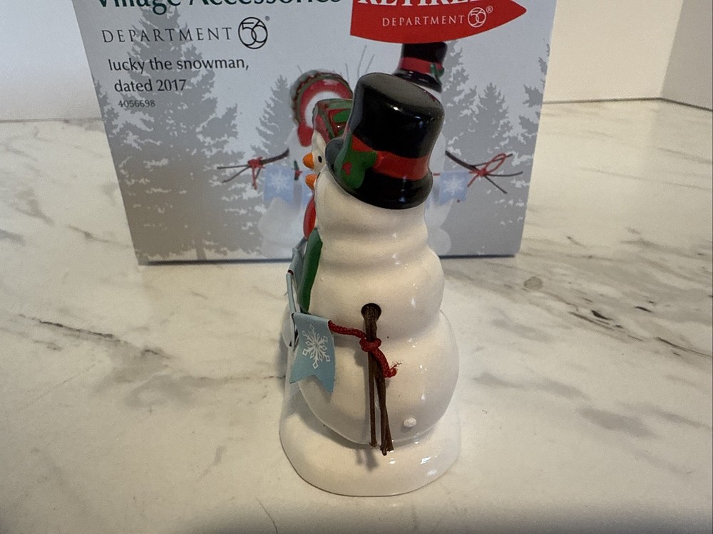 Dept 56 Snow Village Series Lucky The Snowman Dated 2017 Accessory Retired w/Box Pre-Owned in very good condition. See all photos. The box sleeve has a small dent on top. Thank you for looking and supporting my small business!