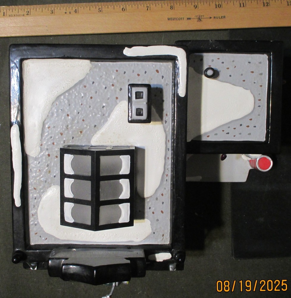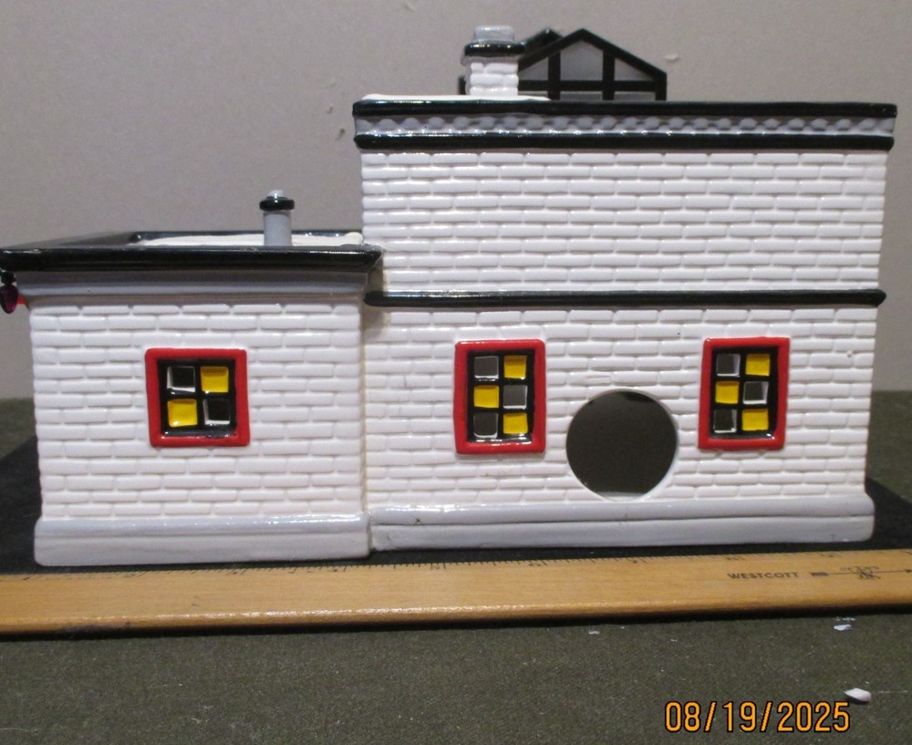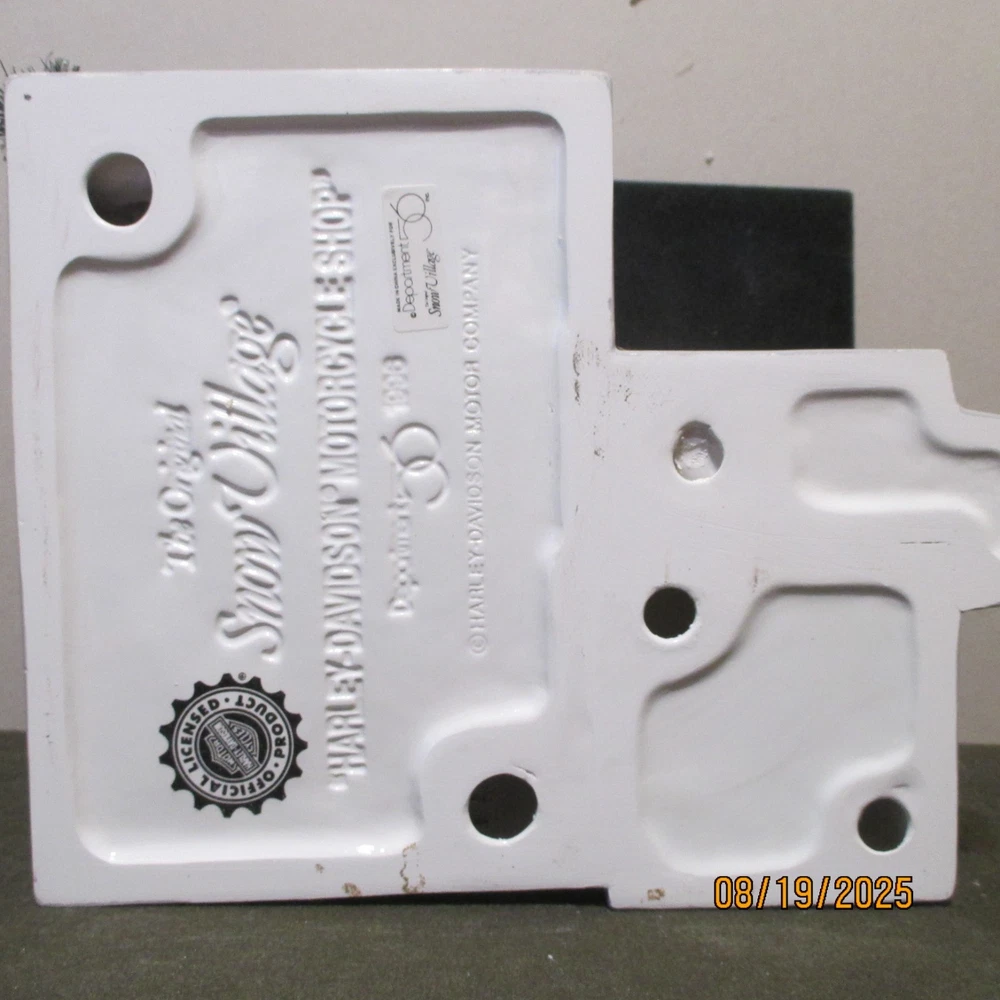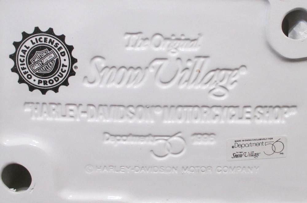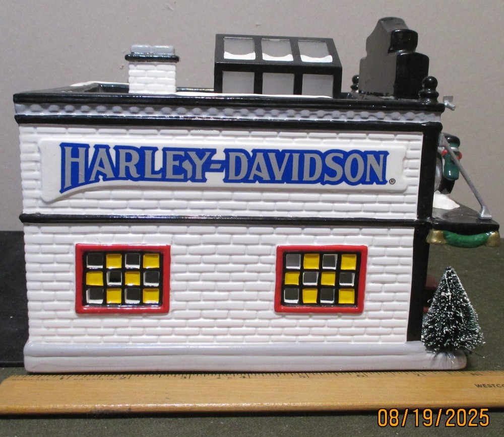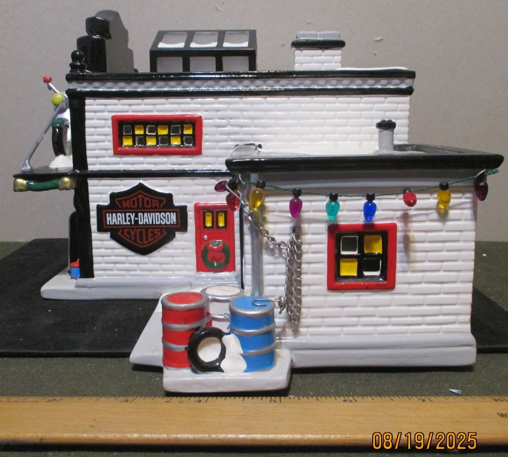 The Dept. 56 Snow Village Harley Davidson Motorcycle Shop # 54886 is a collectible porcelain and ceramic Christmas village piece from the Snow Village collection. This asymmetrical shaped building features a traditional style design with a multicolor glazed finish, perfect for indoor display during the holiday season. It is a retired piece that comes boxed, making it a unique addition to any Christmas village display. The shop is themed around motorcycles and is suitable for furniture as well as any room in the house.