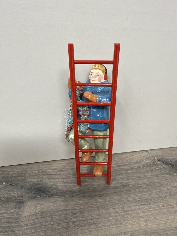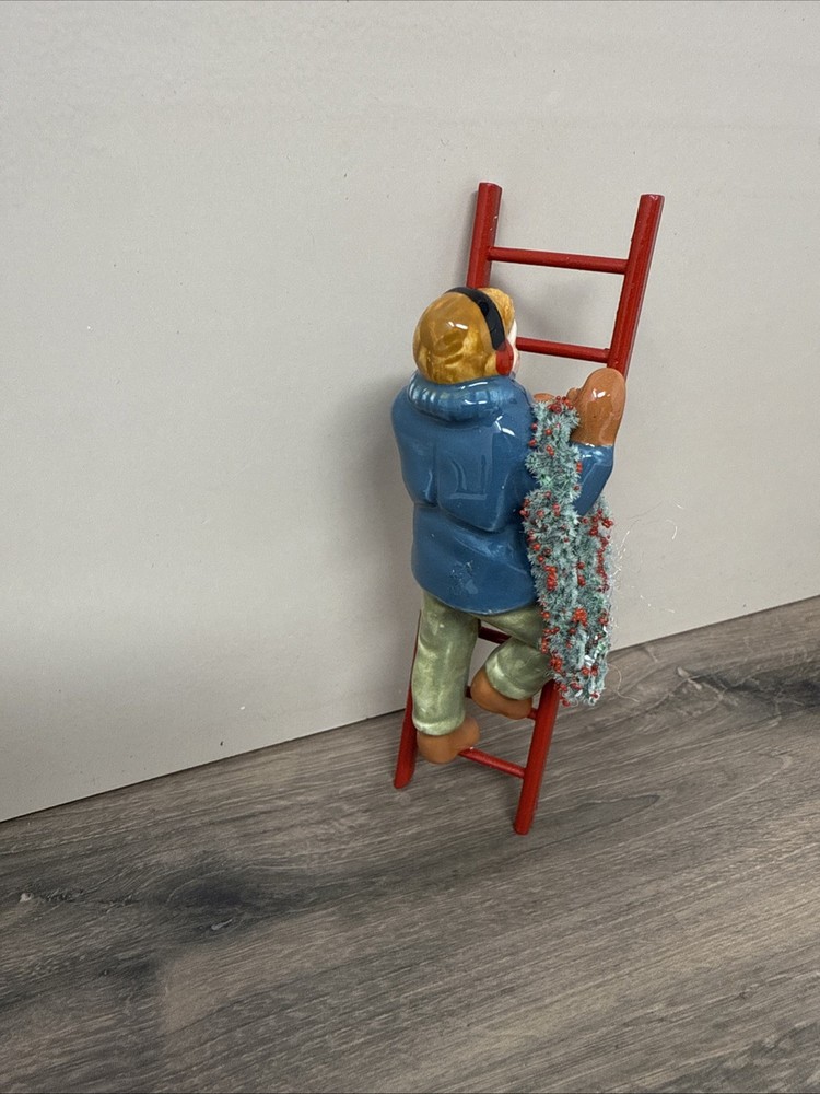 The Department 56 Snow Village Man on Ladder Hanging Garland 51160 is a ceramic and porcelain Christmas village piece that depicts a man hanging a garland from a ladder. This original collectible from the 1990s is part of the Snow Village collection and comes boxed, making it a perfect addition to any Christmas village display. The detailed craftsmanship and festive design make it a charming ornament for the holiday season.