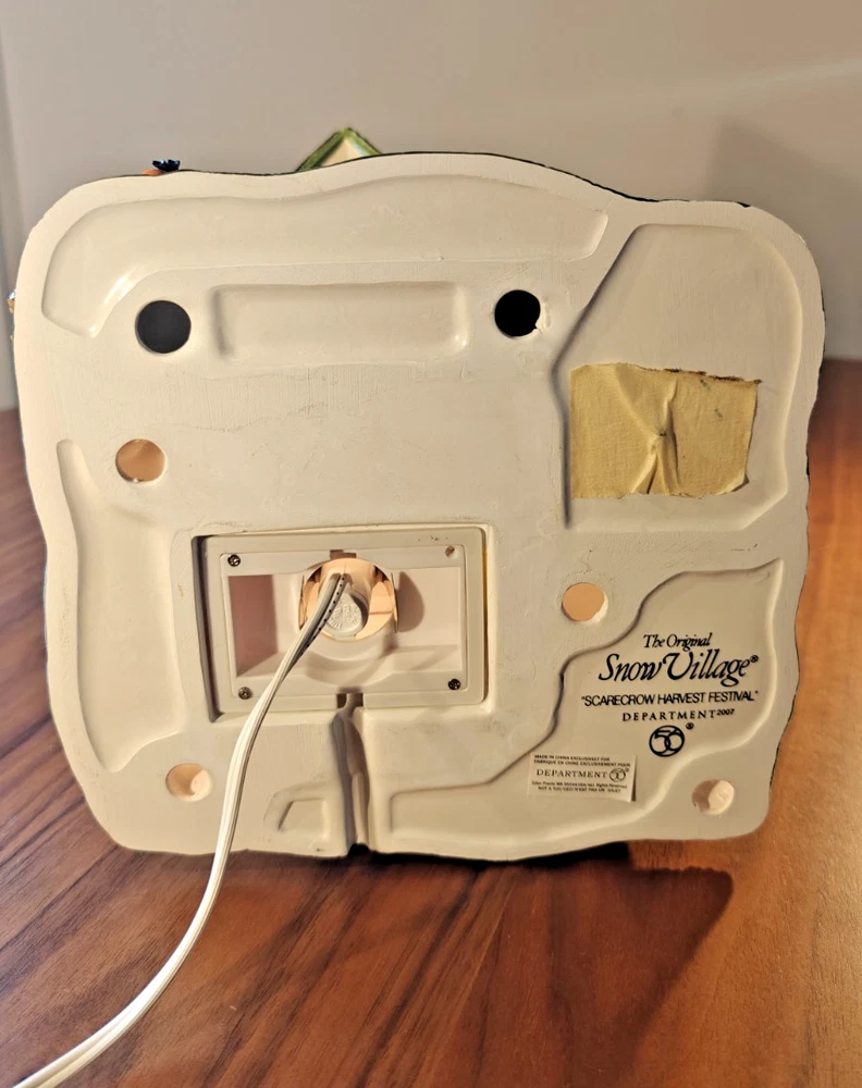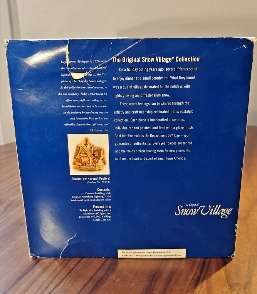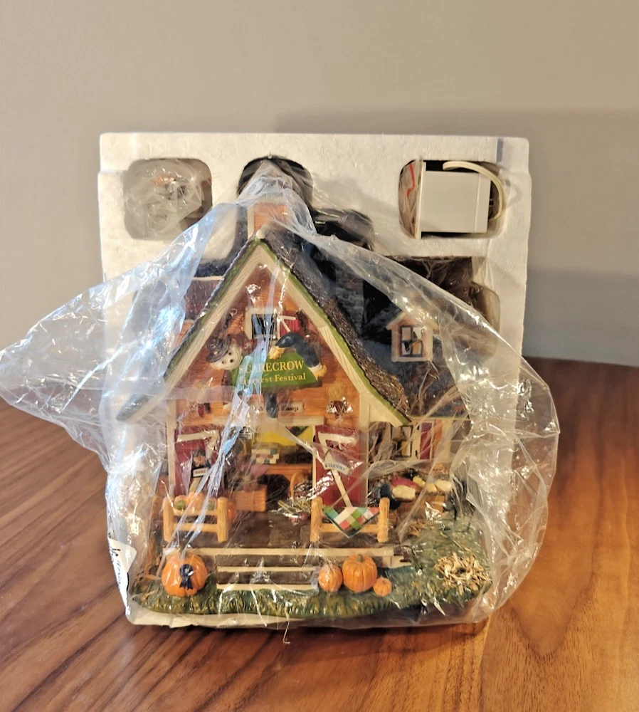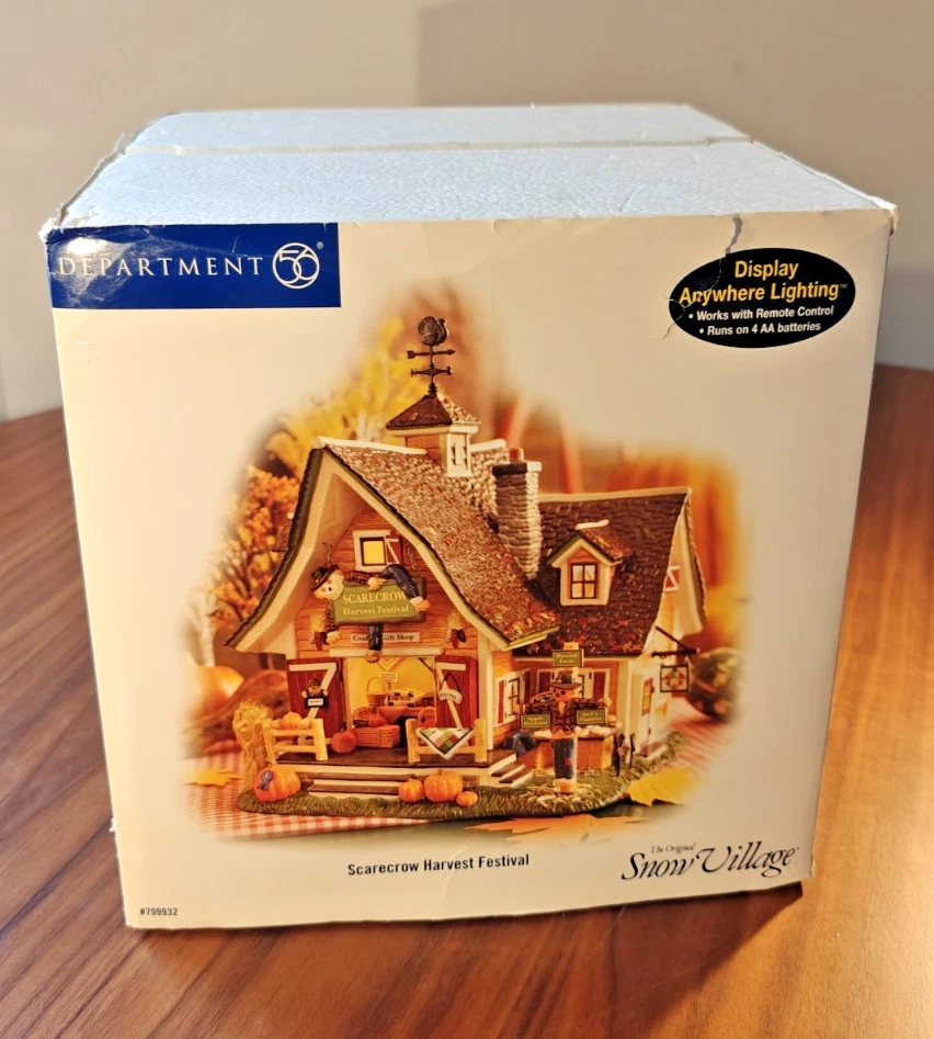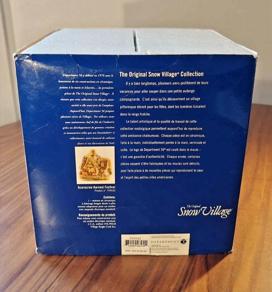 The Department 56 Snow Village Scarecrow Harvest Festival 2007 # 799932 is a collectible Halloween village house-shaped piece made of ceramic and porcelain. Part of the Snow Village collection, this original piece features a scarecrow character, perfect for adding a whimsical touch to your Halloween decor. Packaged in its original box, this village house is a charming addition to any Halloween display.